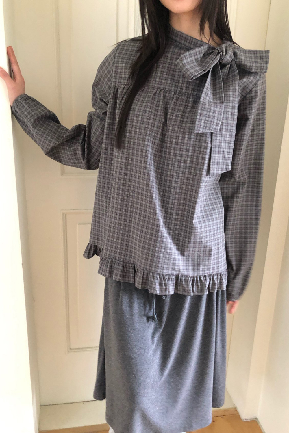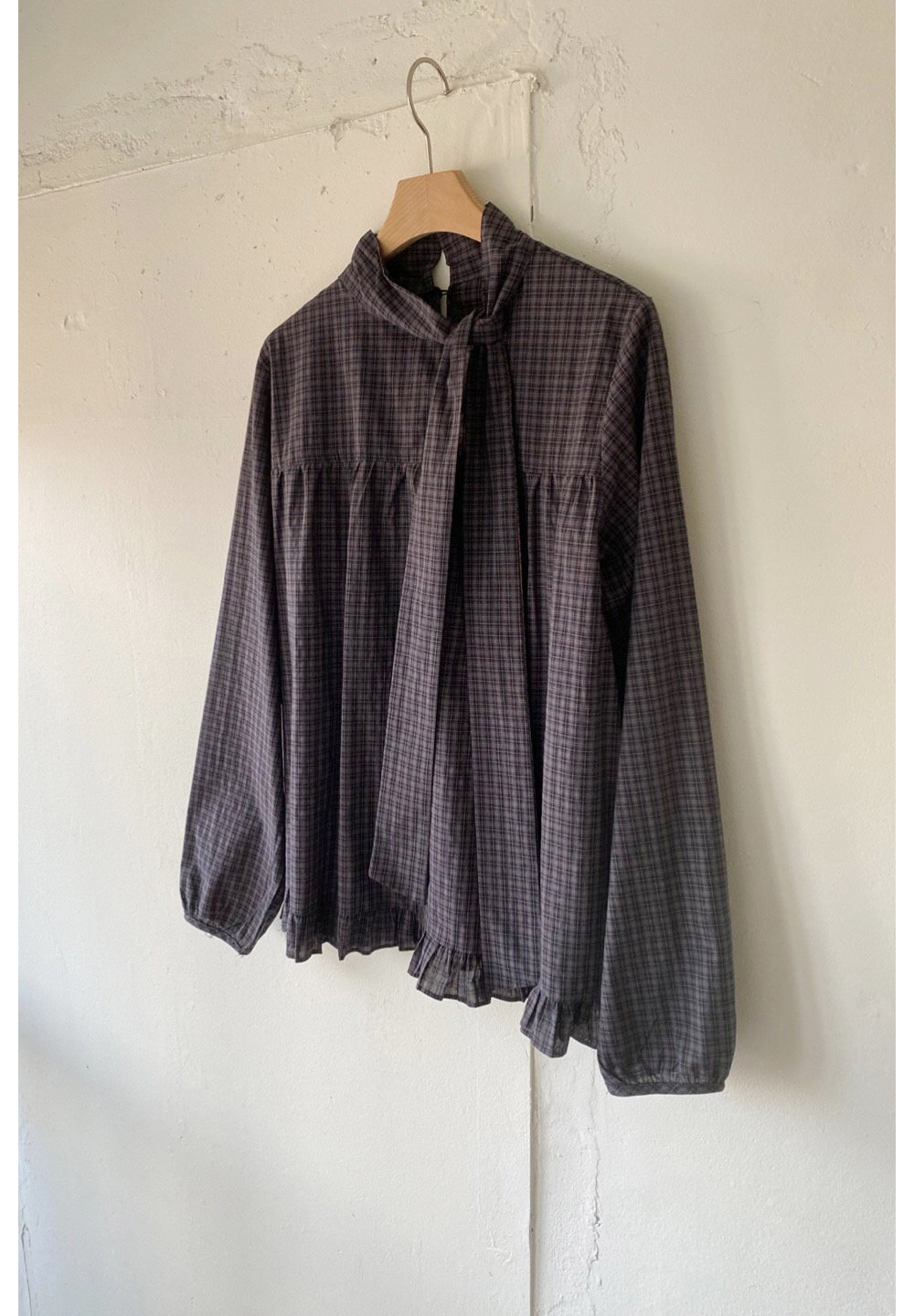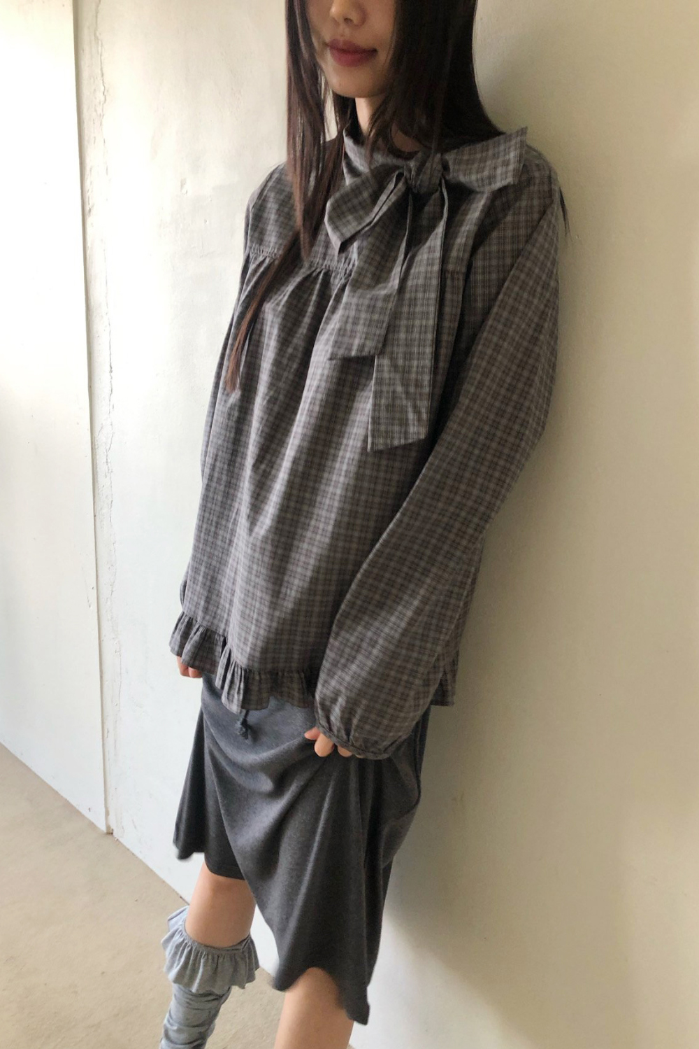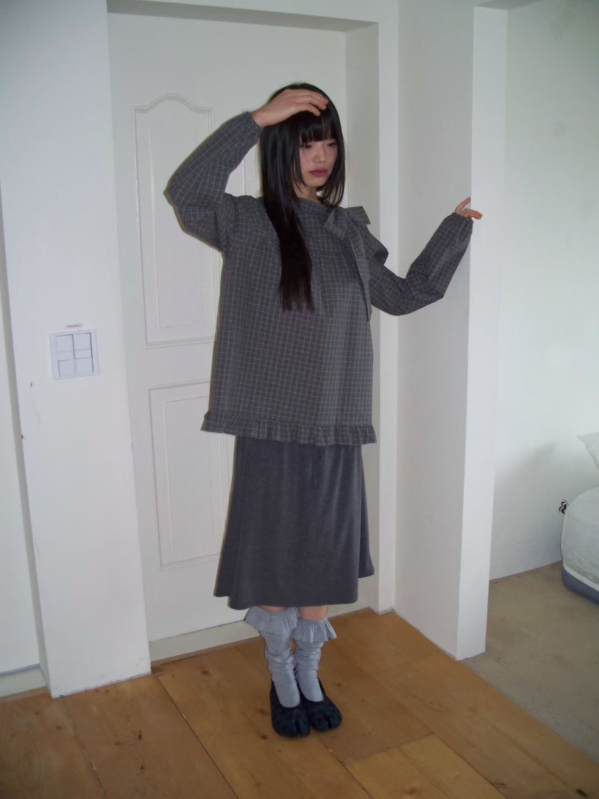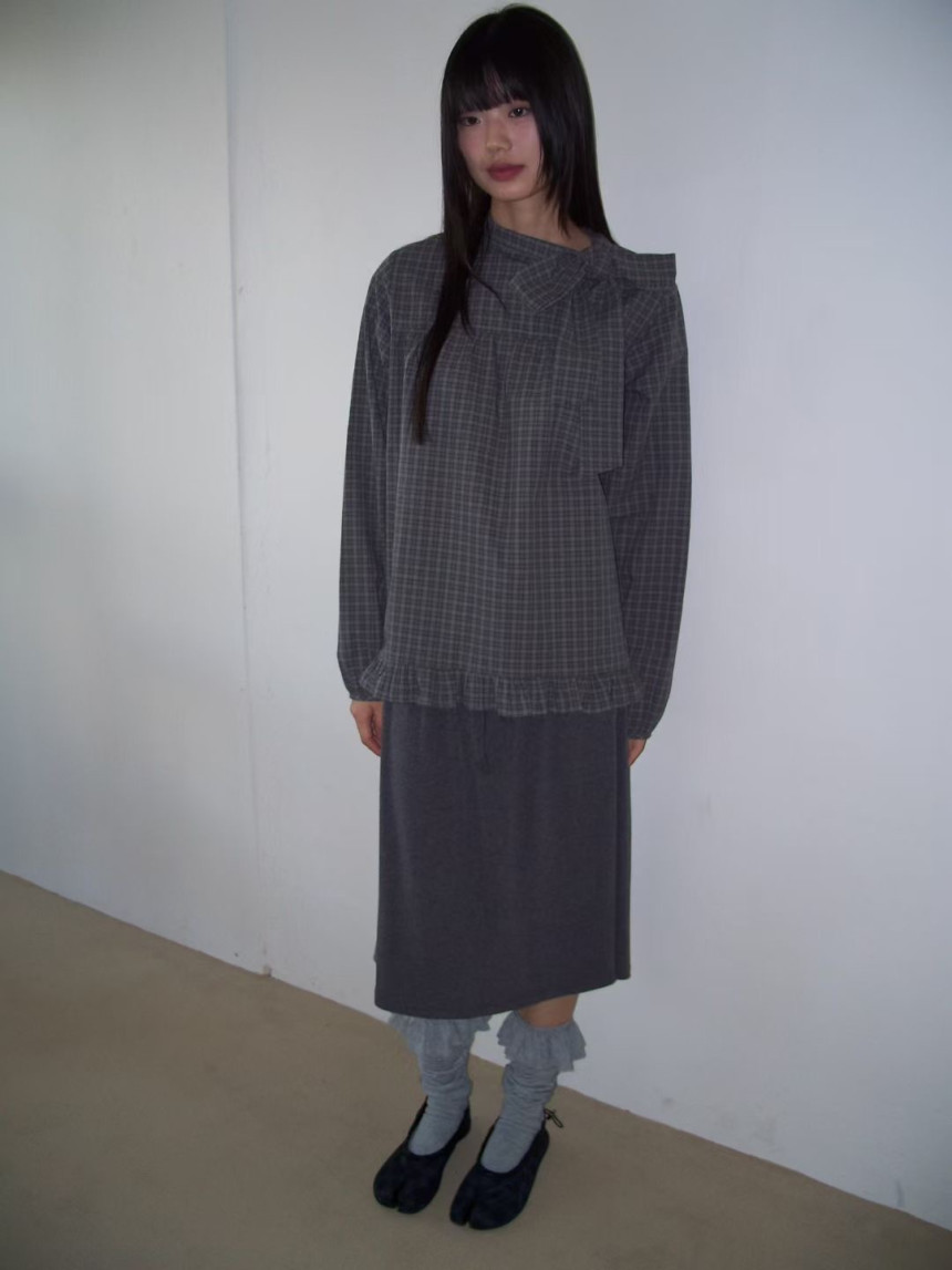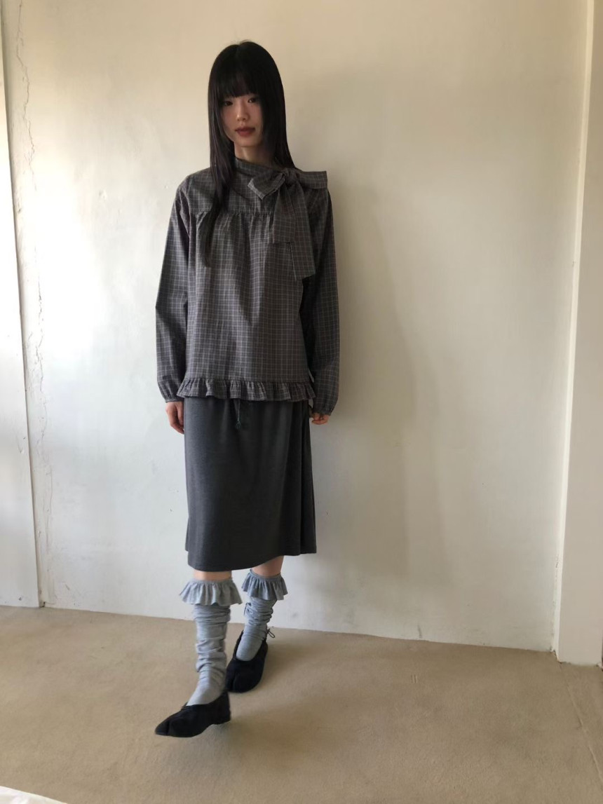 有货 韩国复古格子领口飘带蝴蝶结系带荷叶边泡泡袖衬衫日系上衣