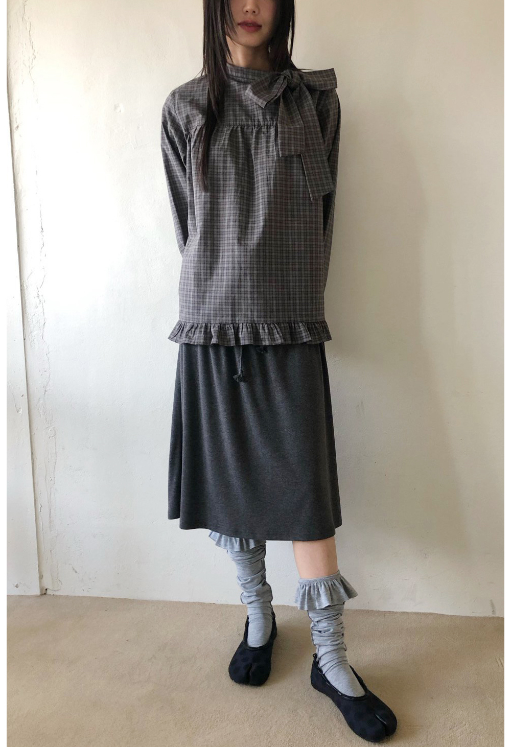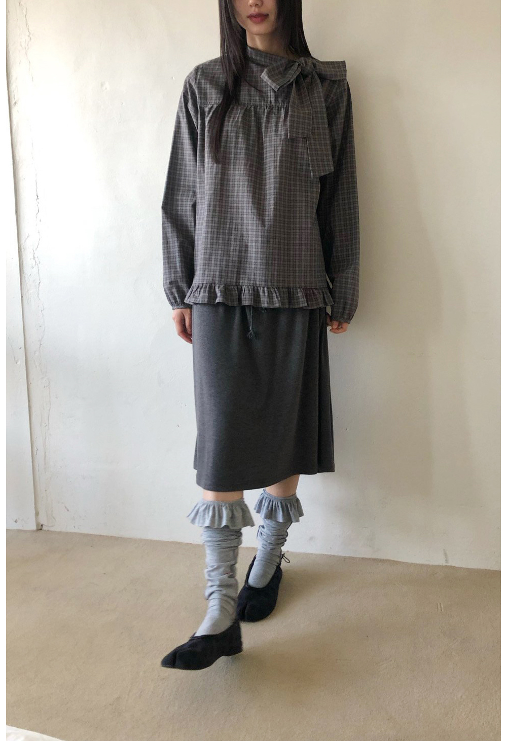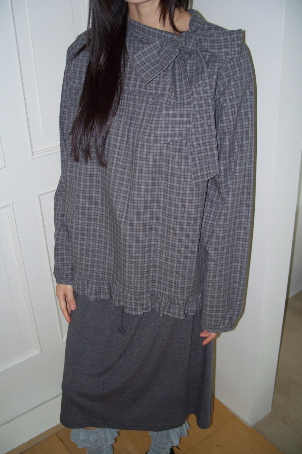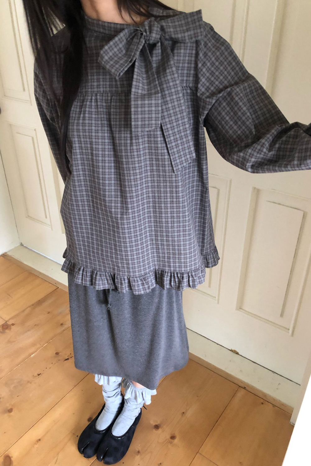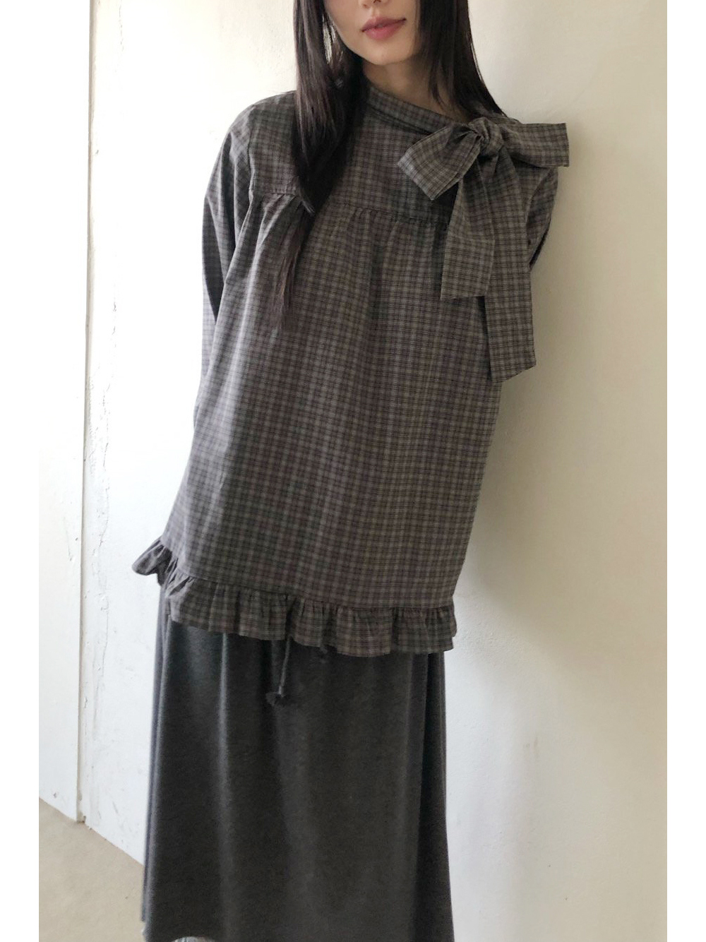 有货 韩国复古格子领口飘带蝴蝶结系带荷叶边泡泡袖衬衫日系上衣