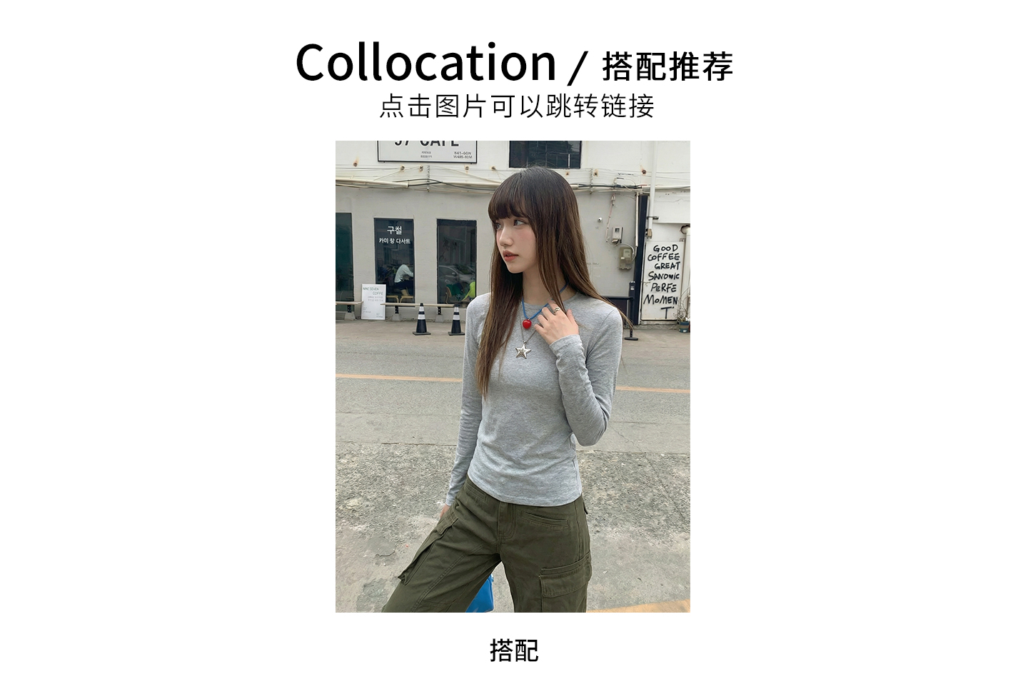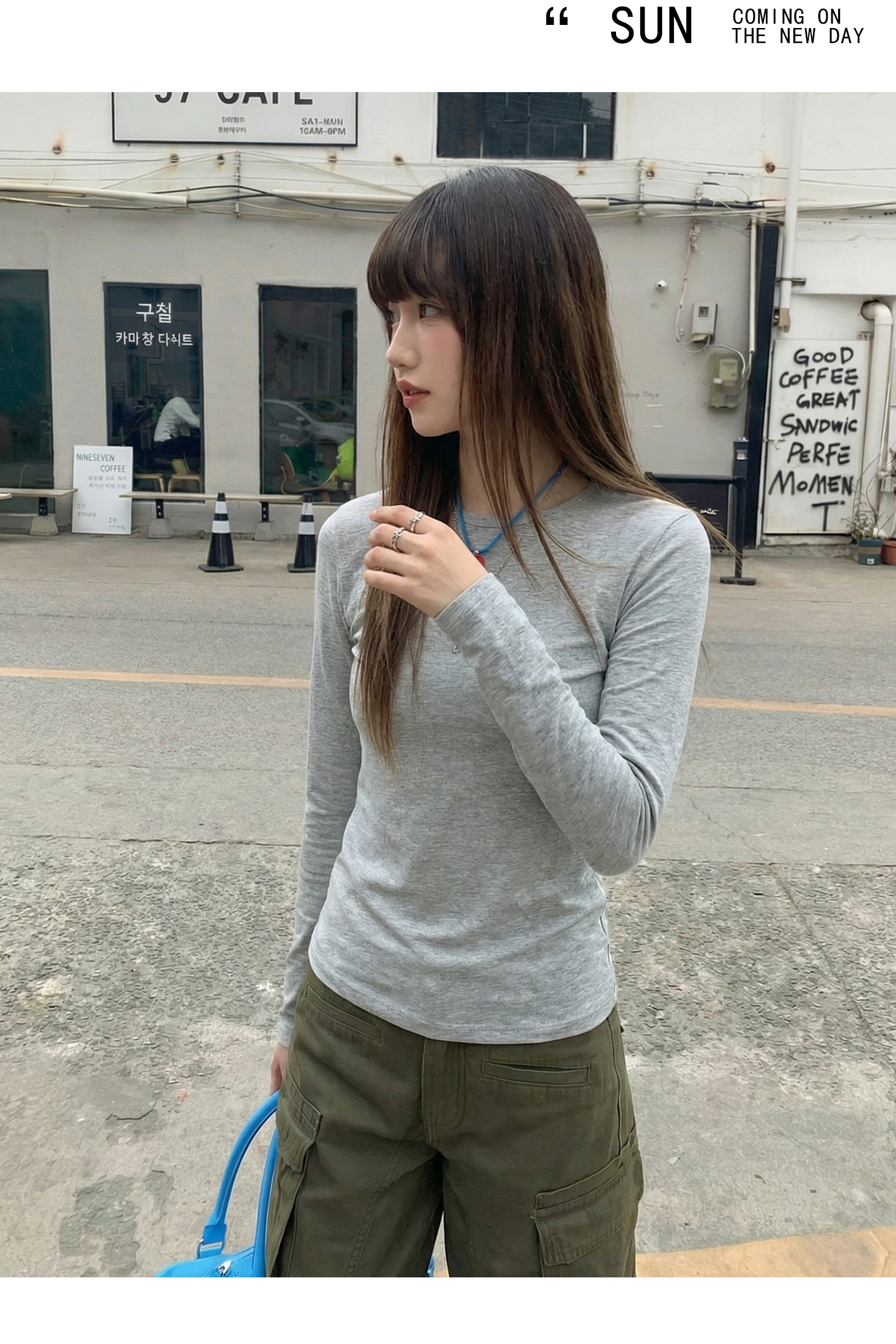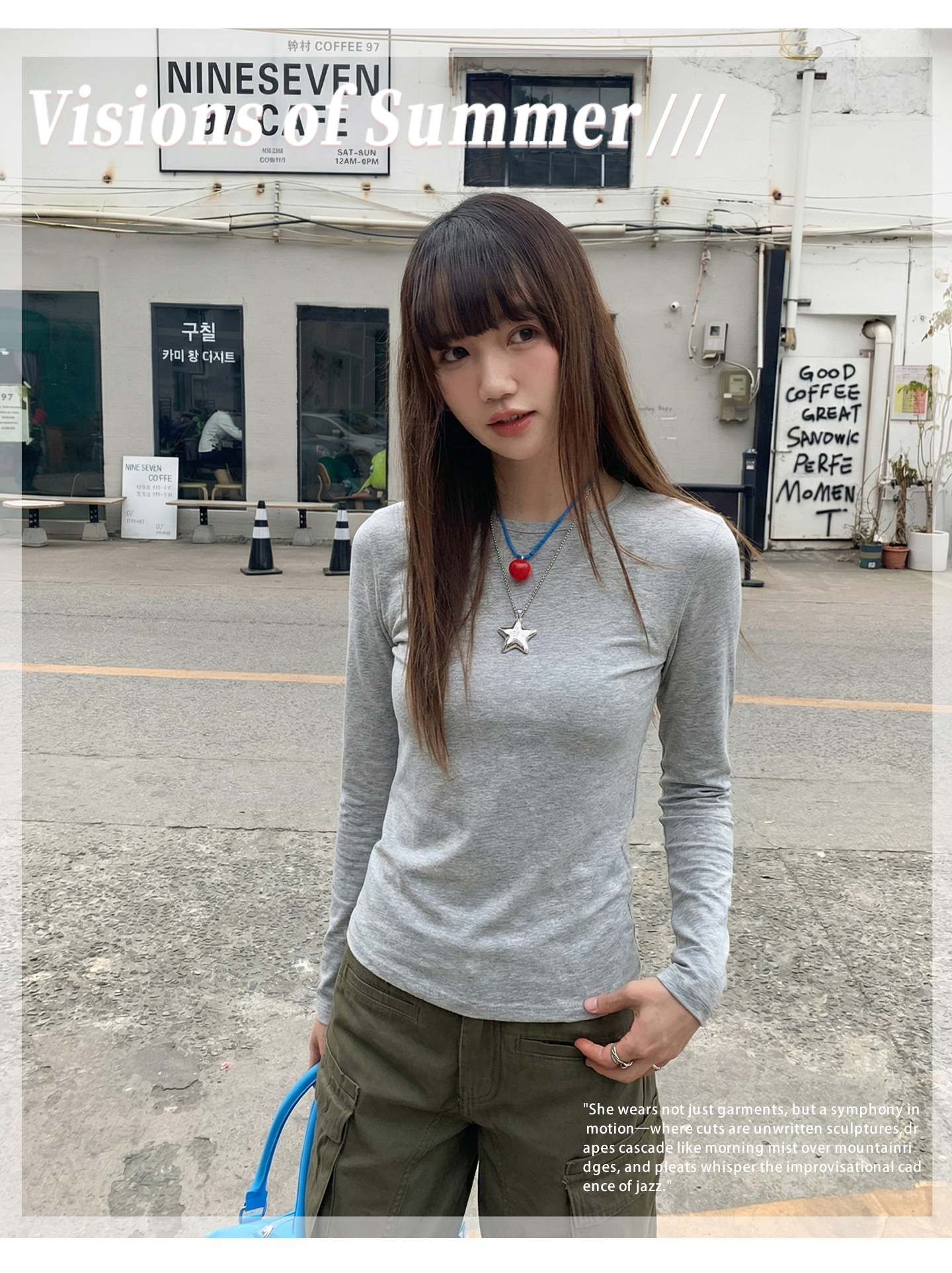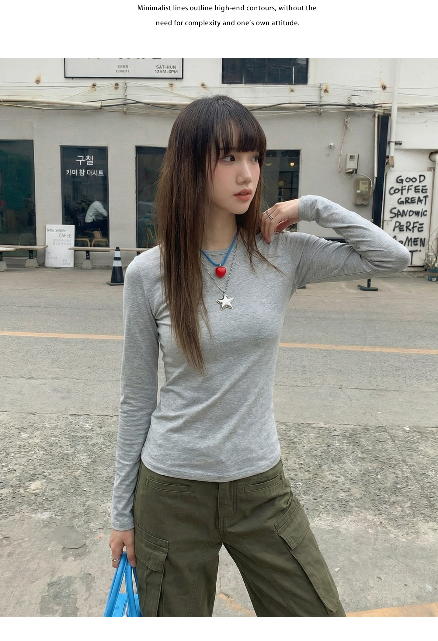 实拍实价正肩卷边长袖t恤女2026春季新款薄款修身显瘦上衣潮
