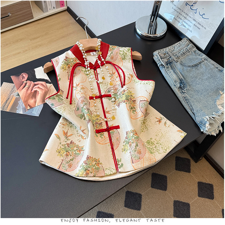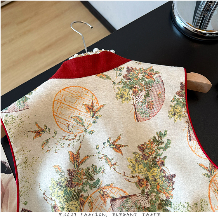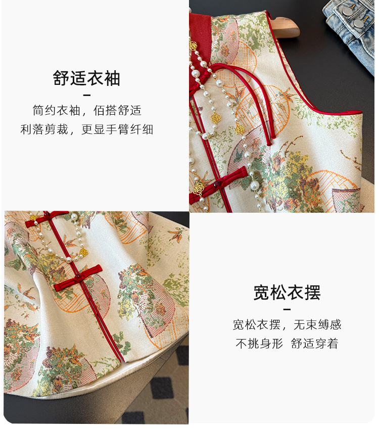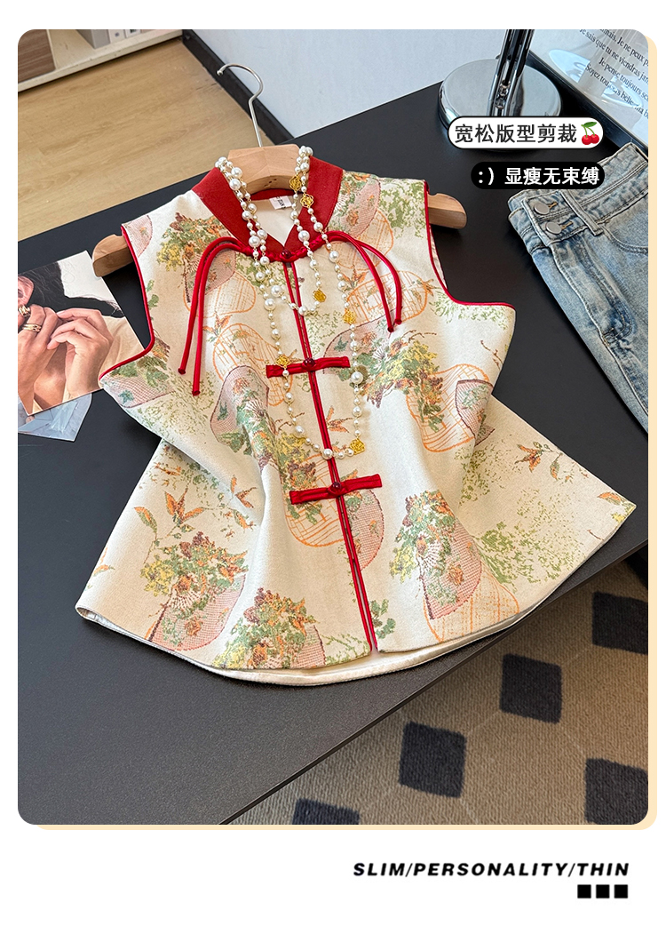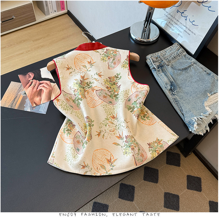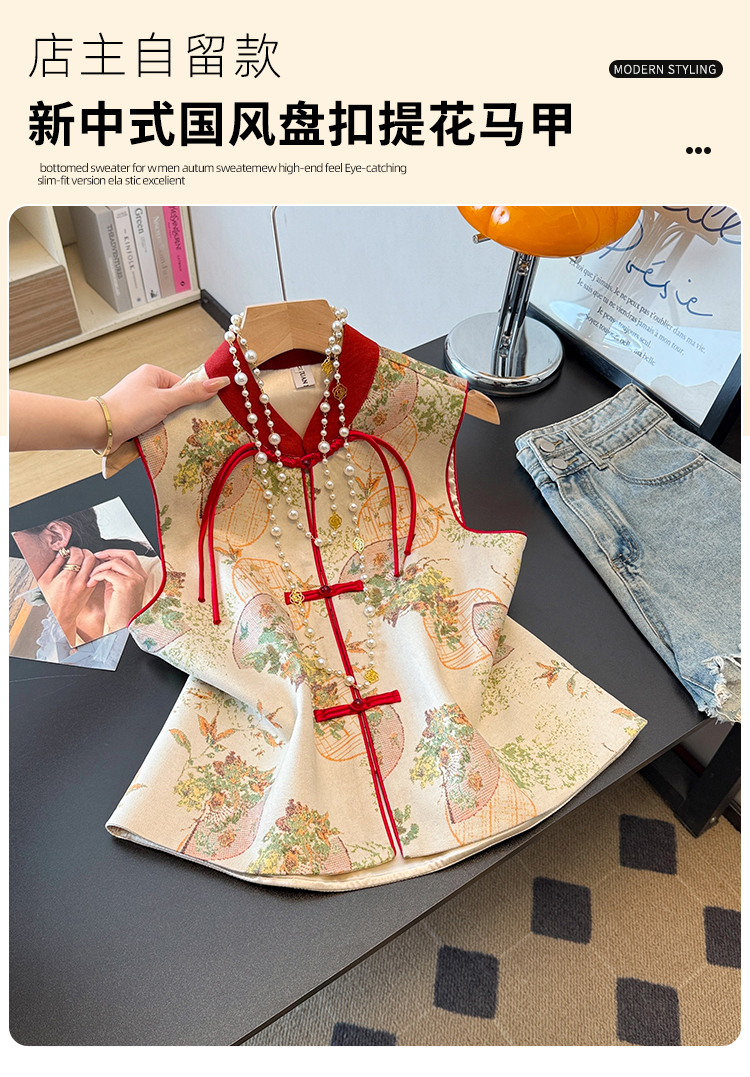 新中式国潮复古小立领盘扣鹿皮绒马甲开衫外套女植物花卉