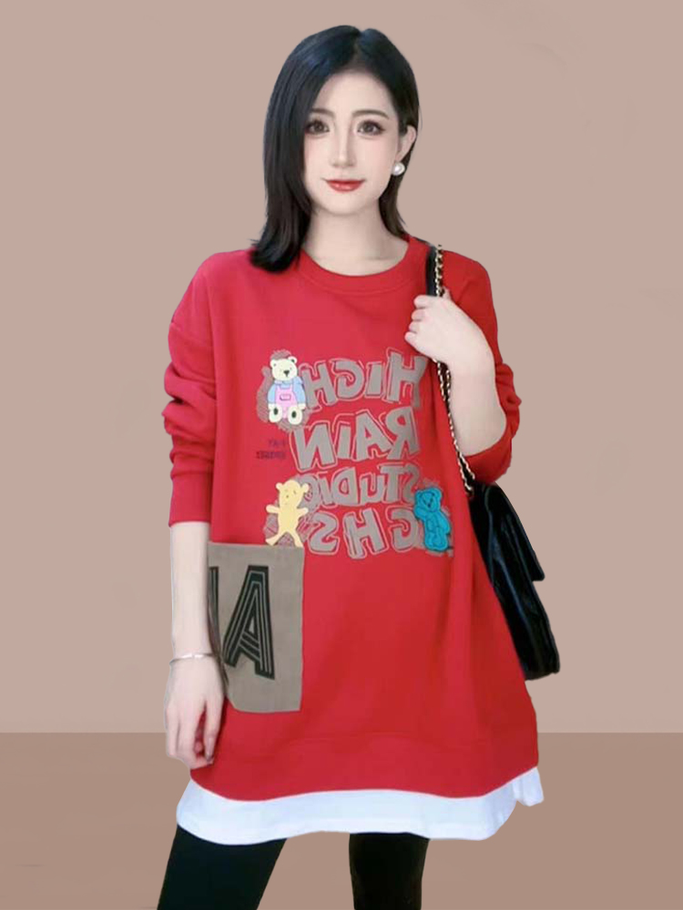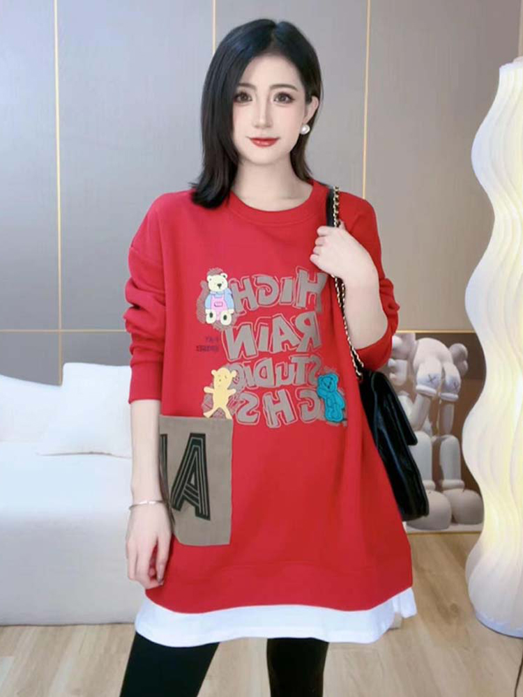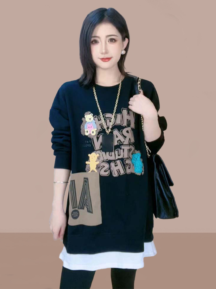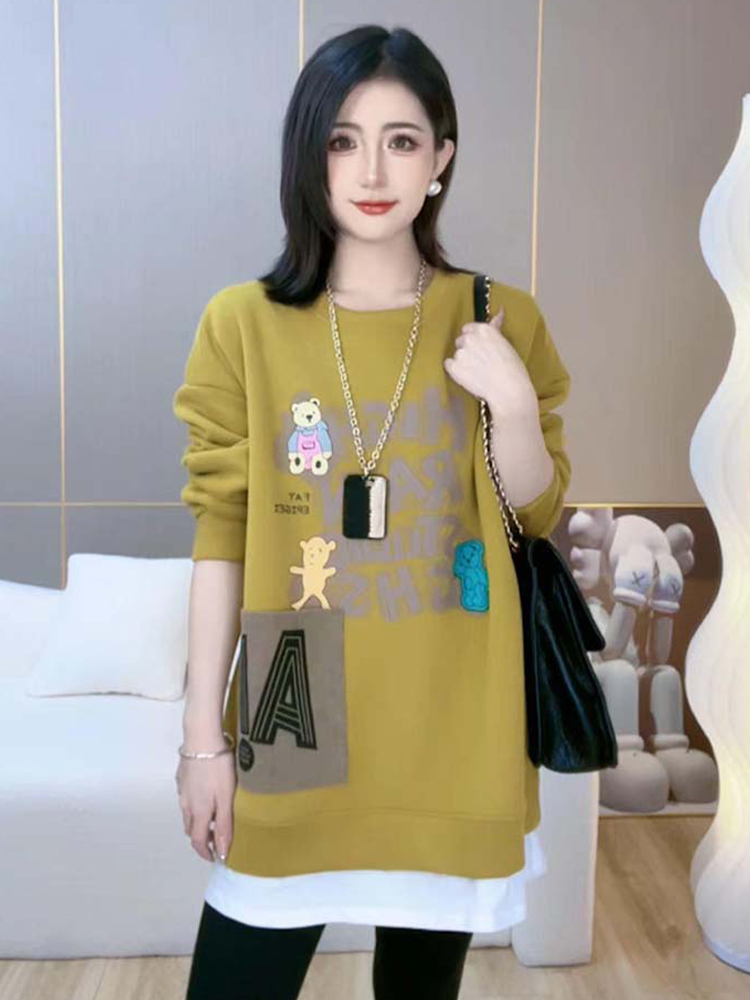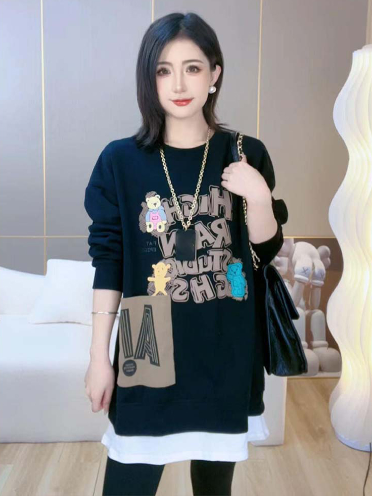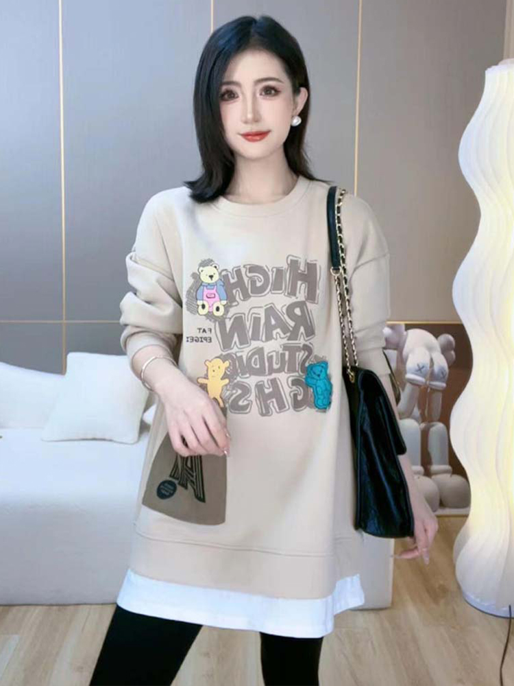 官图 高含棉2026春秋季新款中长款卫衣女时尚宽松假两件长袖上衣