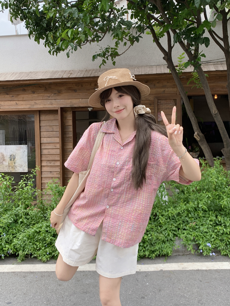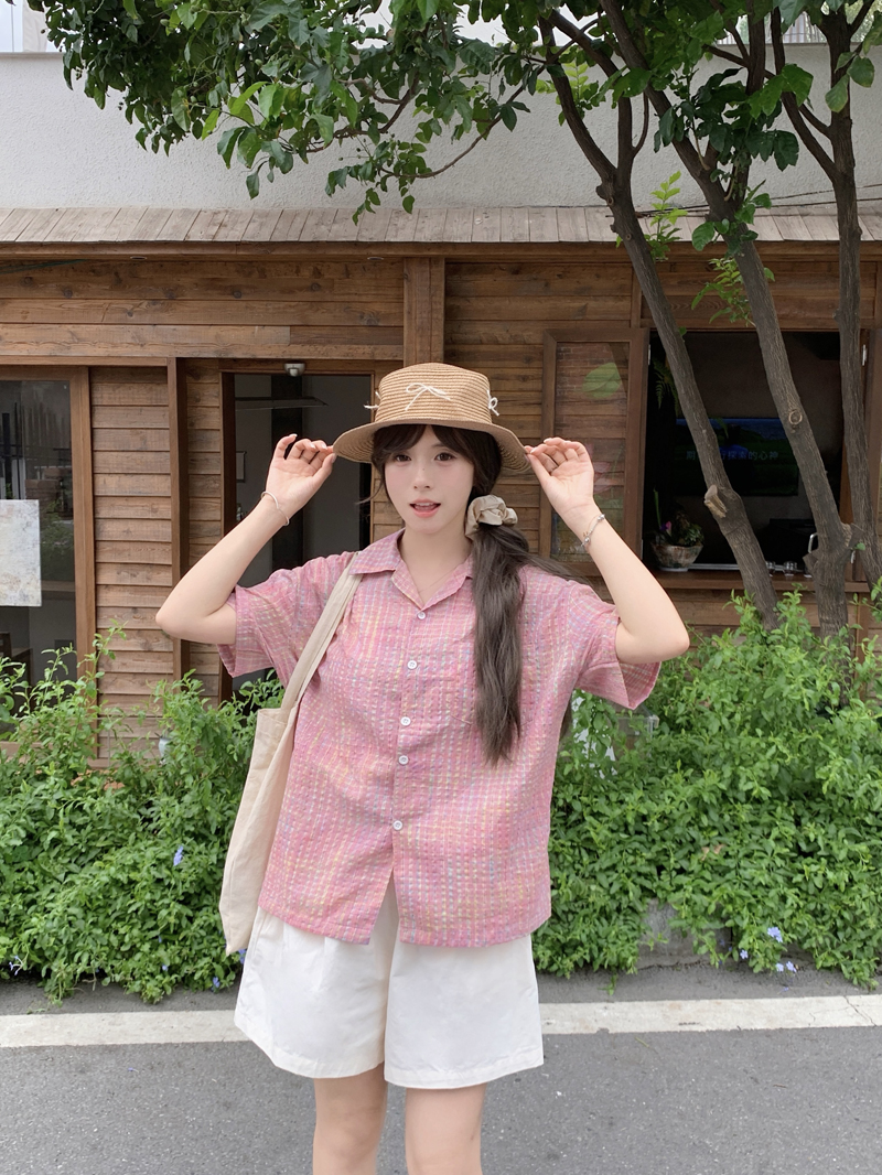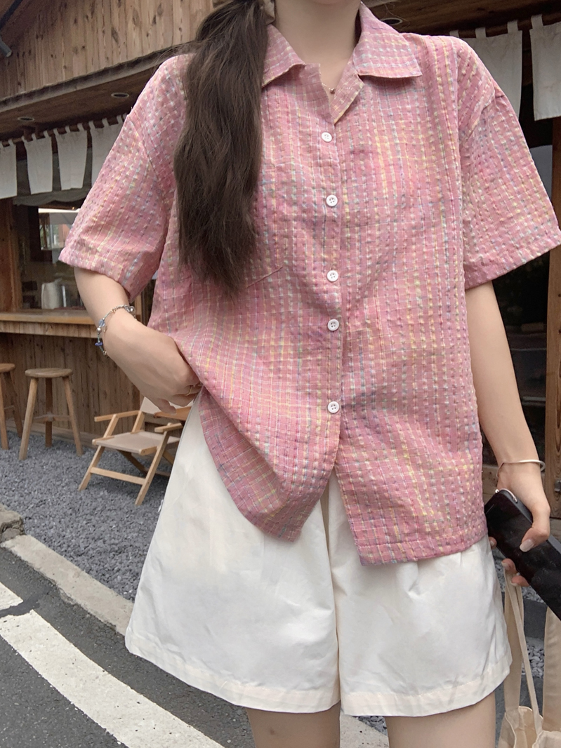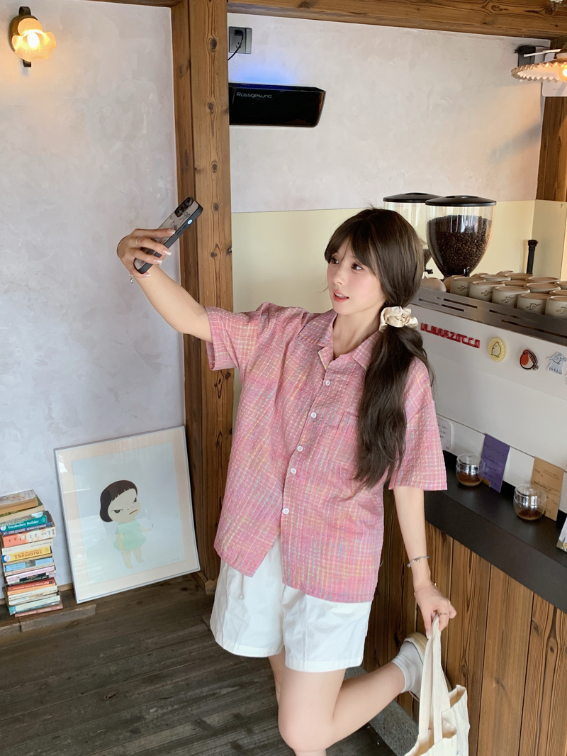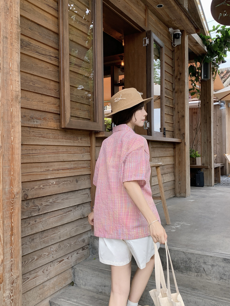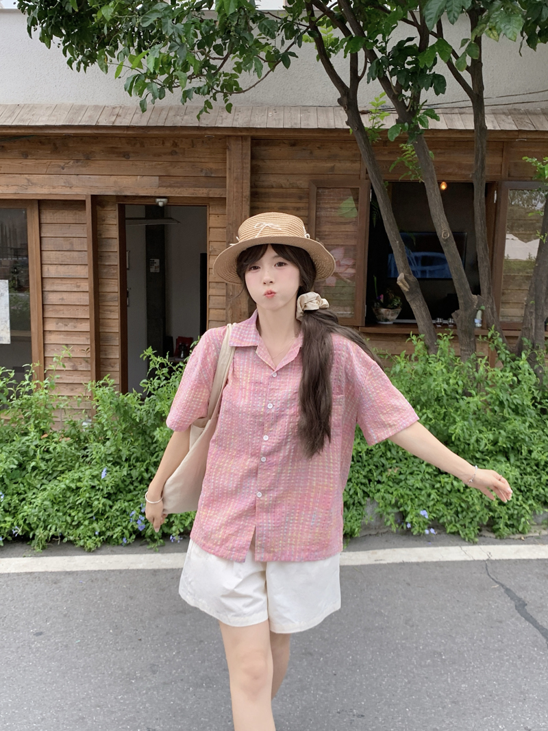 实价夏日设计感彩纱泡泡棉格子衬衫女2026百搭宽松休闲古巴领上衣