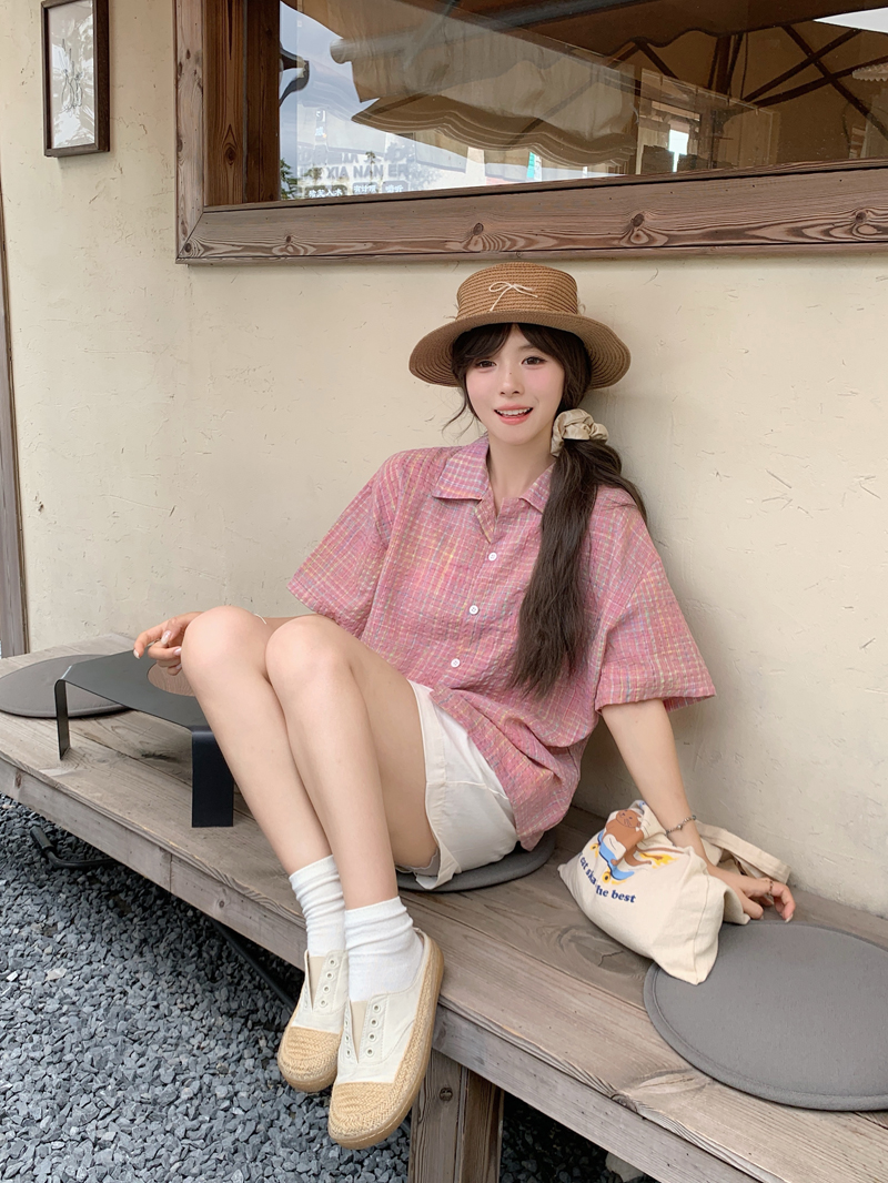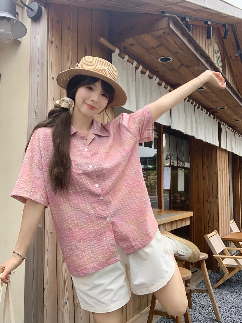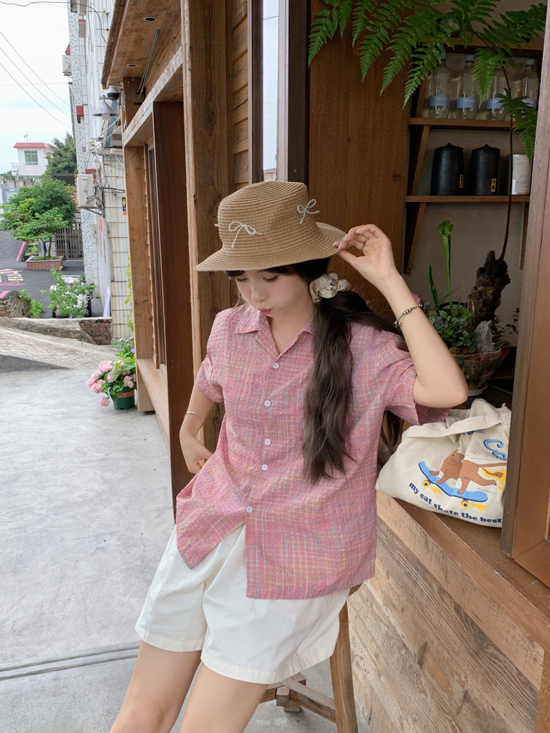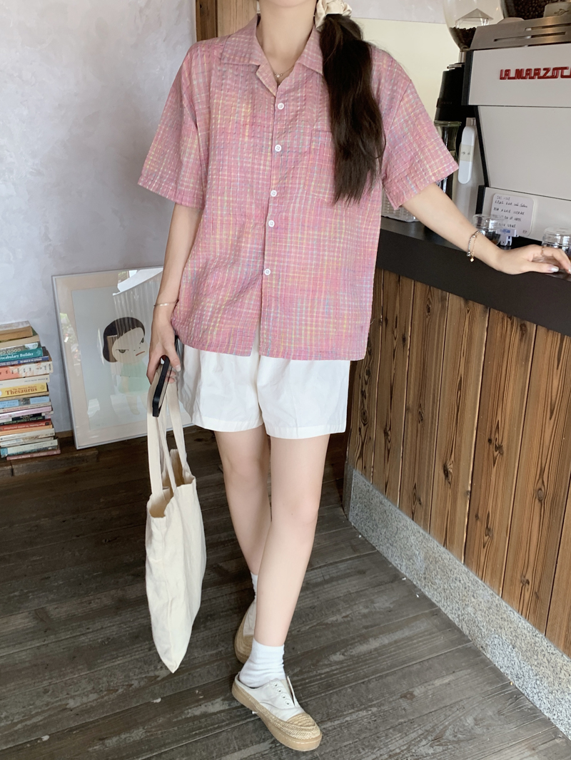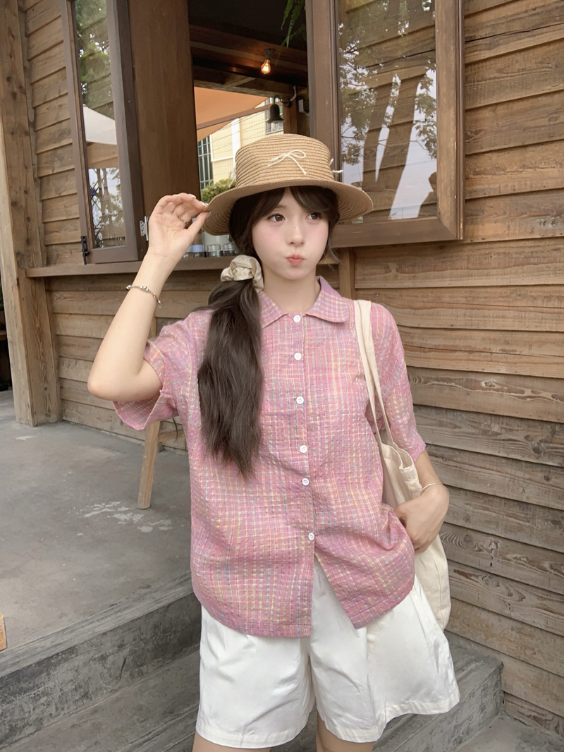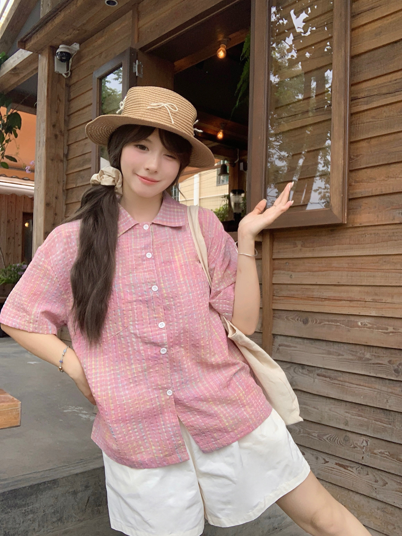 实价夏日设计感彩纱泡泡棉格子衬衫女2026百搭宽松休闲古巴领上衣