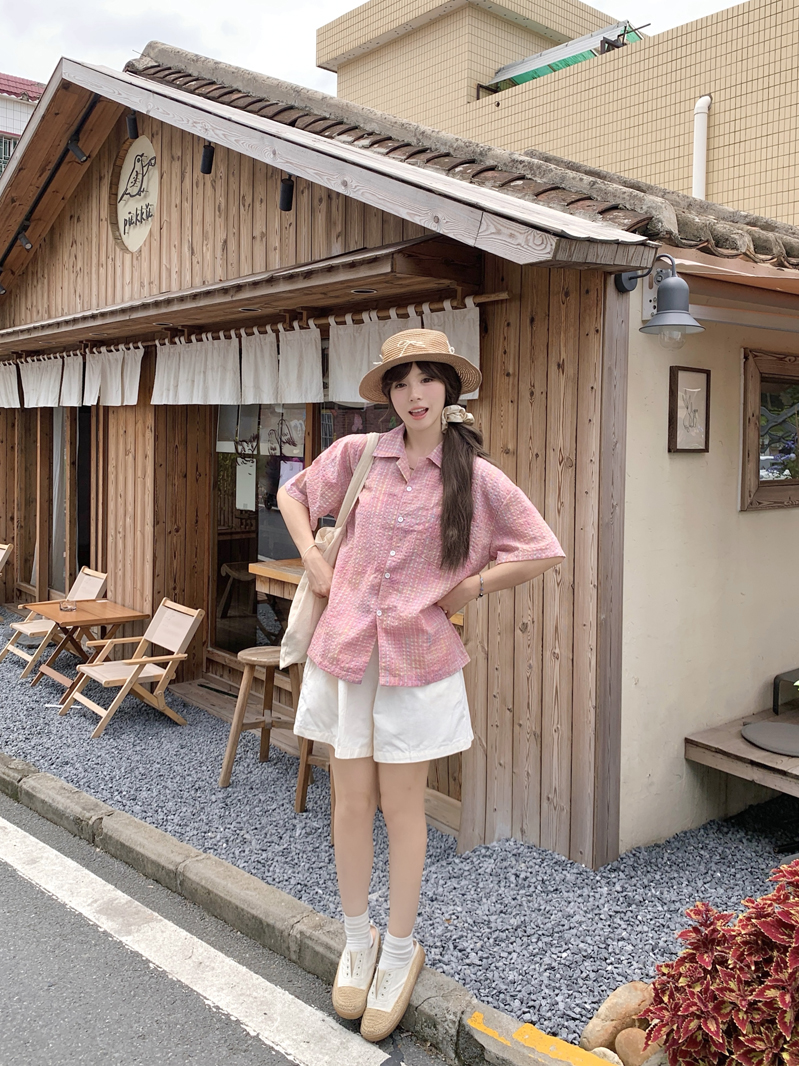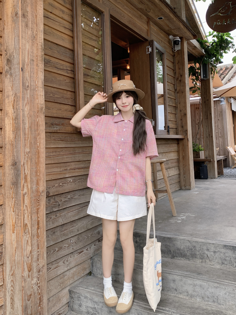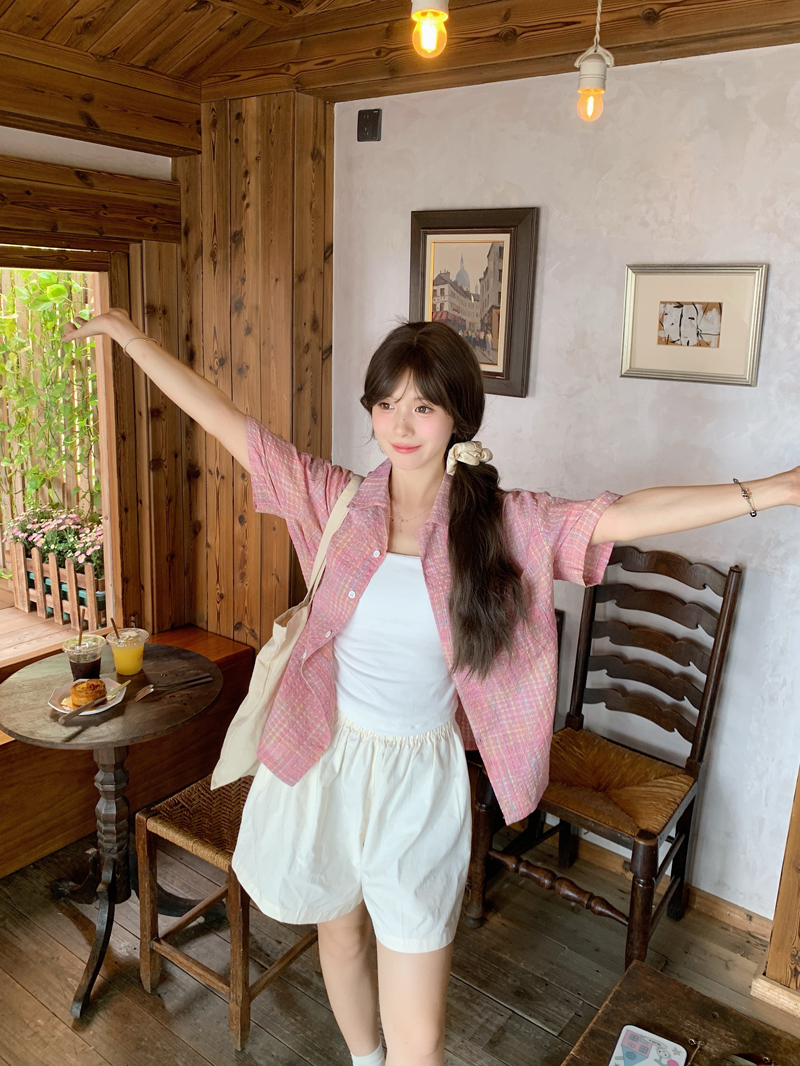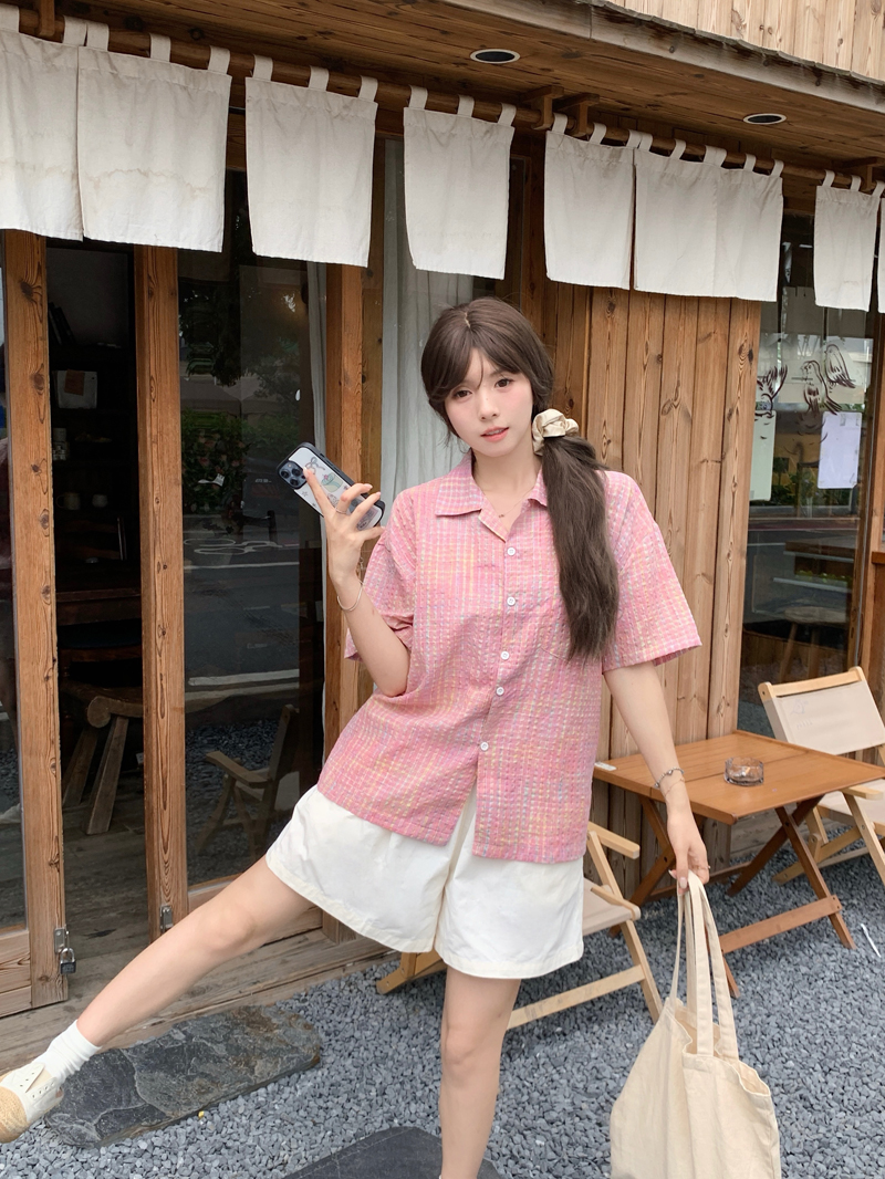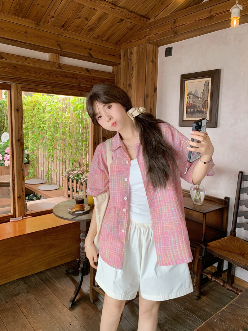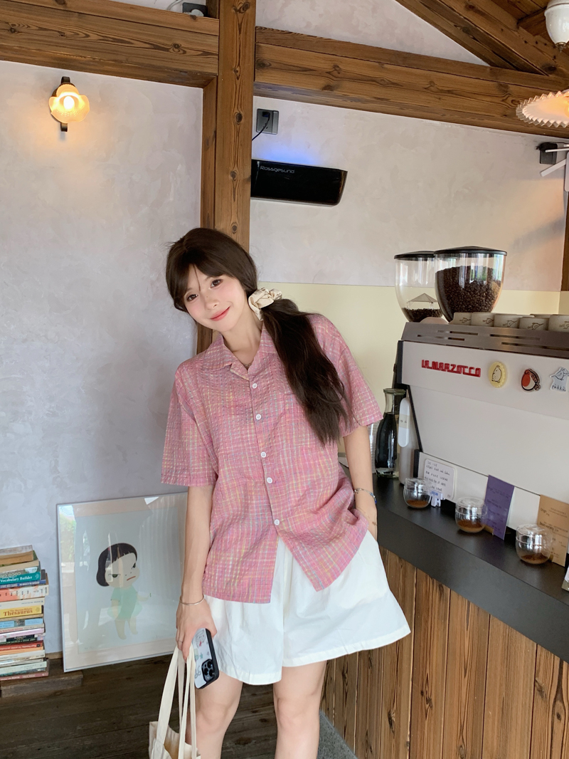 实价夏日设计感彩纱泡泡棉格子衬衫女2026百搭宽松休闲古巴领上衣