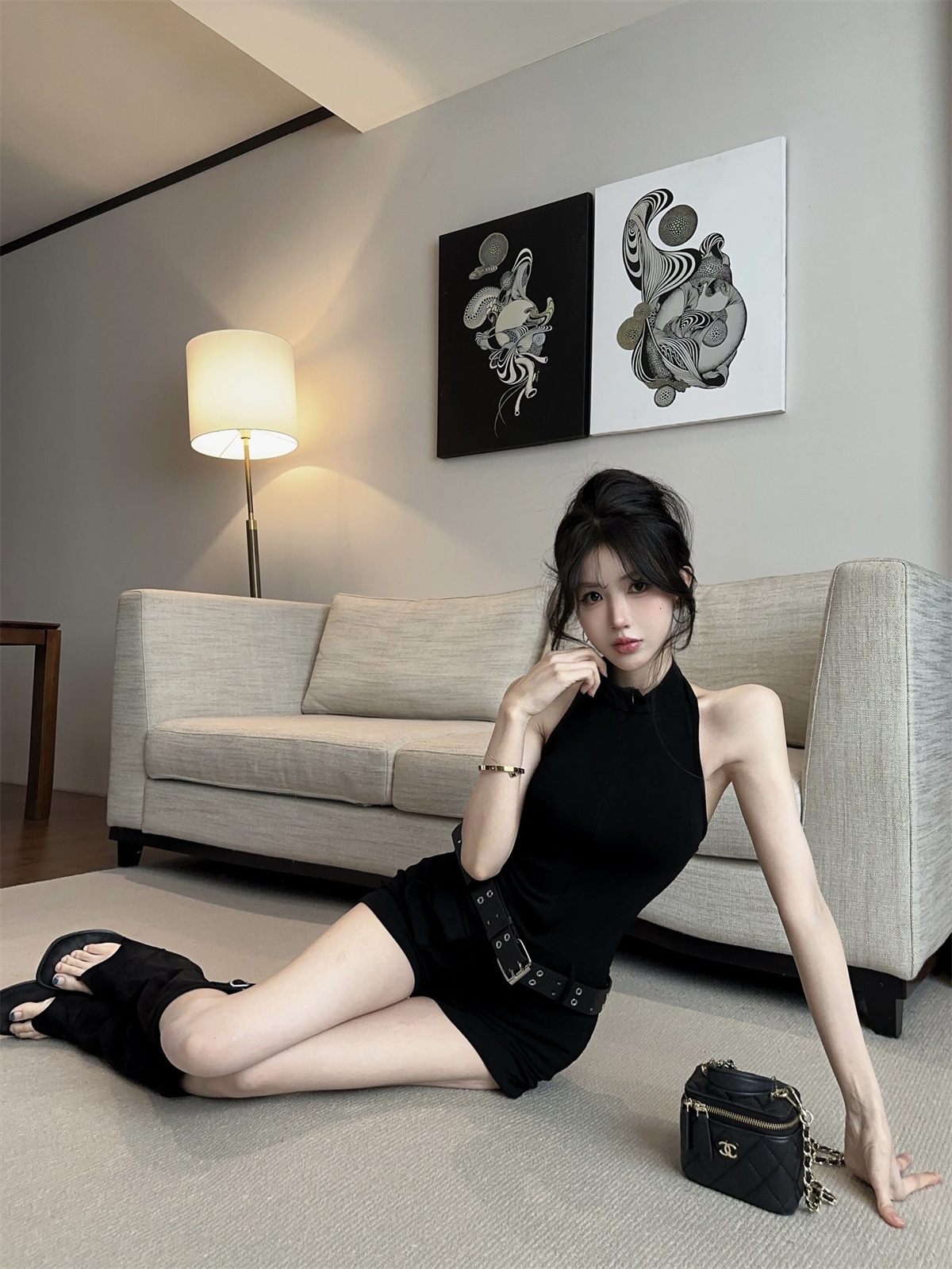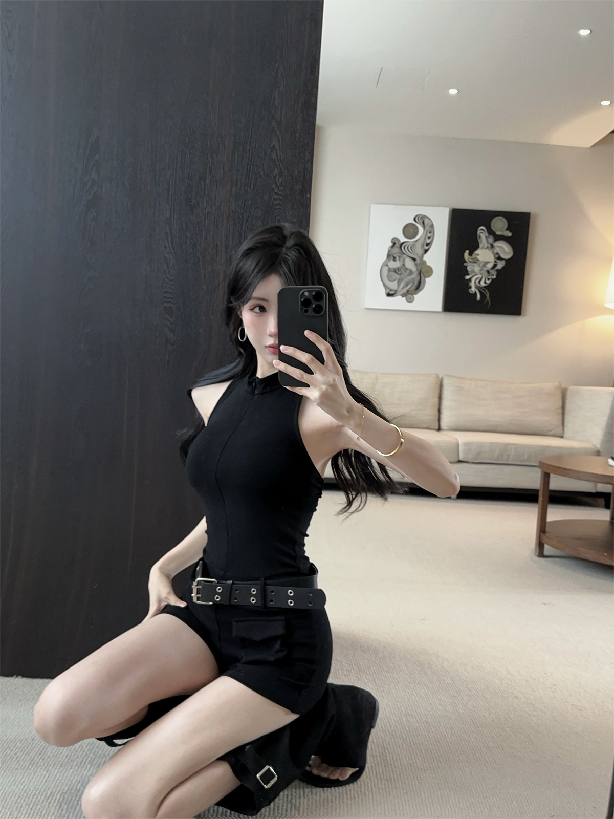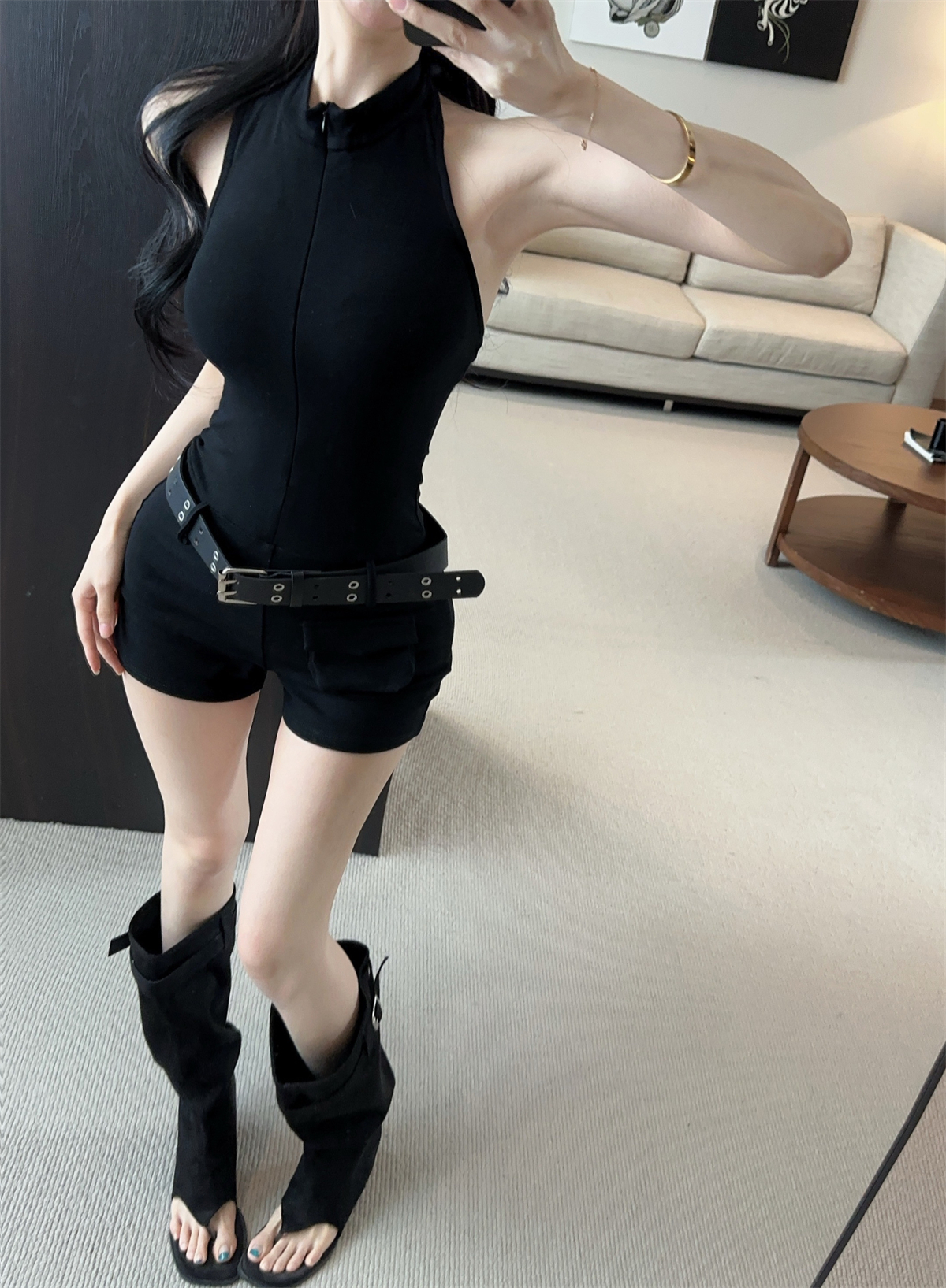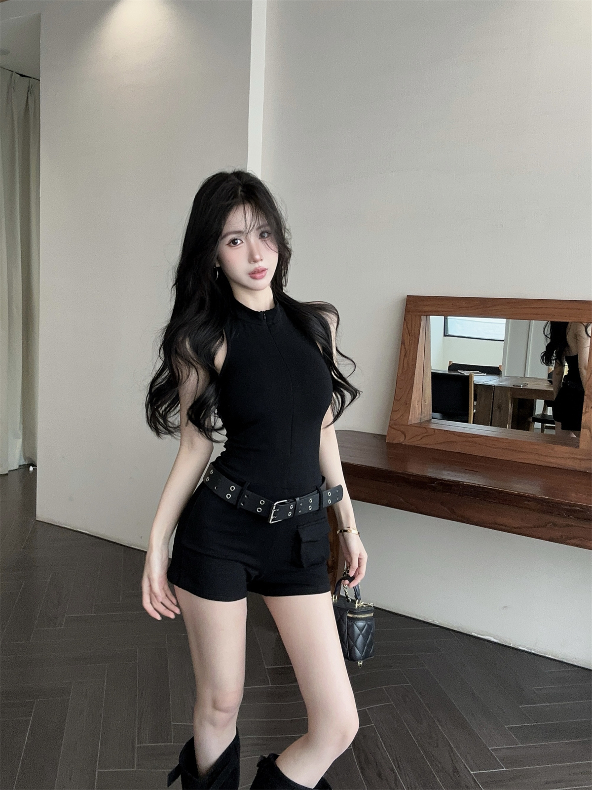 实拍实价 拉链V领显瘦修身酷飒口袋连体裤短裤女春