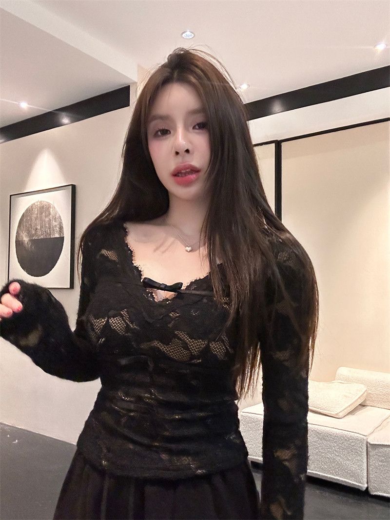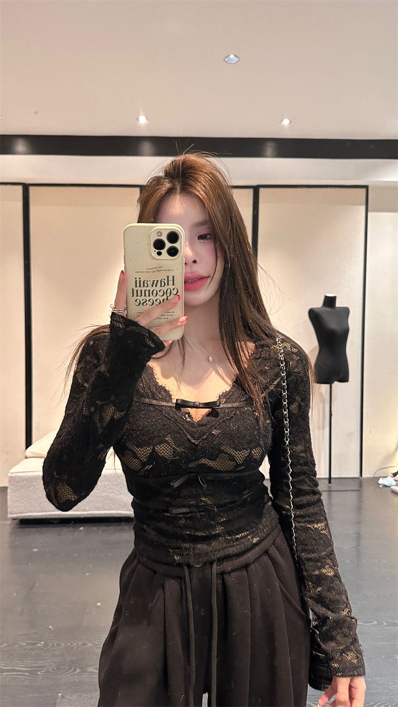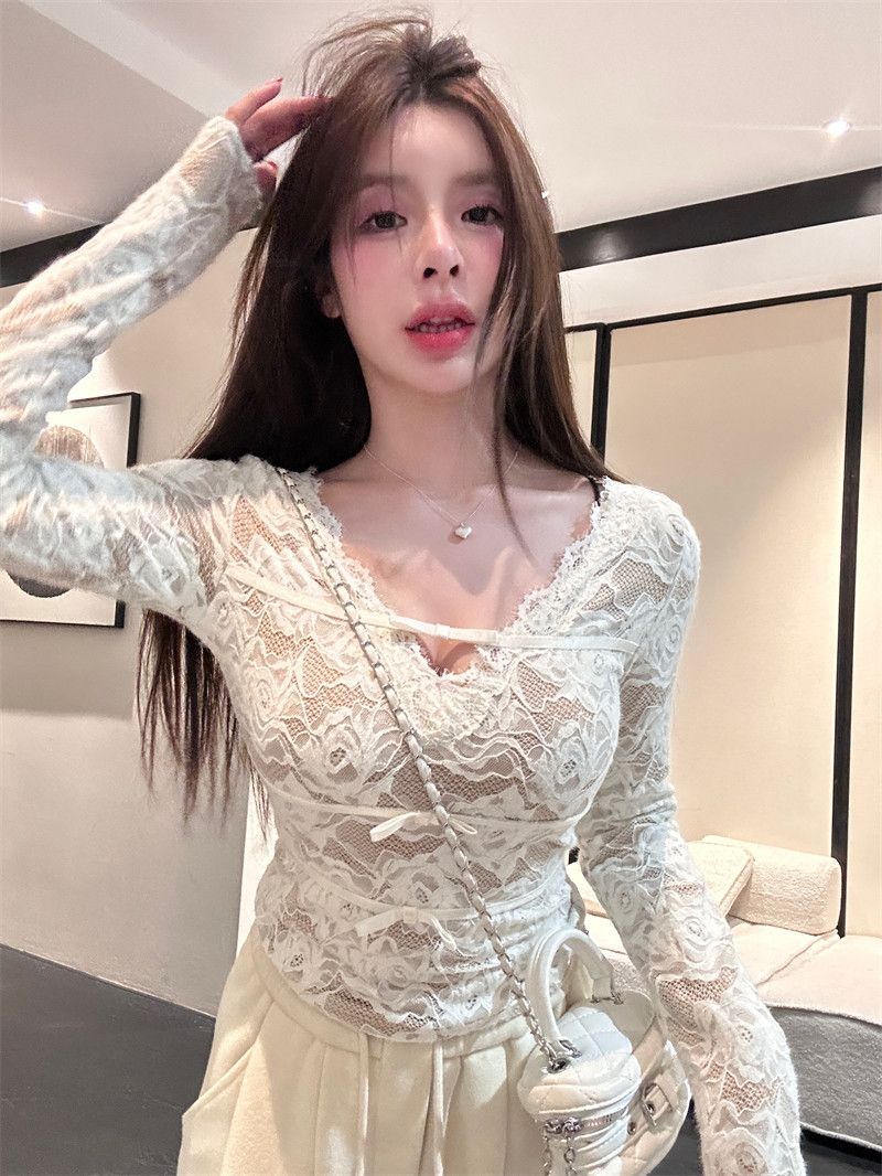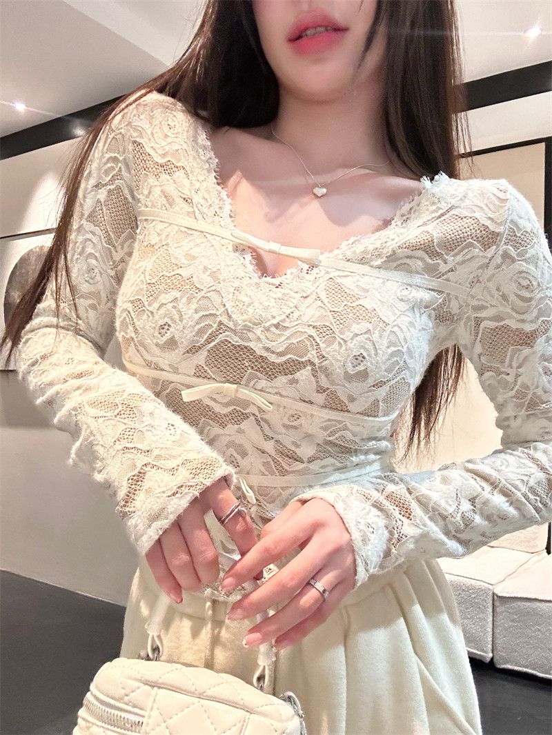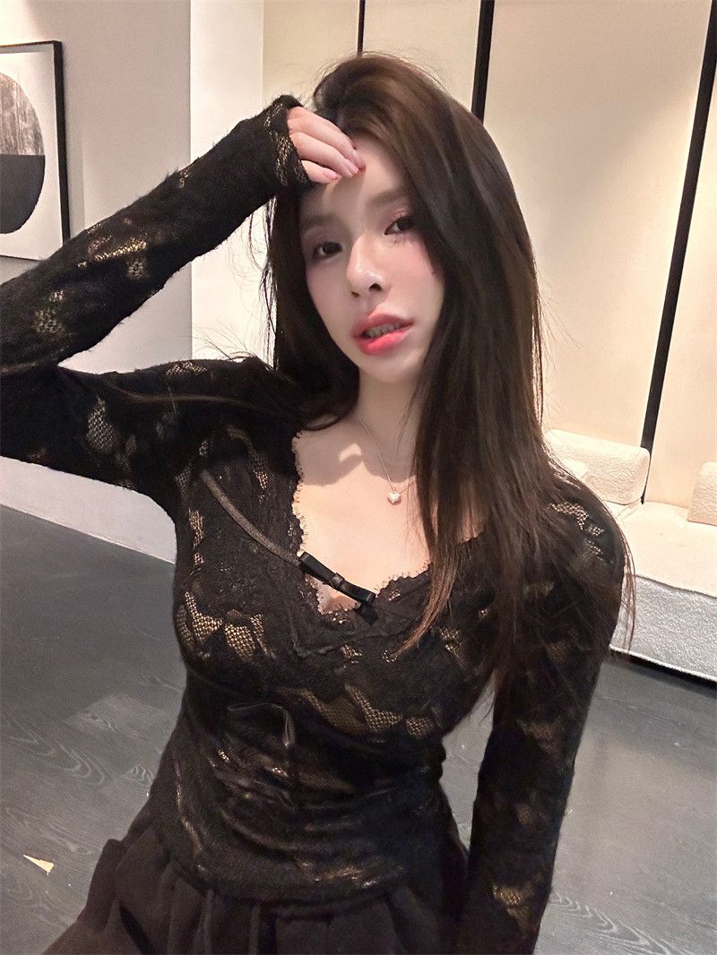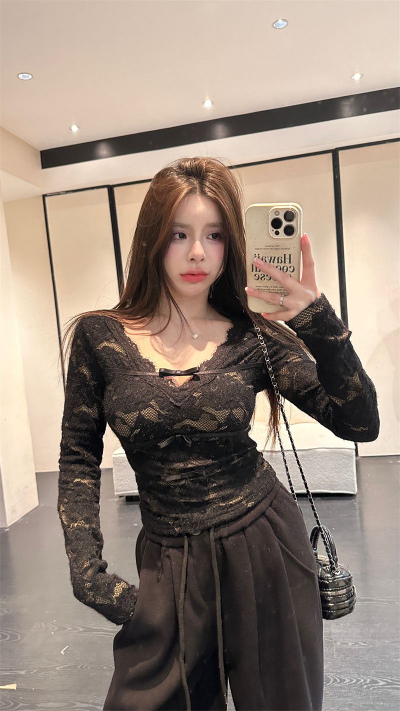 已出货 v领长袖蕾丝衫女冬季蝴蝶结内搭T恤纯欲修身打底上衣