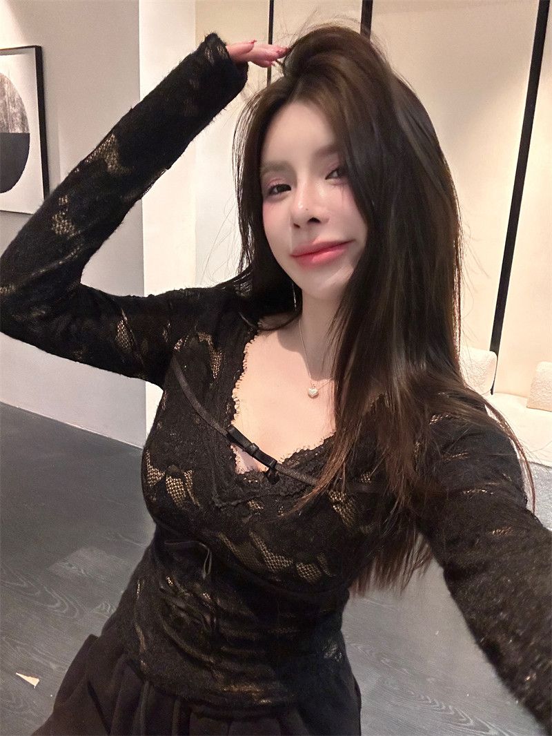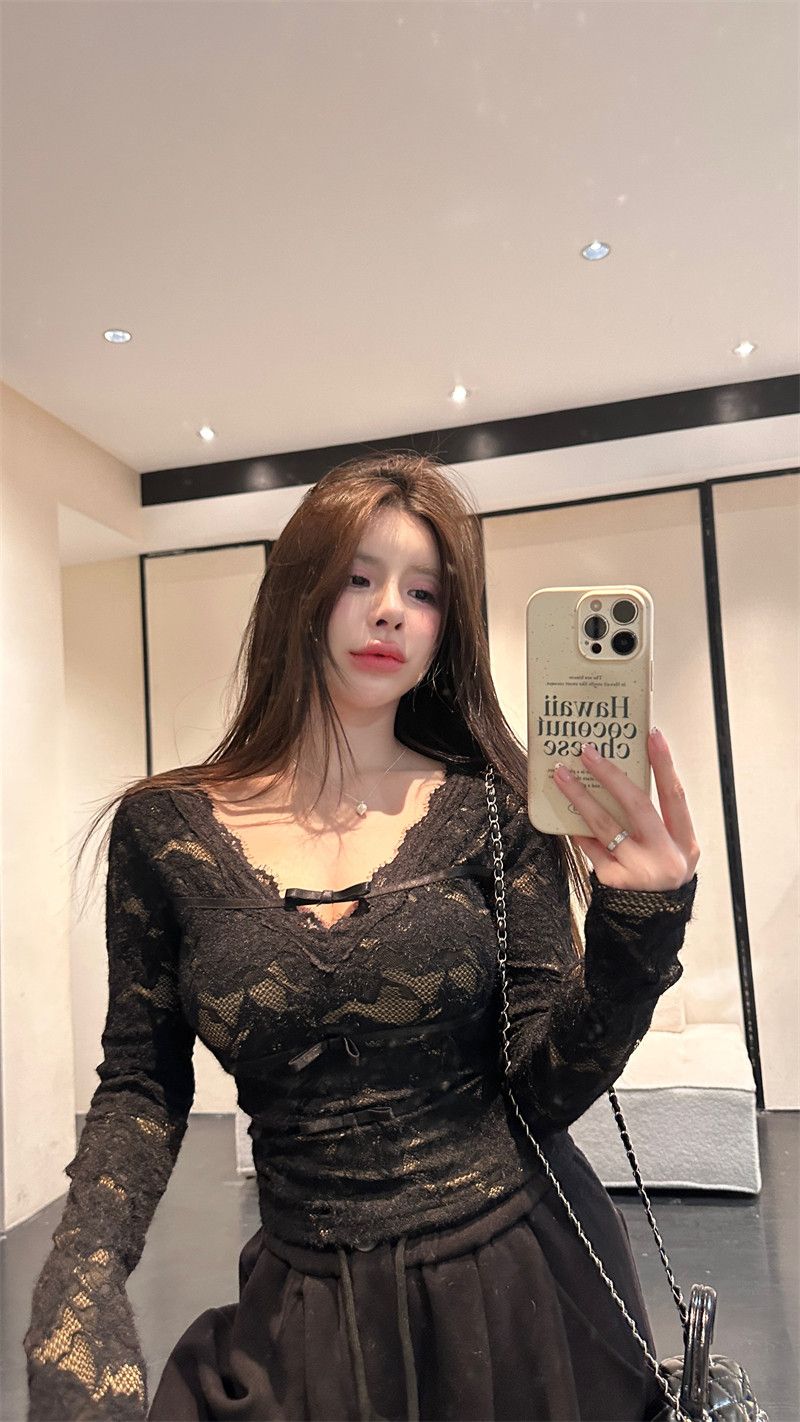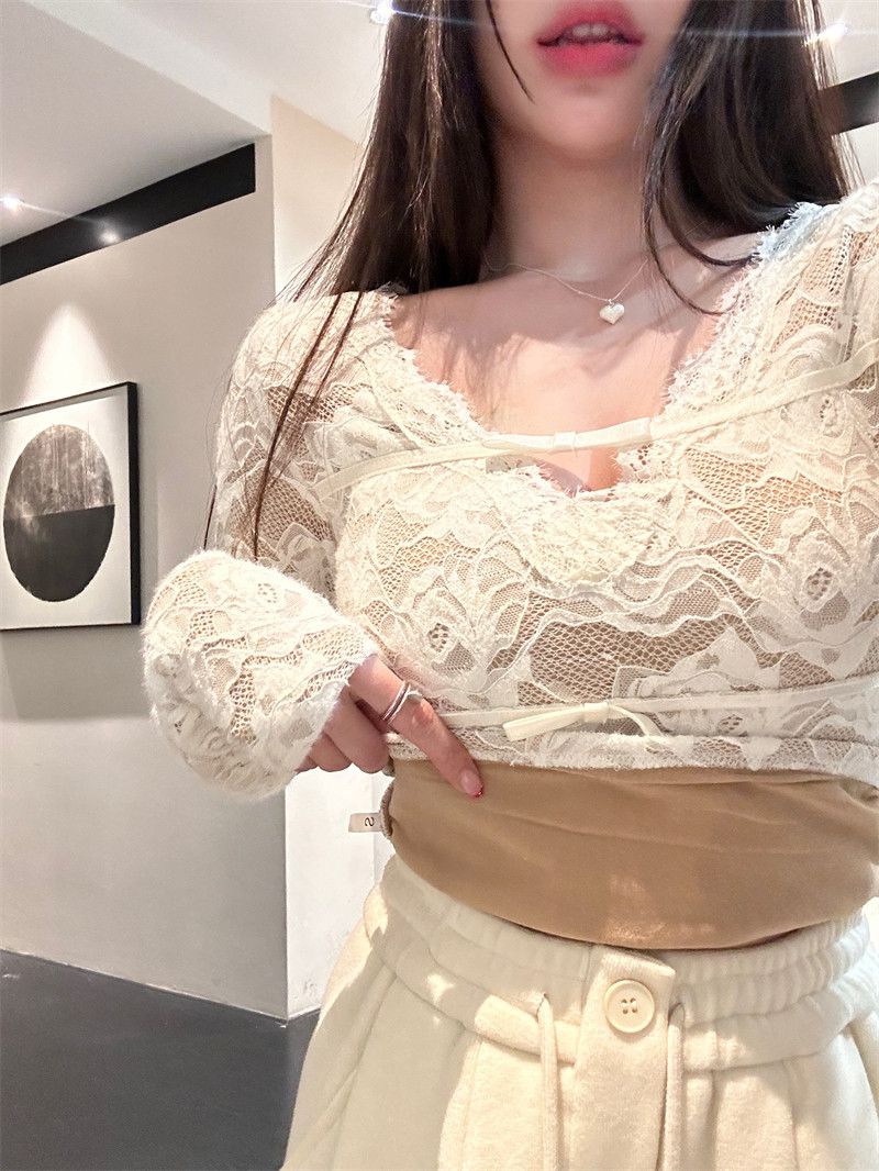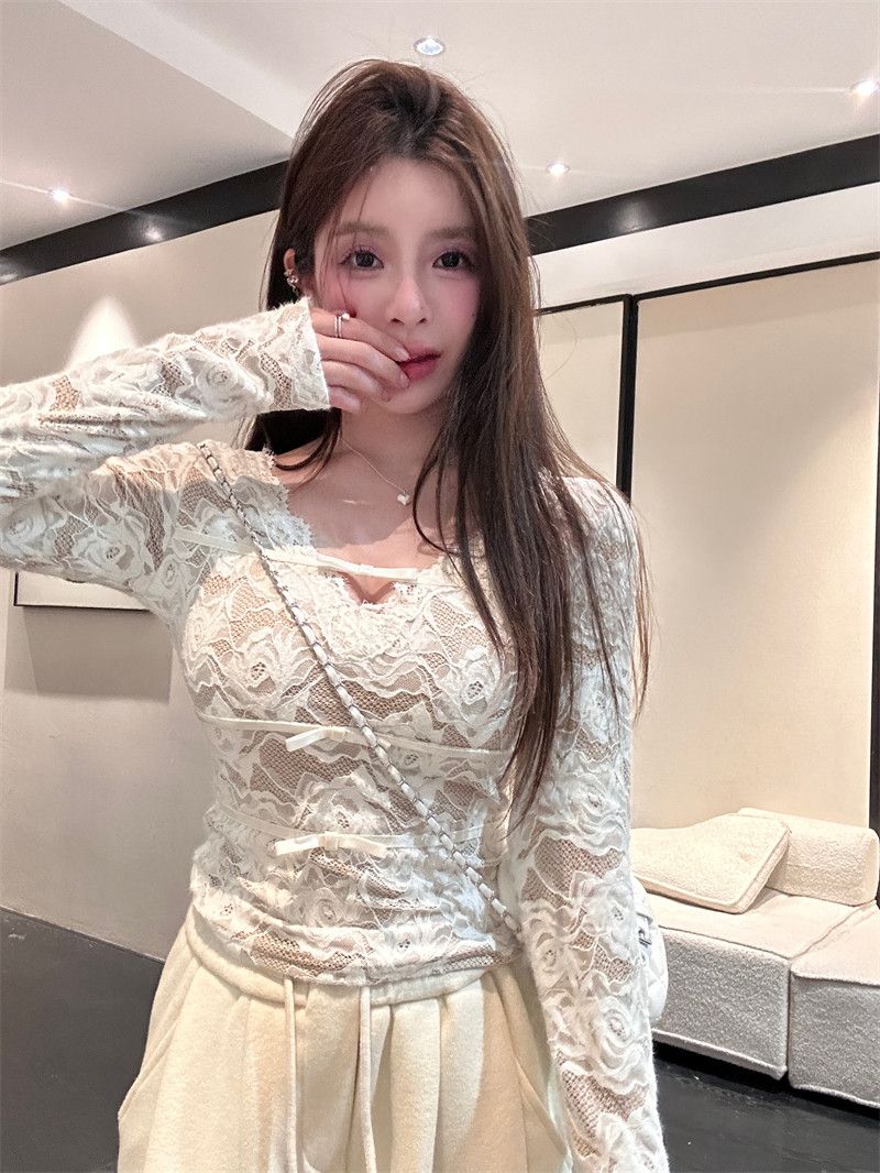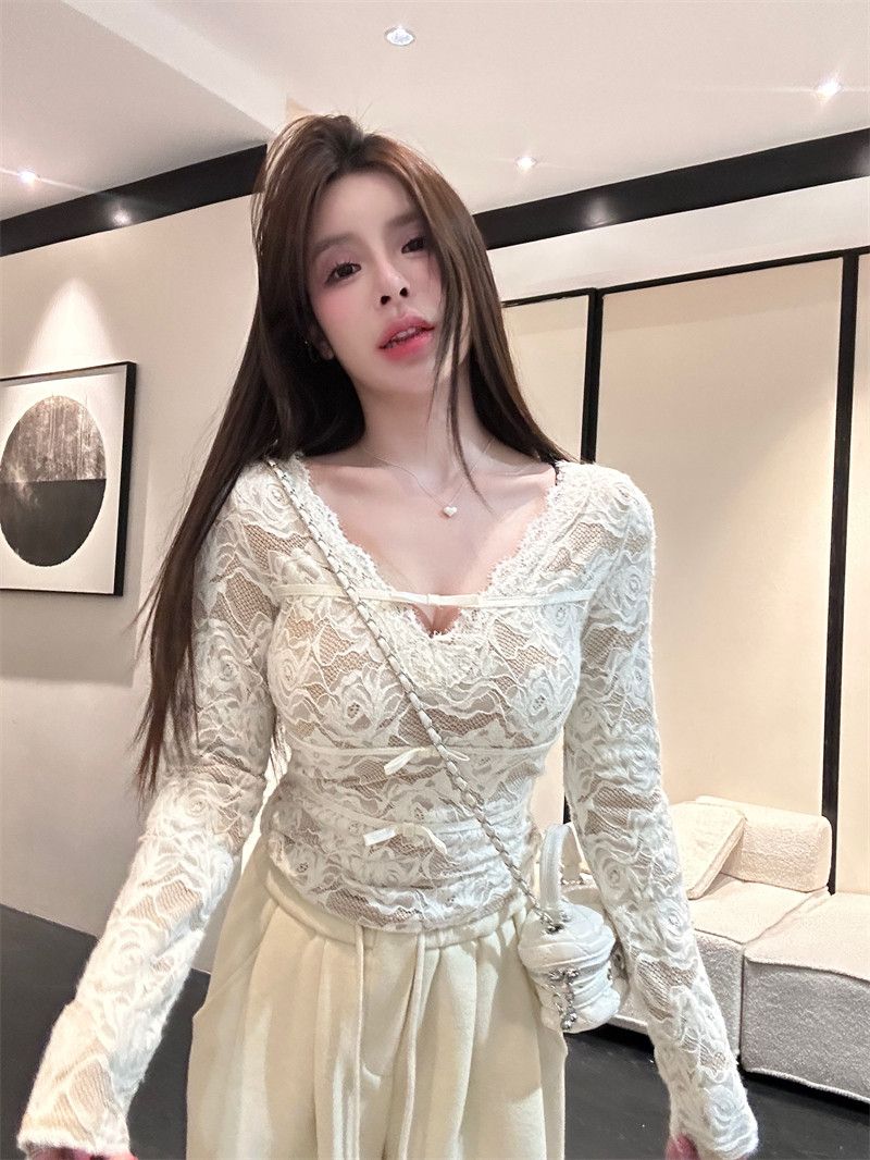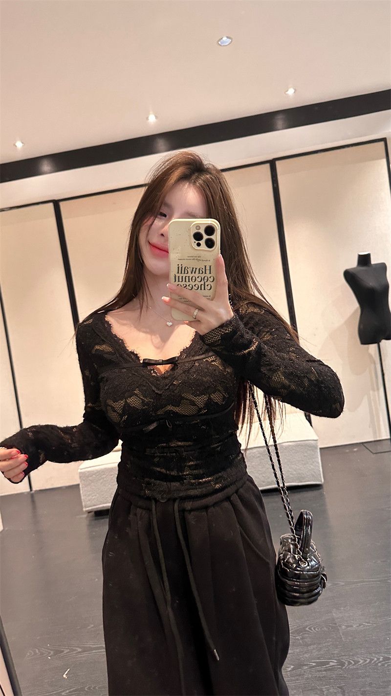 已出货 v领长袖蕾丝衫女冬季蝴蝶结内搭T恤纯欲修身打底上衣