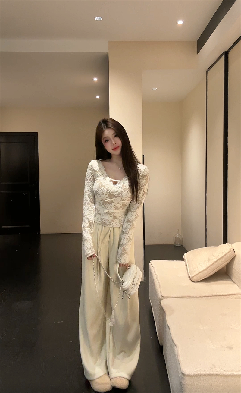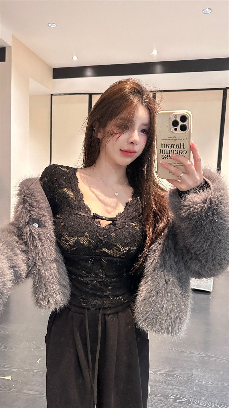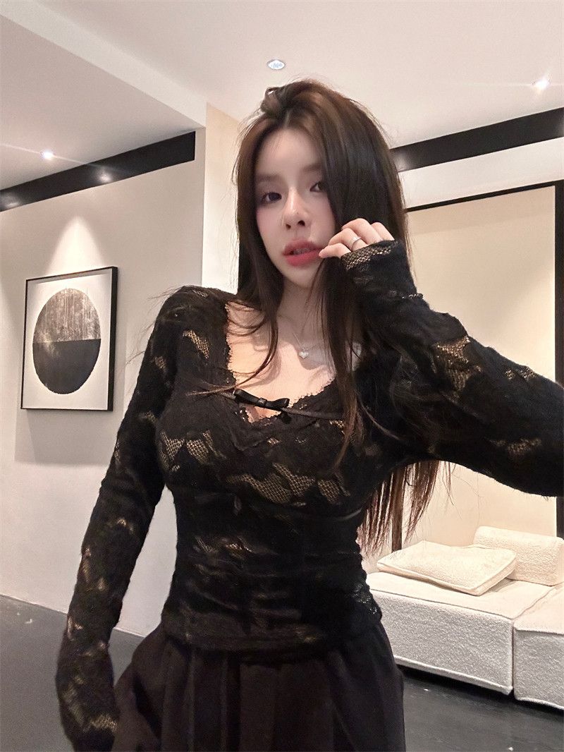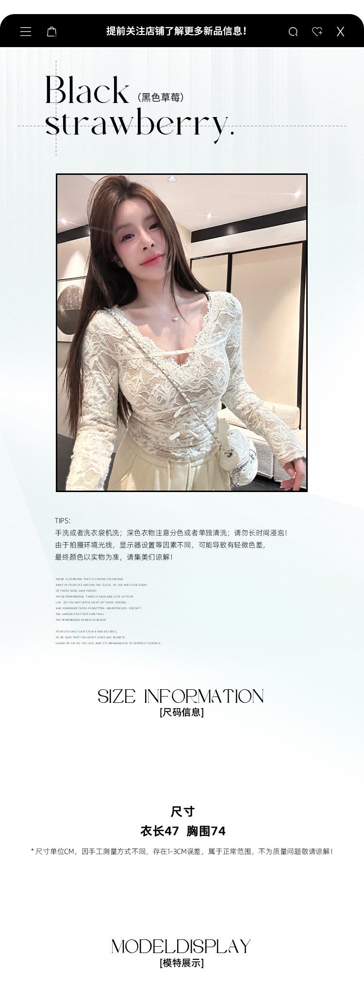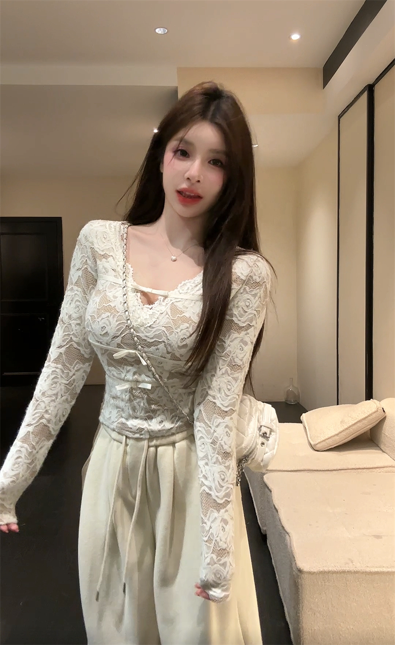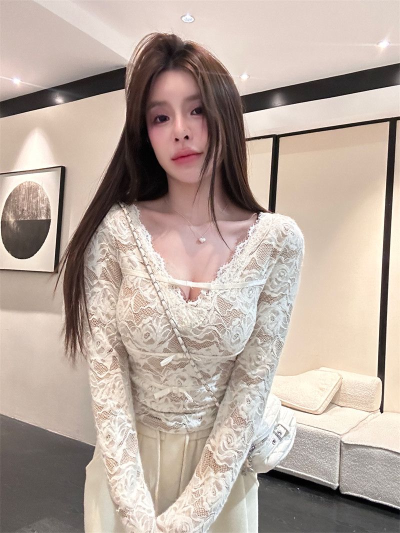 已出货 v领长袖蕾丝衫女冬季蝴蝶结内搭T恤纯欲修身打底上衣