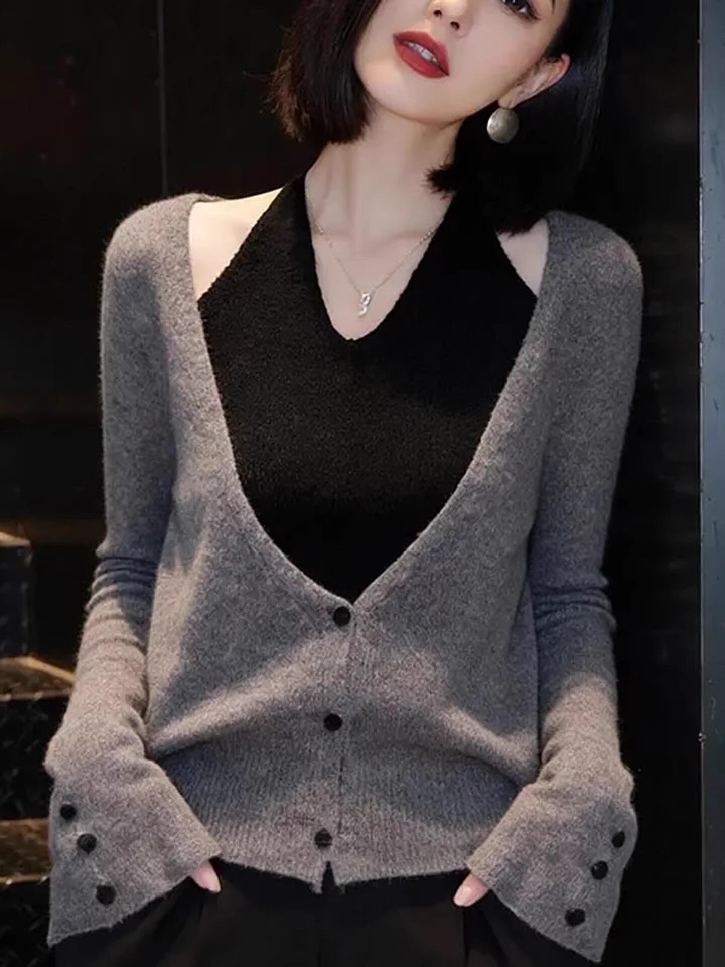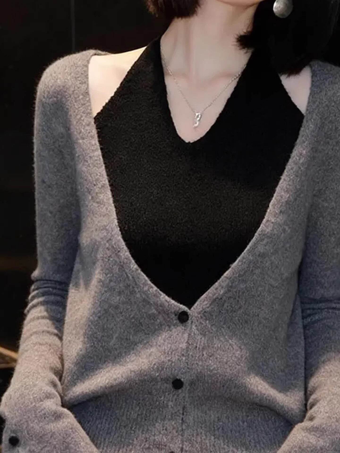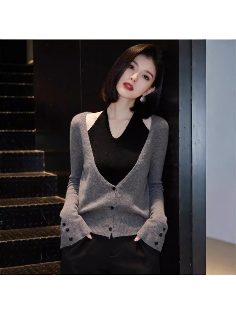 春季高级感巨好看小众不撞款灰色上衣法式设计感假两件挂脖针织衫
