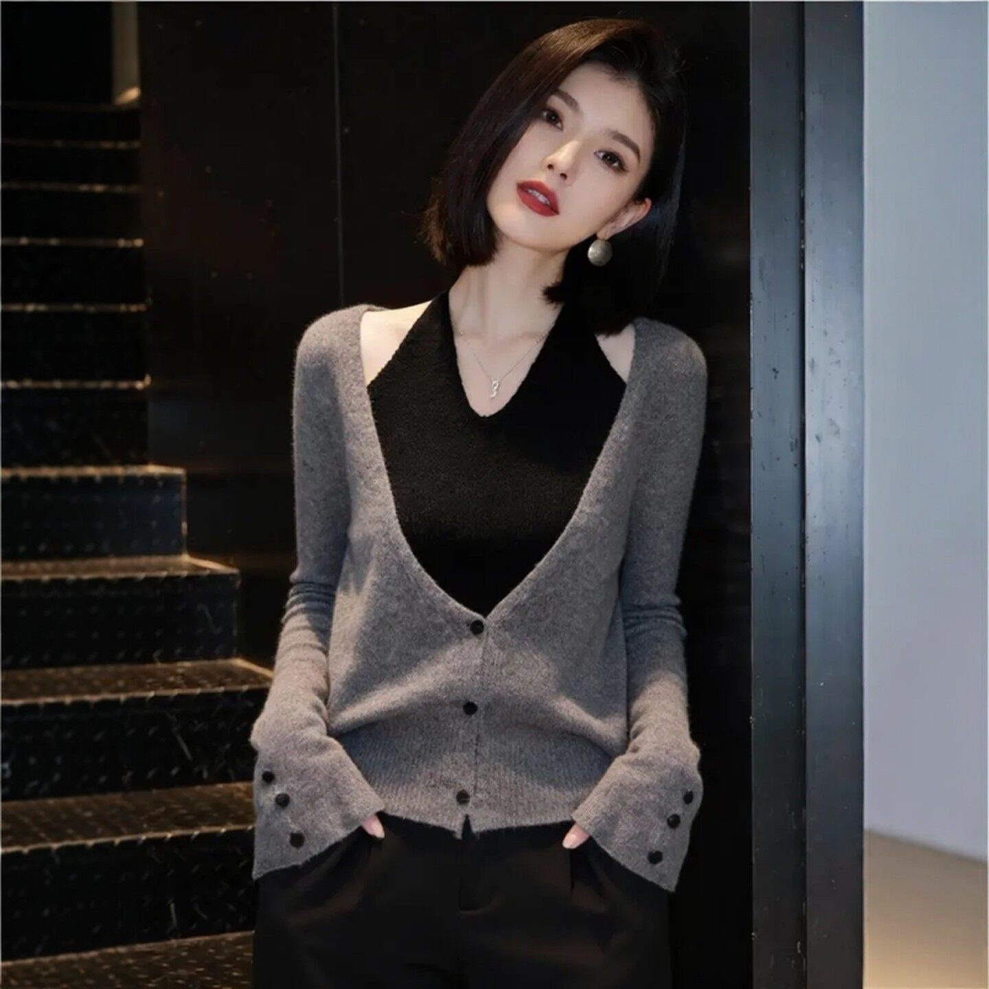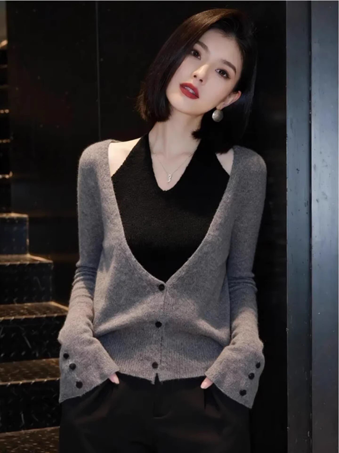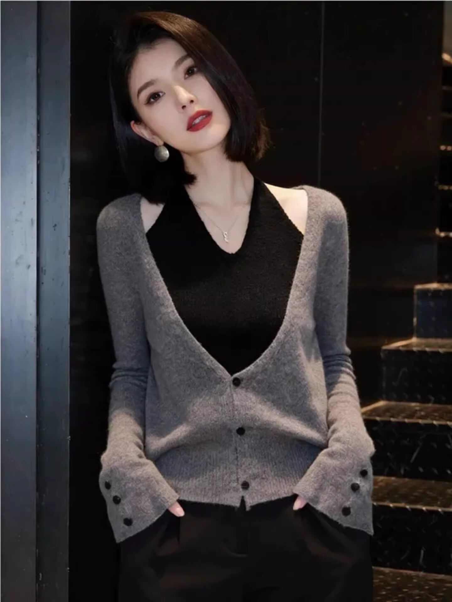 春季高级感巨好看小众不撞款灰色上衣法式设计感假两件挂脖针织衫