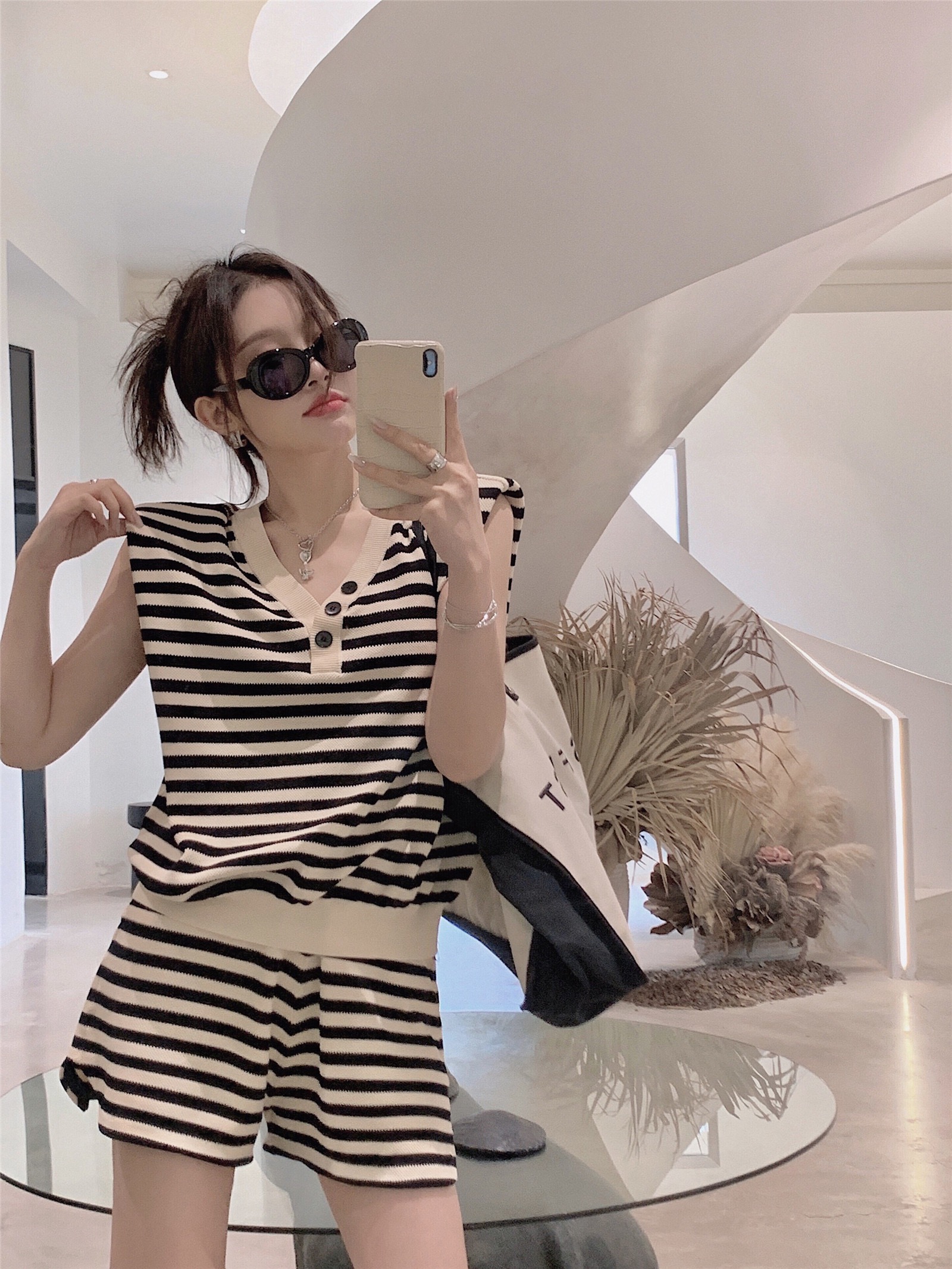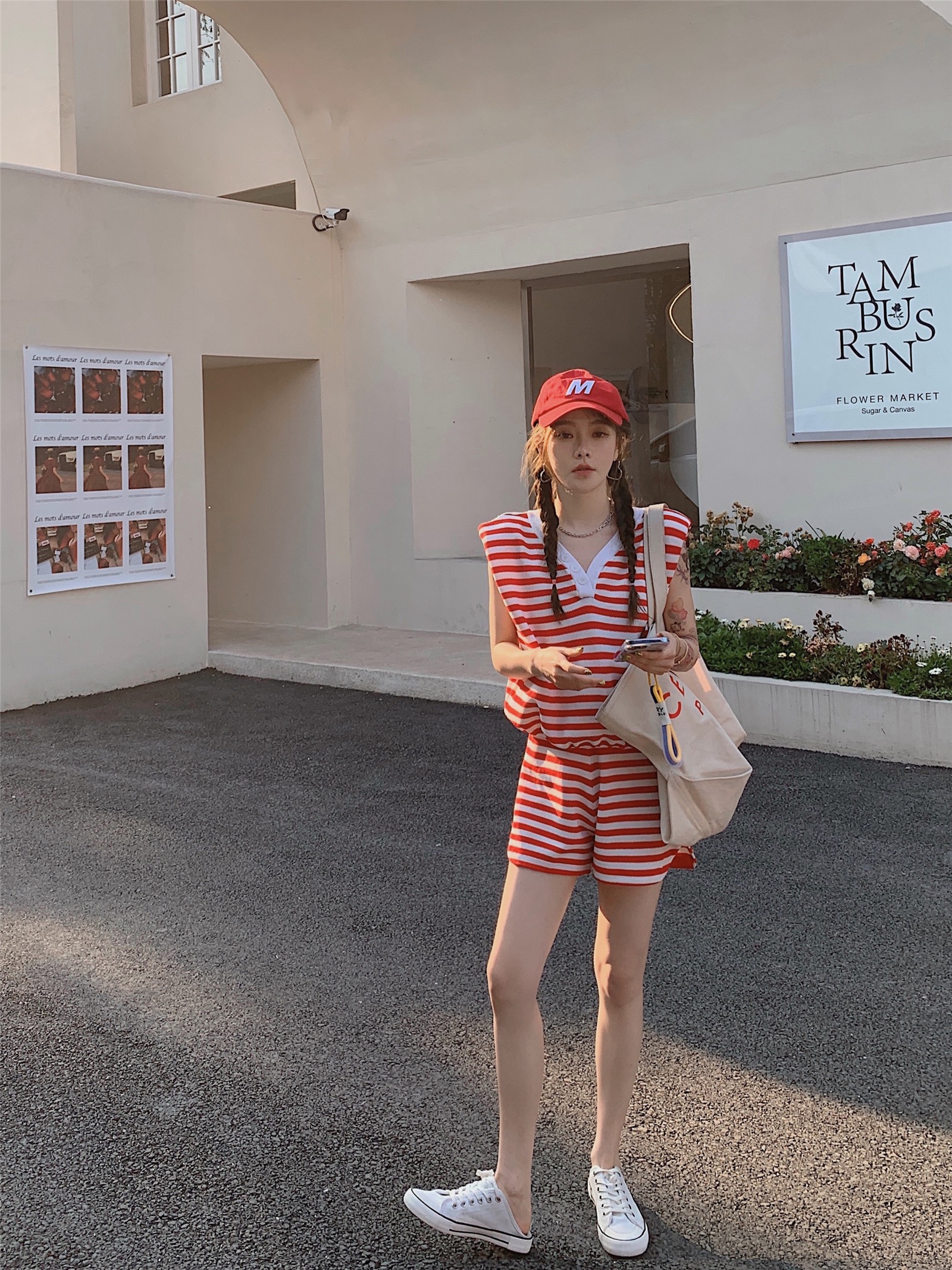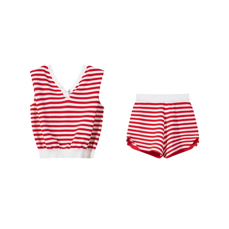 网红小香风时尚休闲无袖上衣+盐系穿搭条纹短裤两件套装女夏新款
