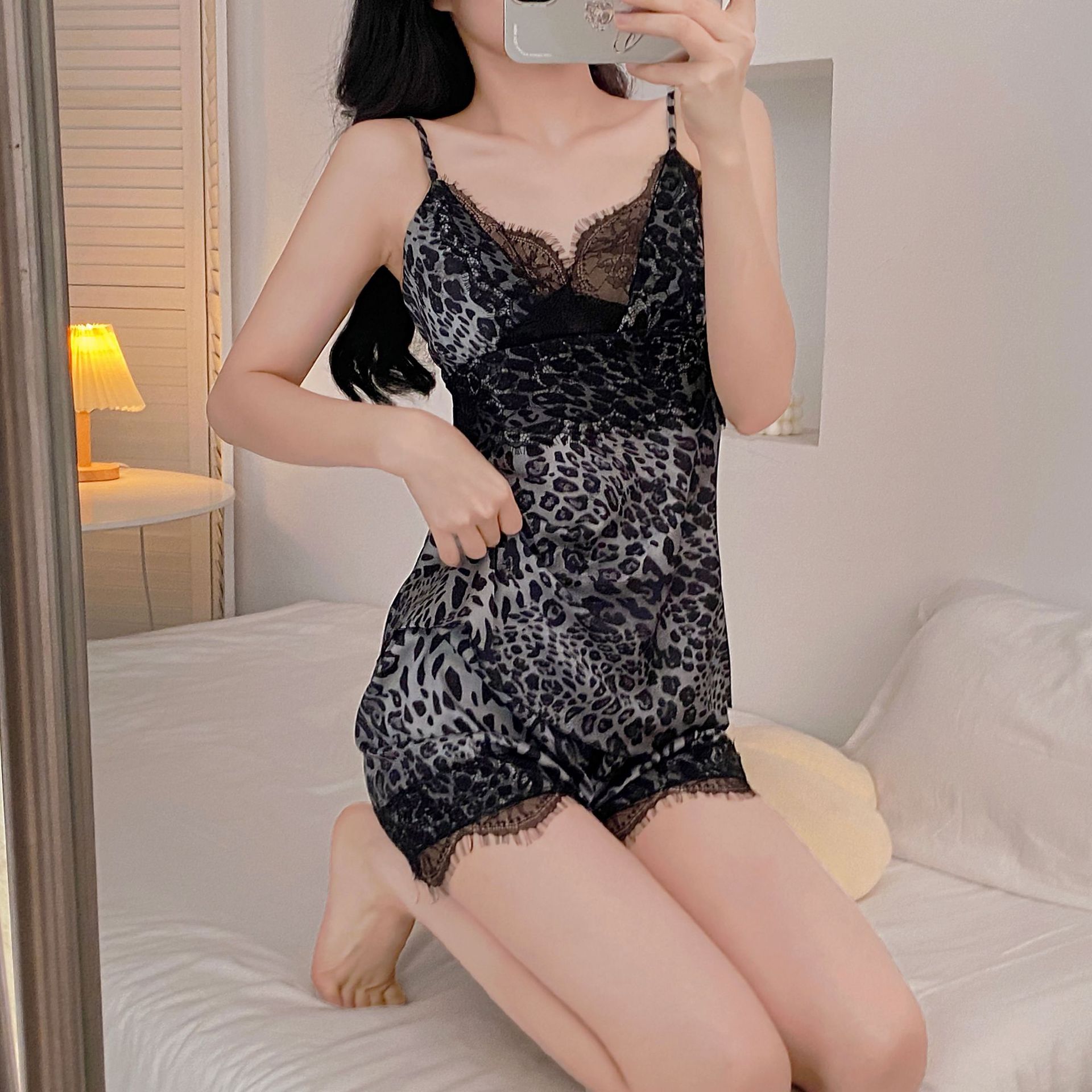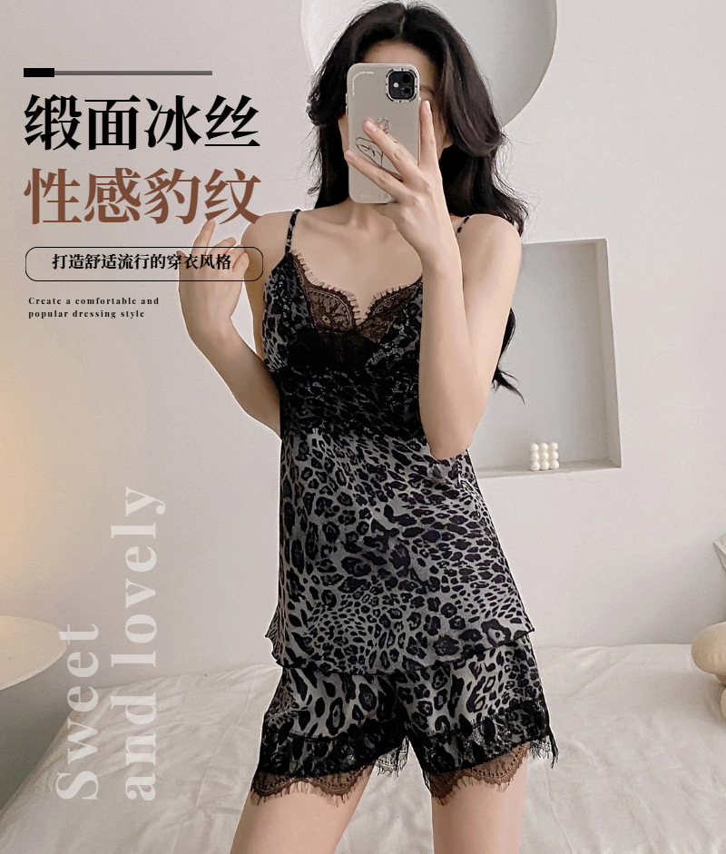 卡馨 夏季新款冰丝睡衣女性感蕾丝豹纹吊带短裤带胸垫套装