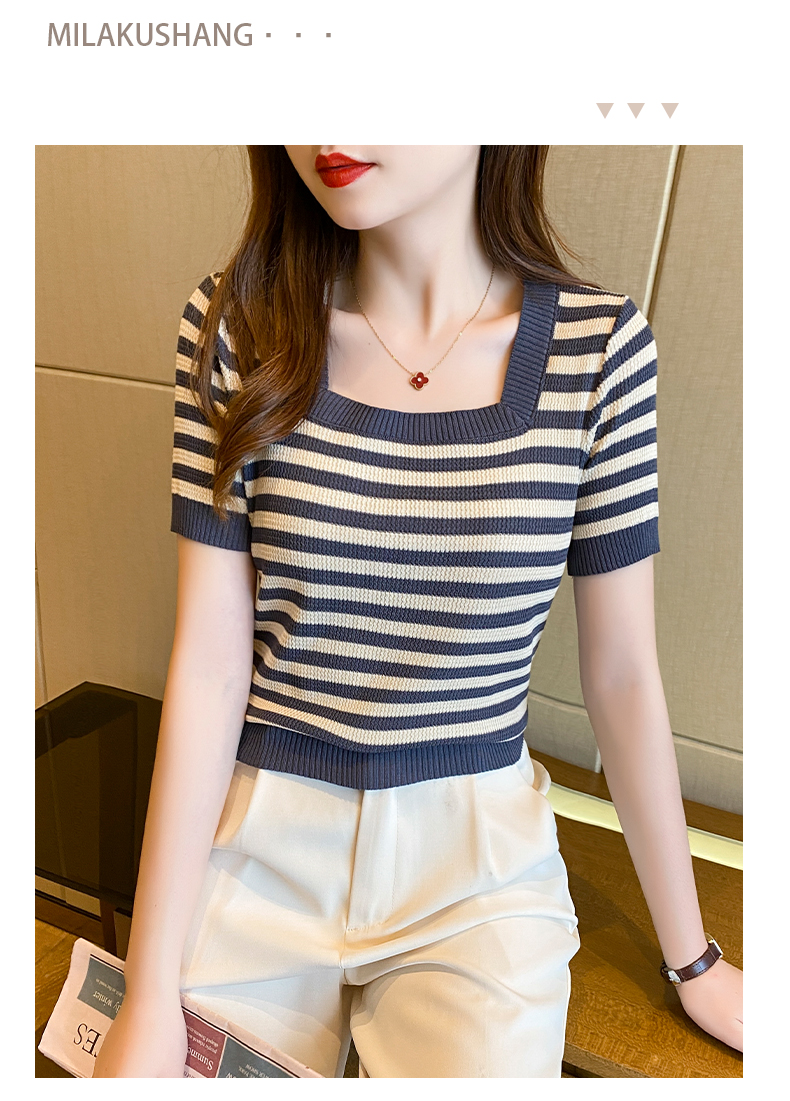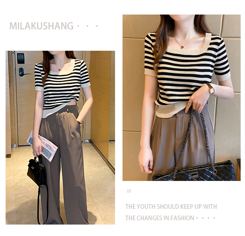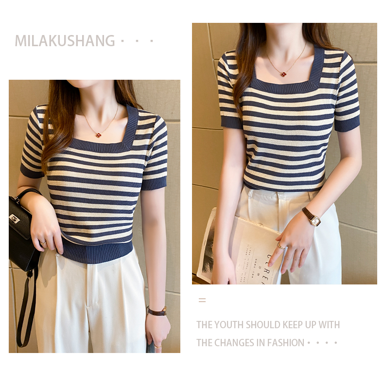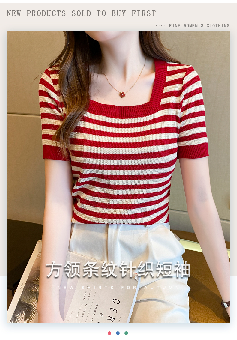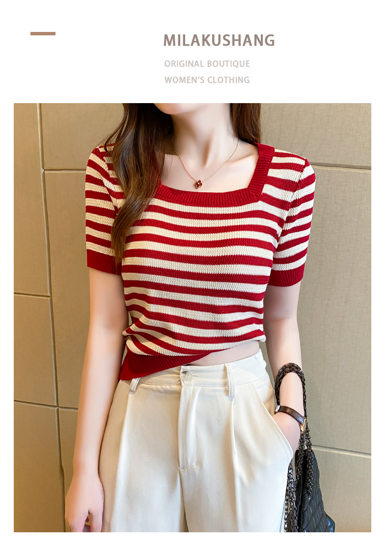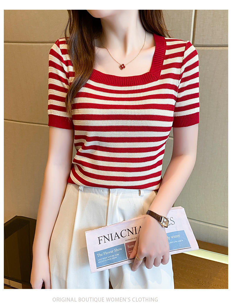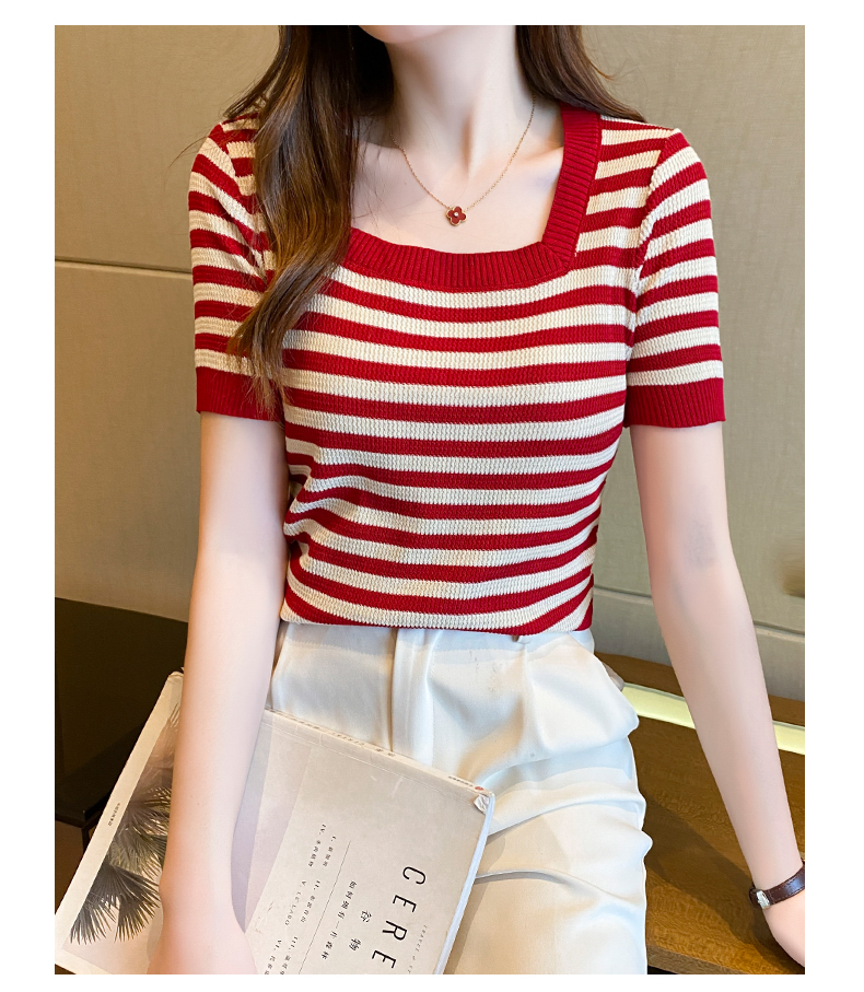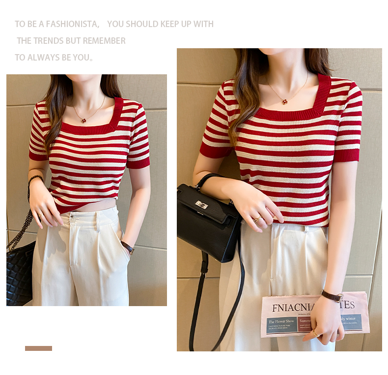 红色条纹方领短袖t恤女夏季新款撞色冰丝针织衫修身显瘦短款上衣