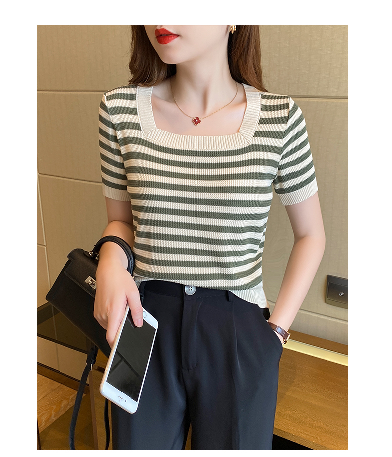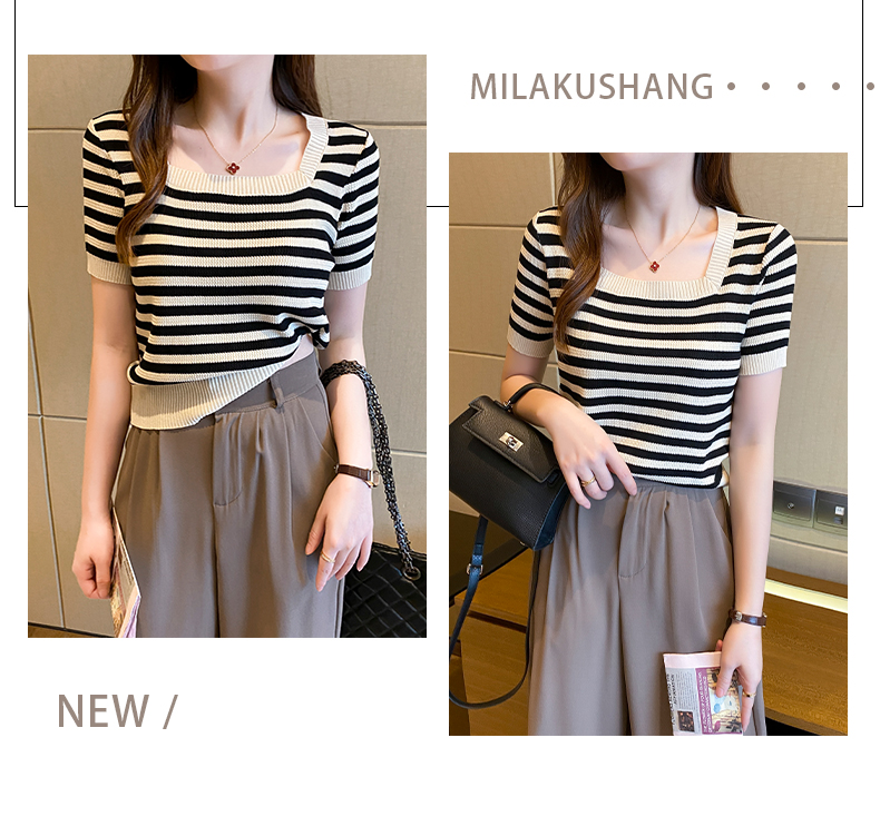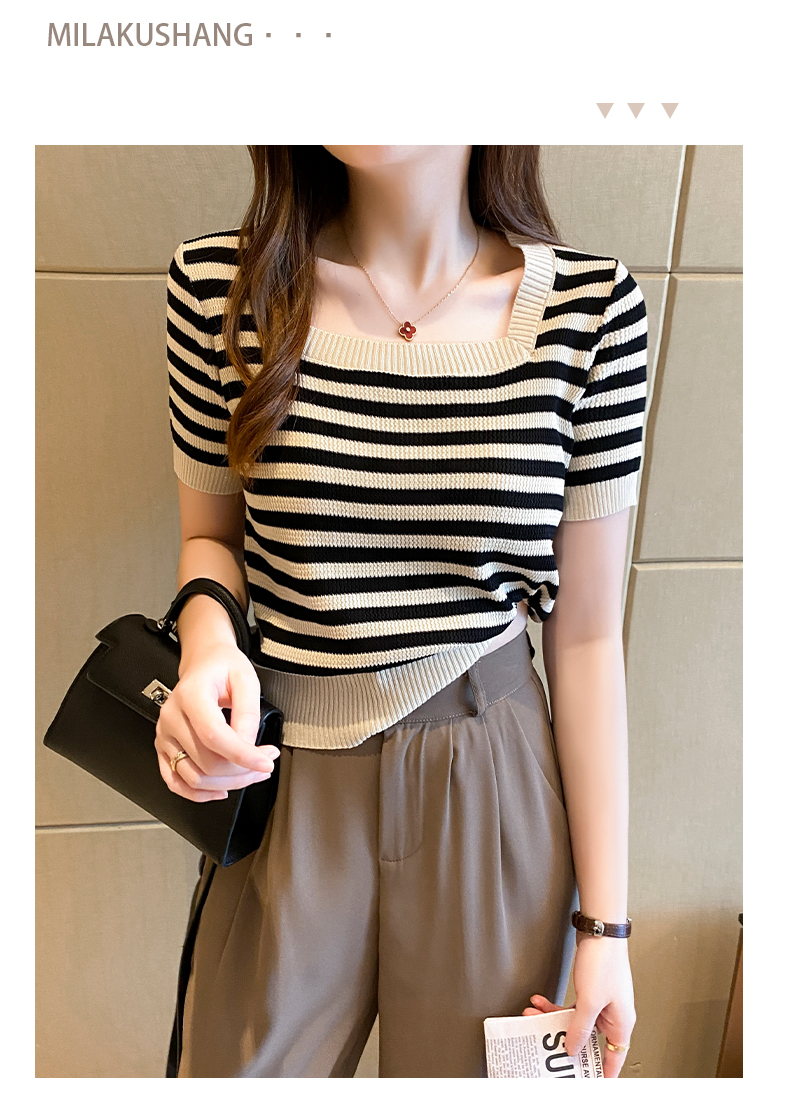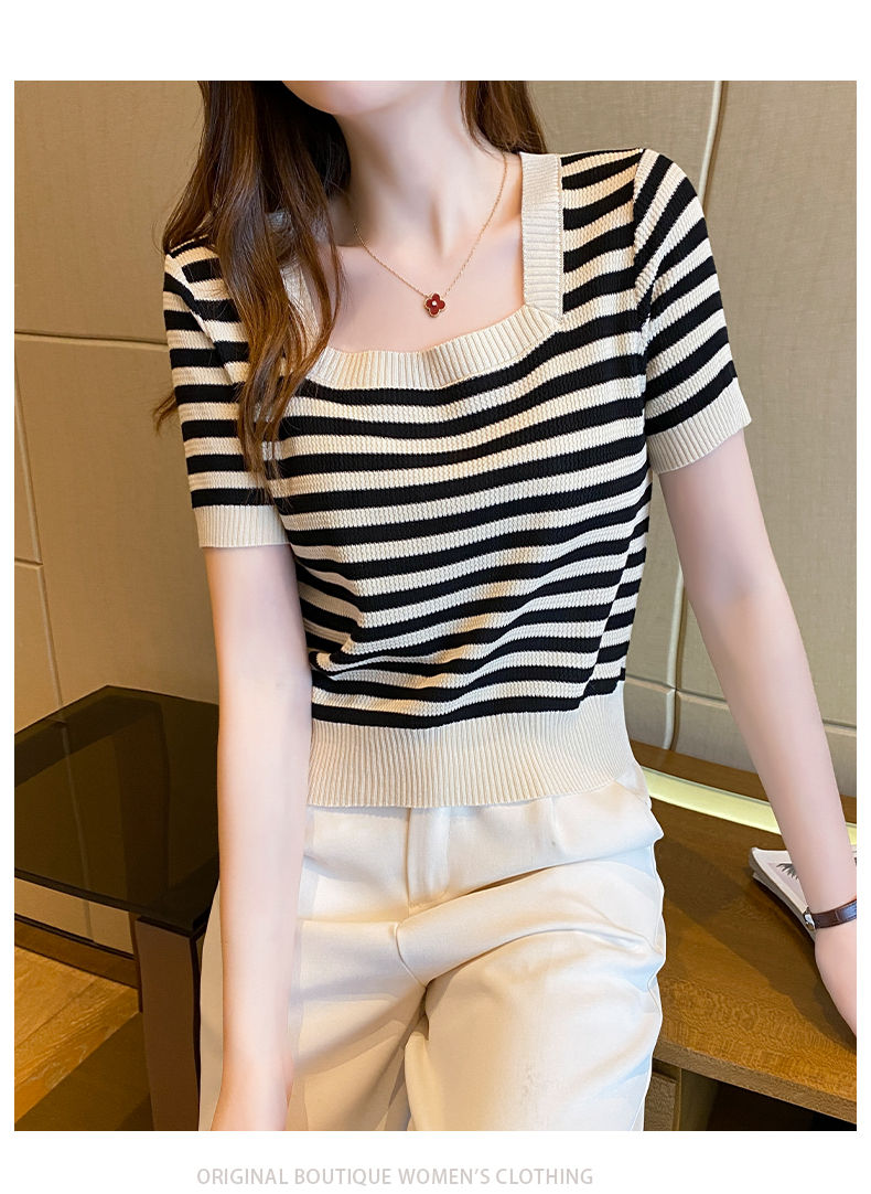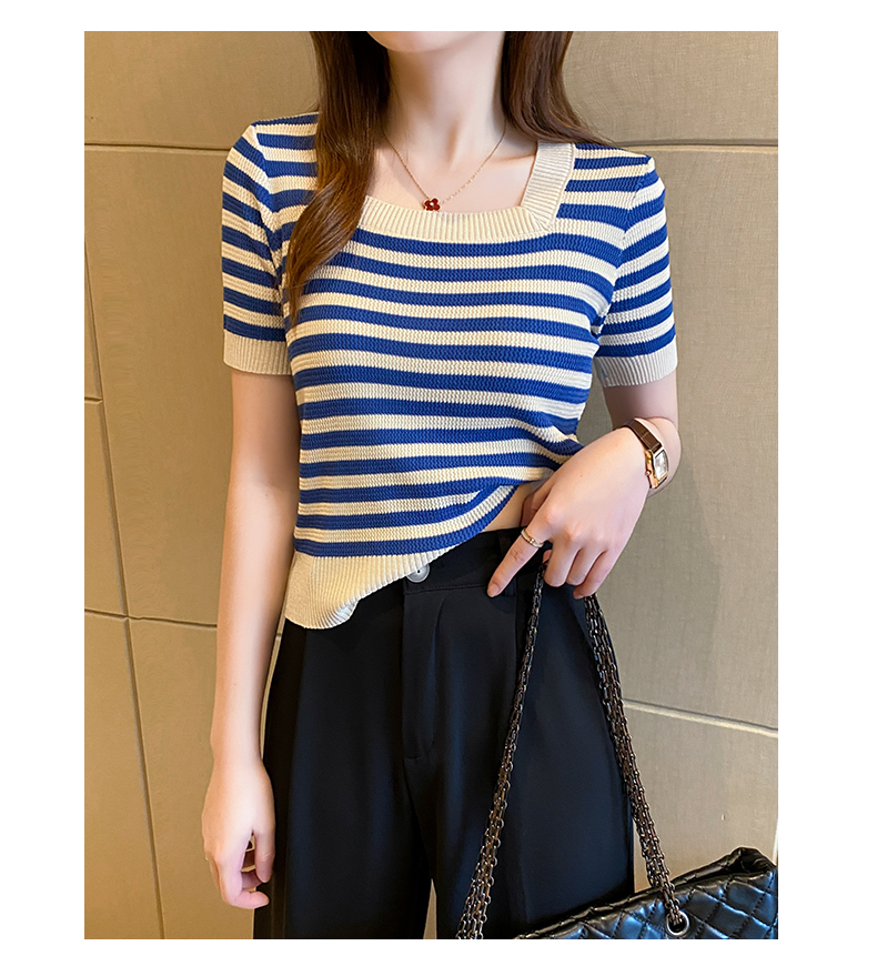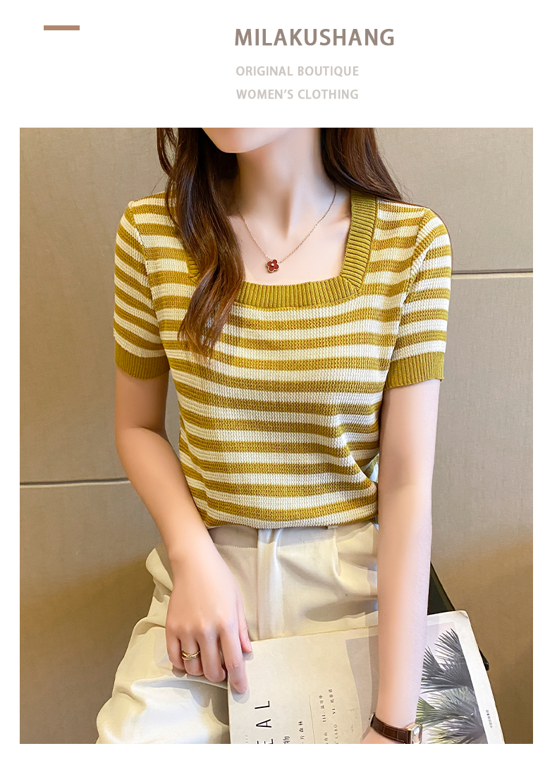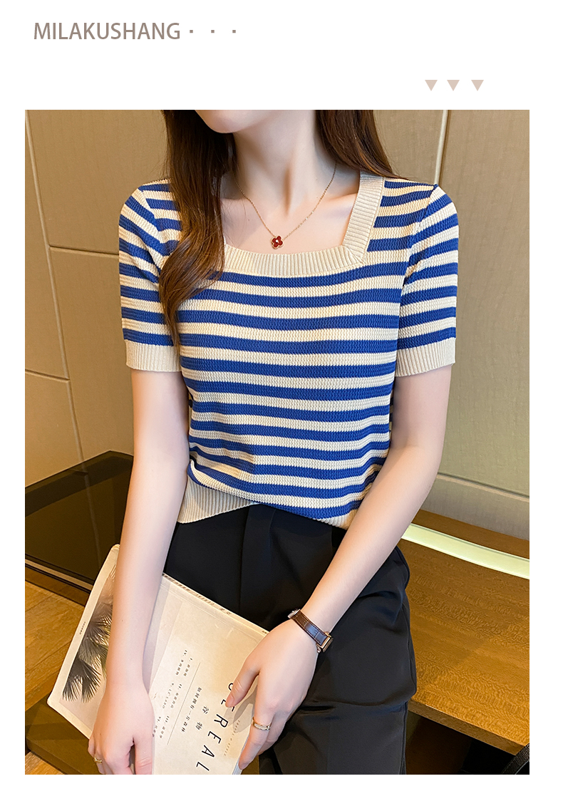 红色条纹方领短袖t恤女夏季新款撞色冰丝针织衫修身显瘦短款上衣
