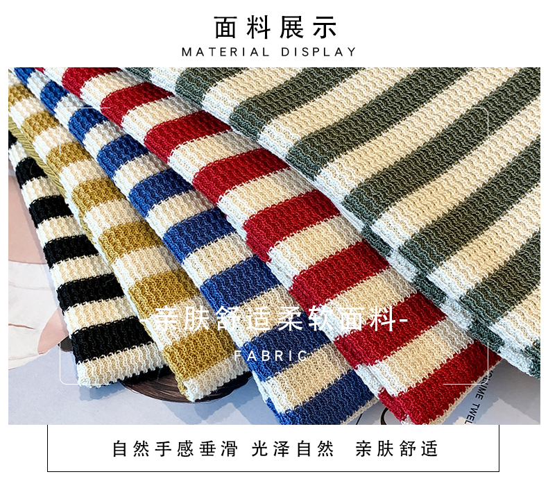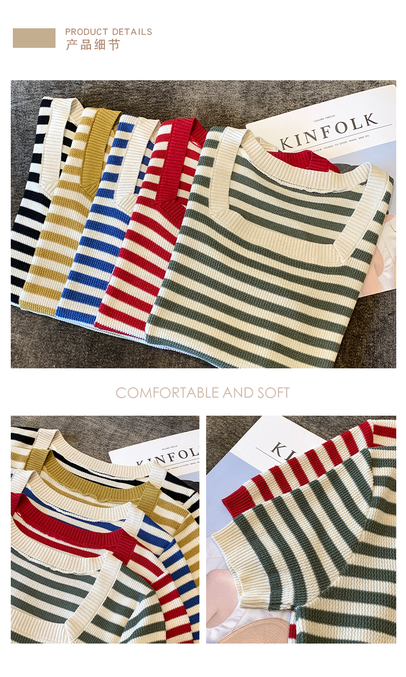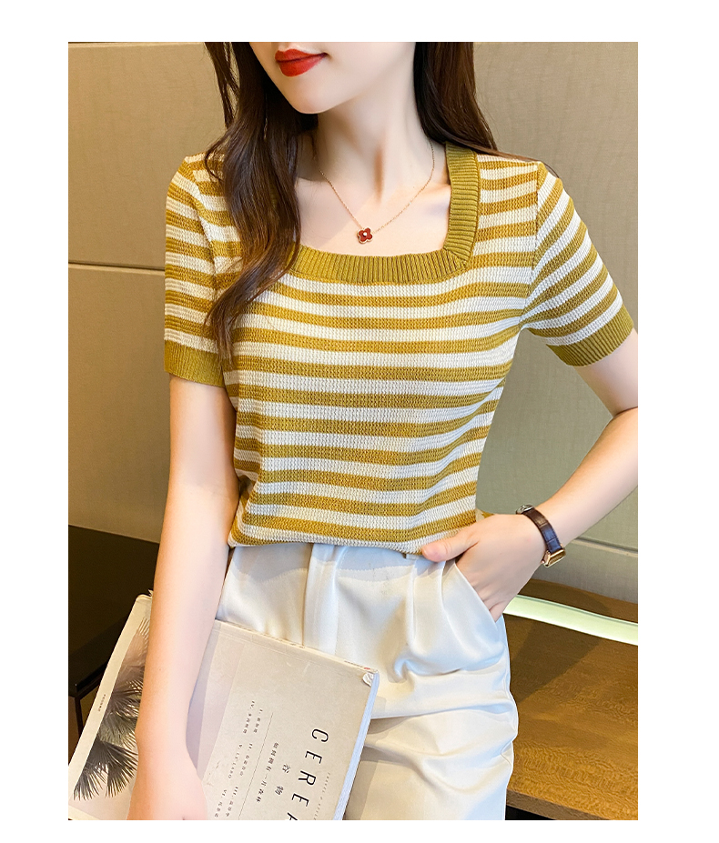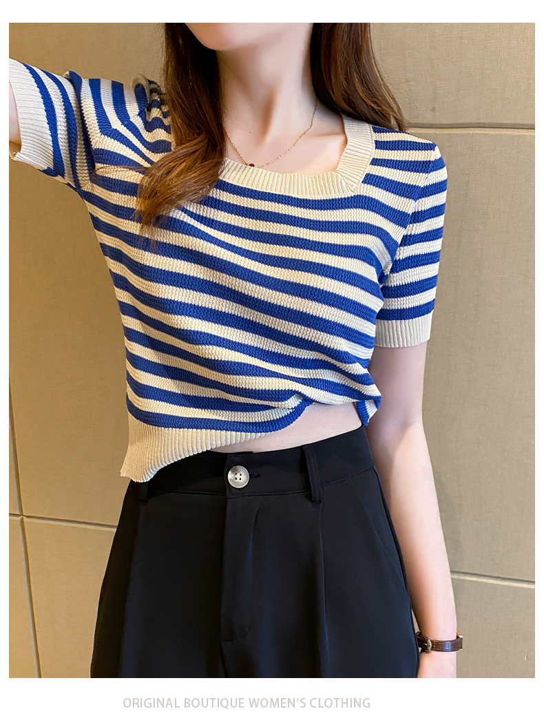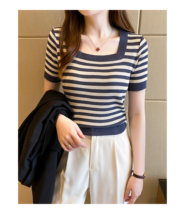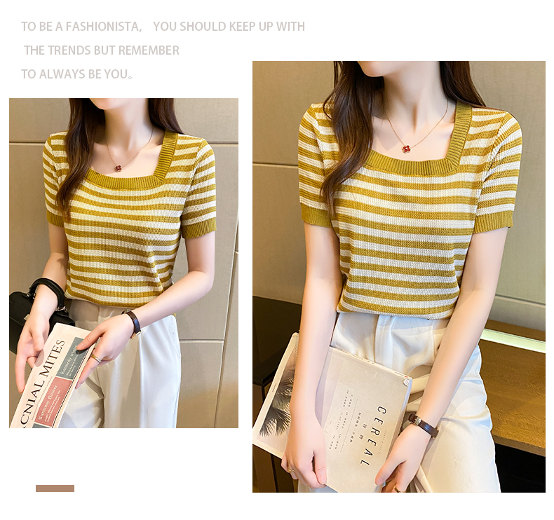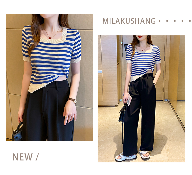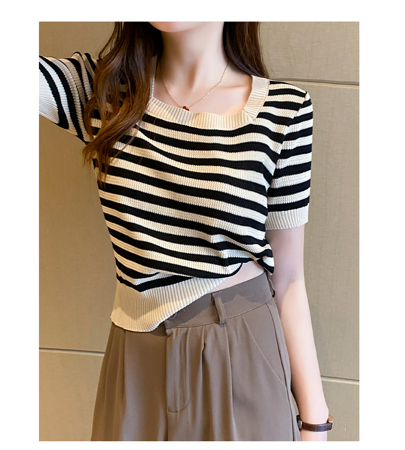 红色条纹方领短袖t恤女夏季新款撞色冰丝针织衫修身显瘦短款上衣