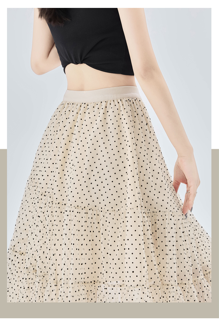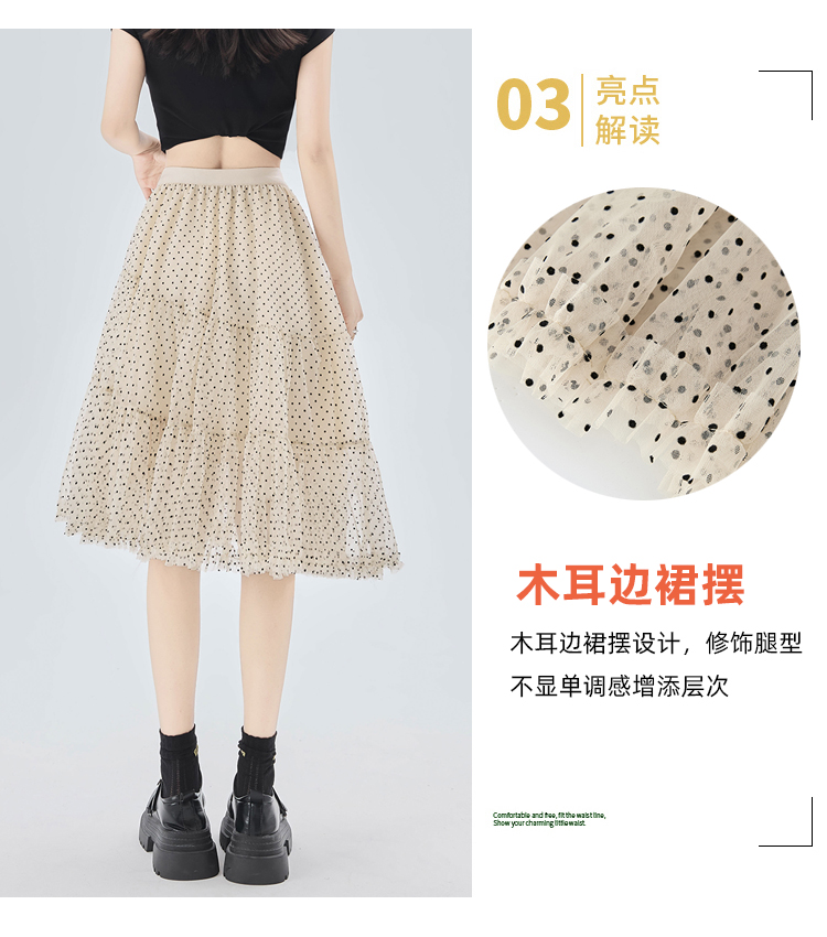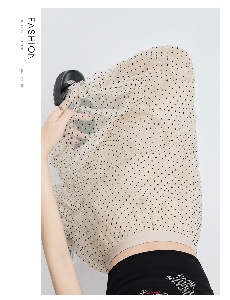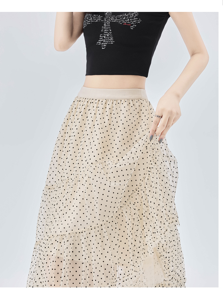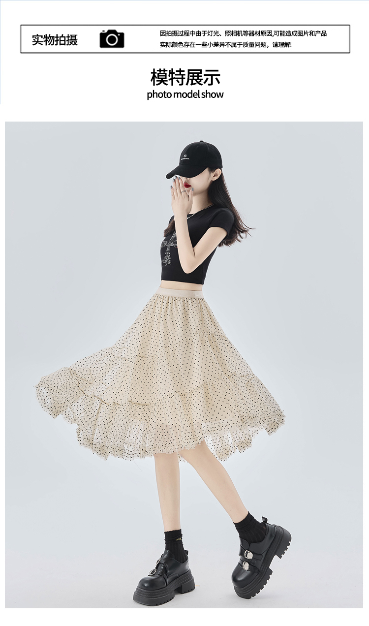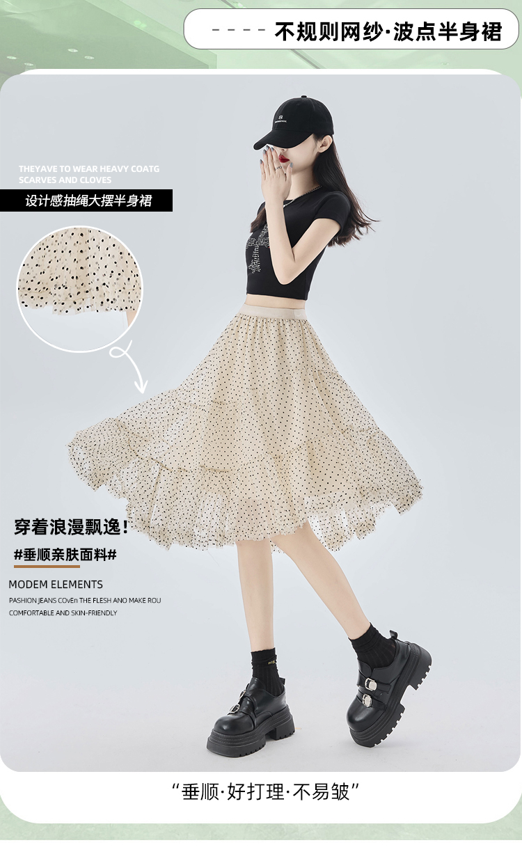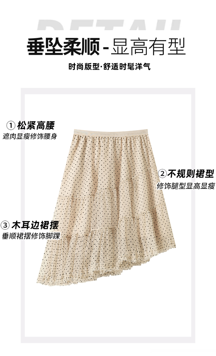 实拍 不规则网纱波点百褶半身裙女夏季高腰显瘦木耳边a字中长裙