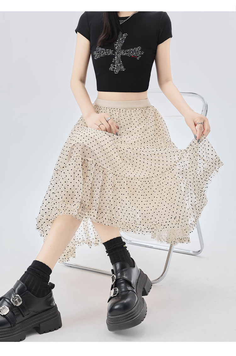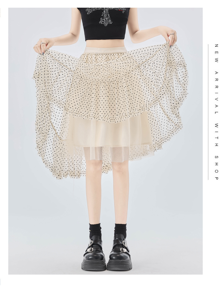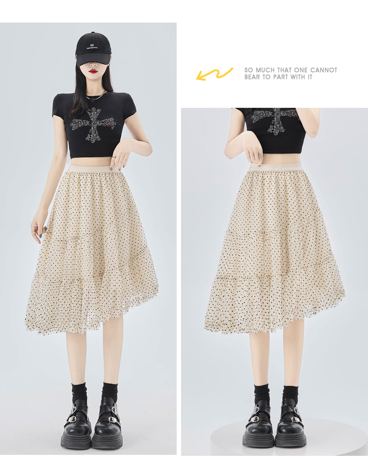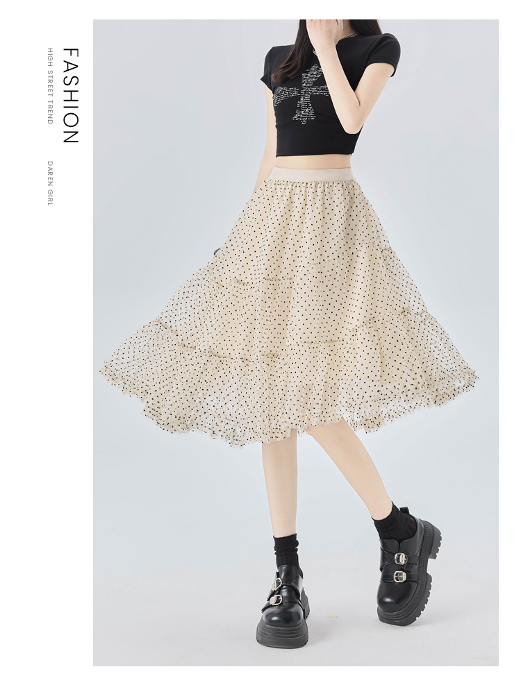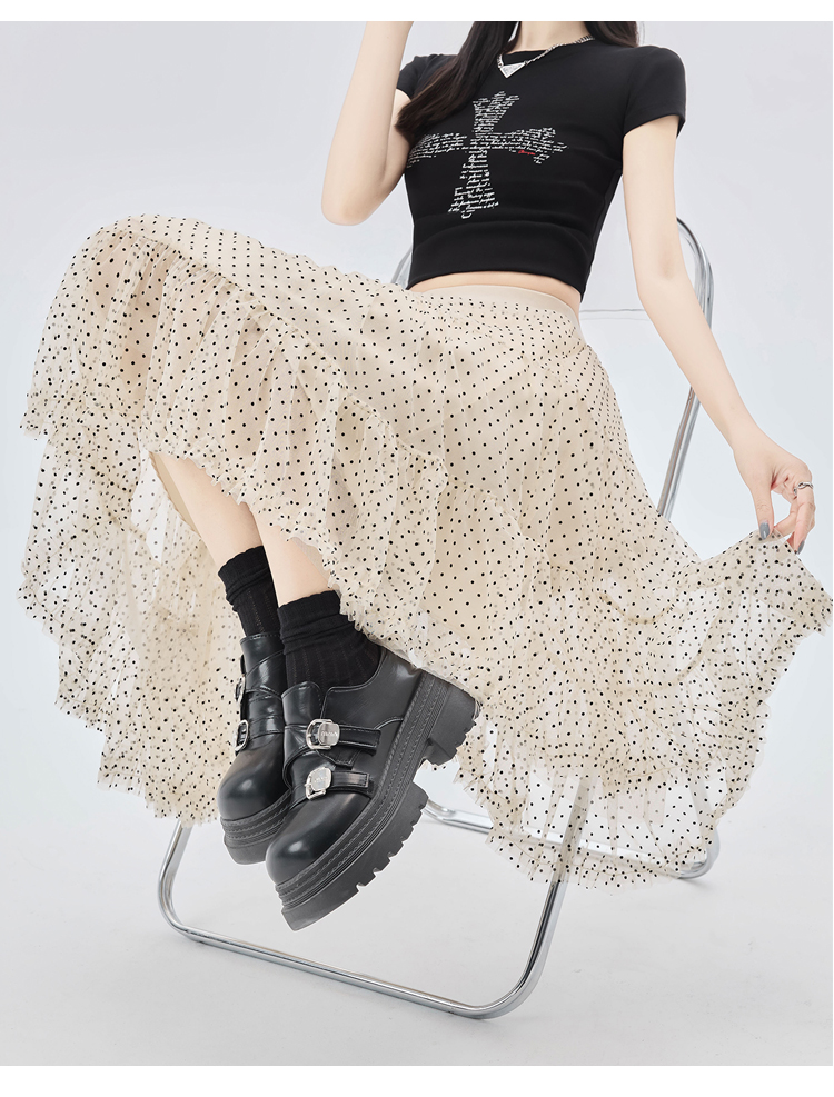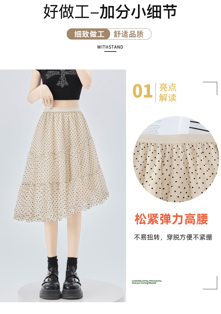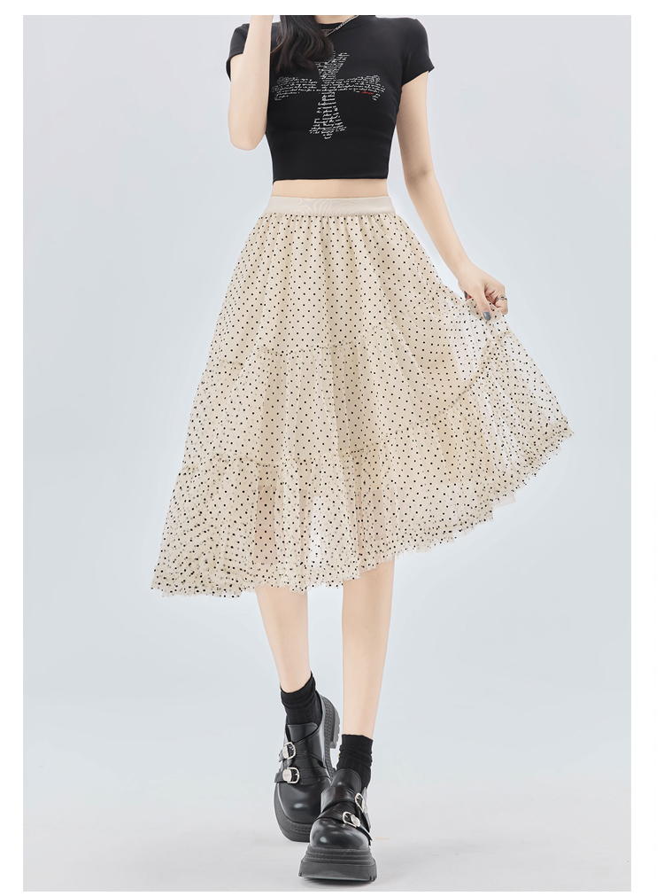 实拍 不规则网纱波点百褶半身裙女夏季高腰显瘦木耳边a字中长裙