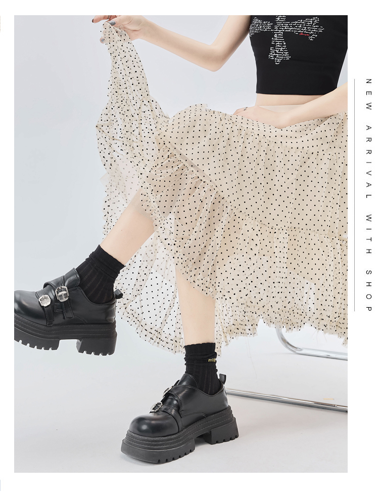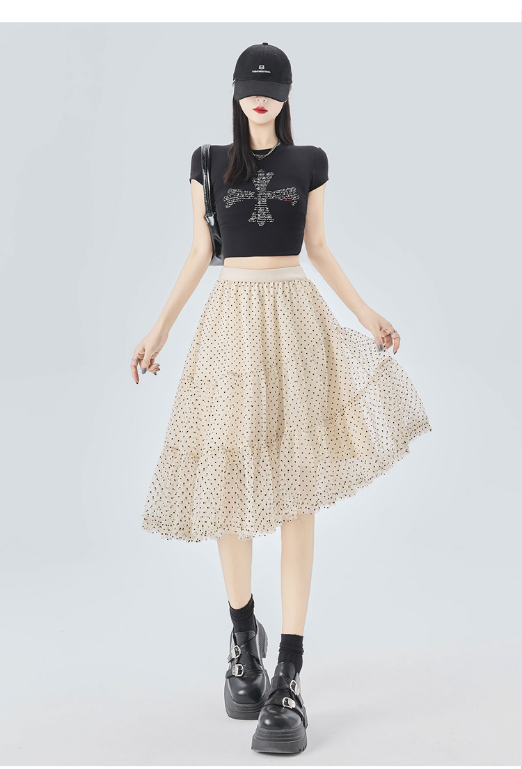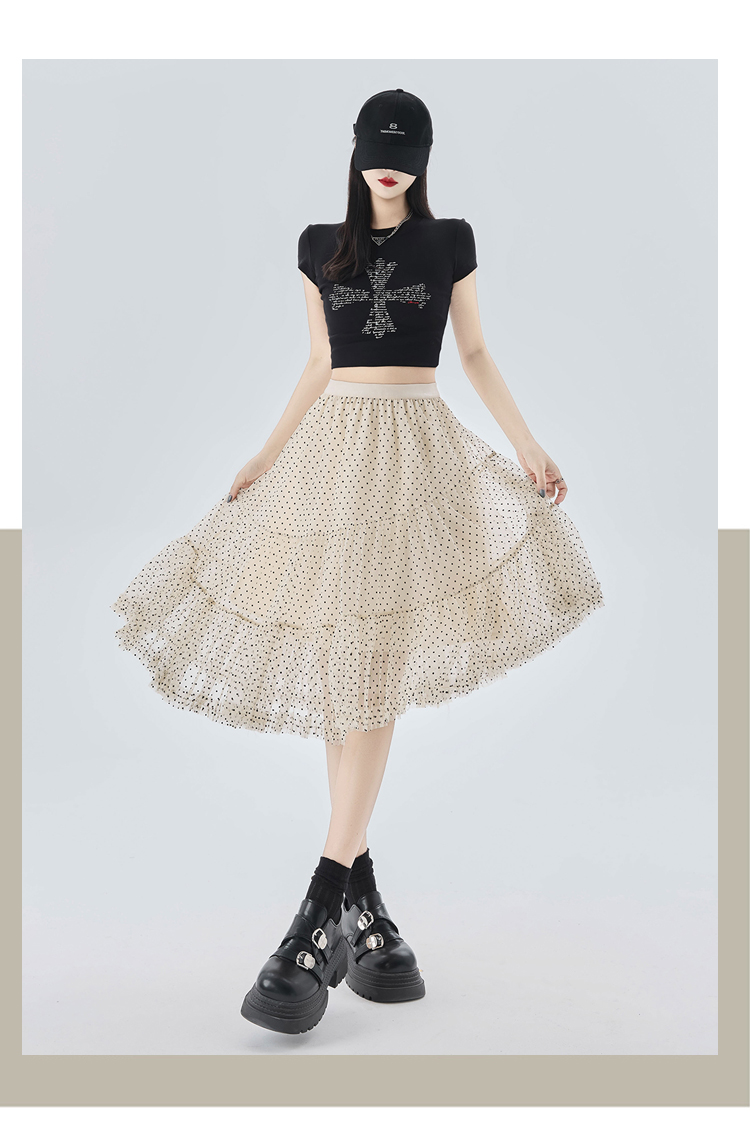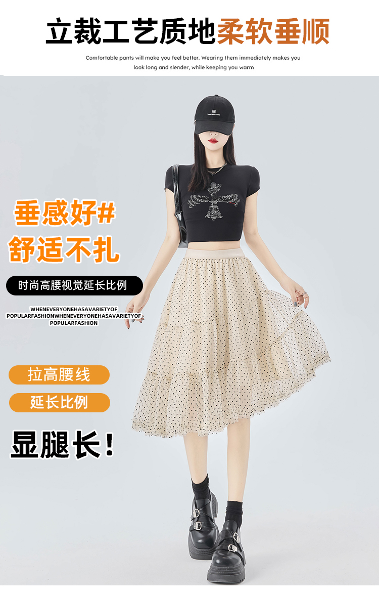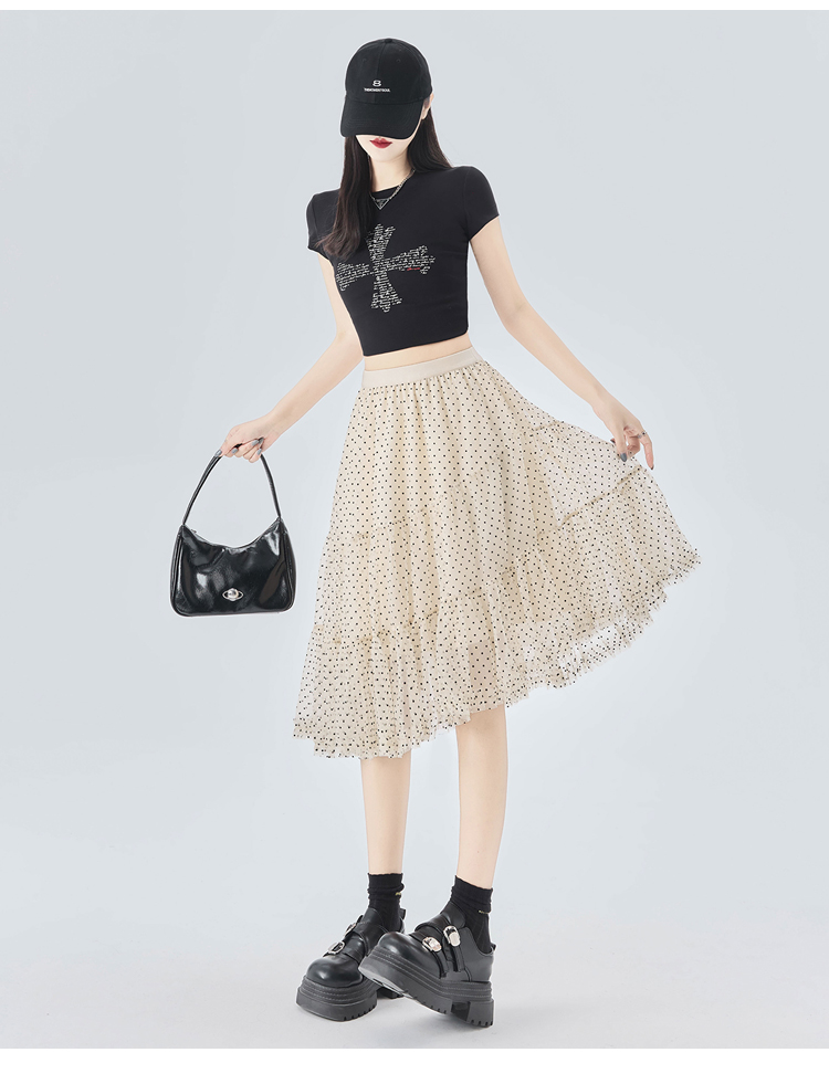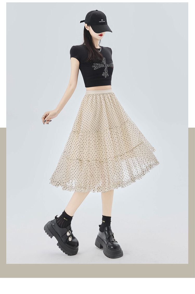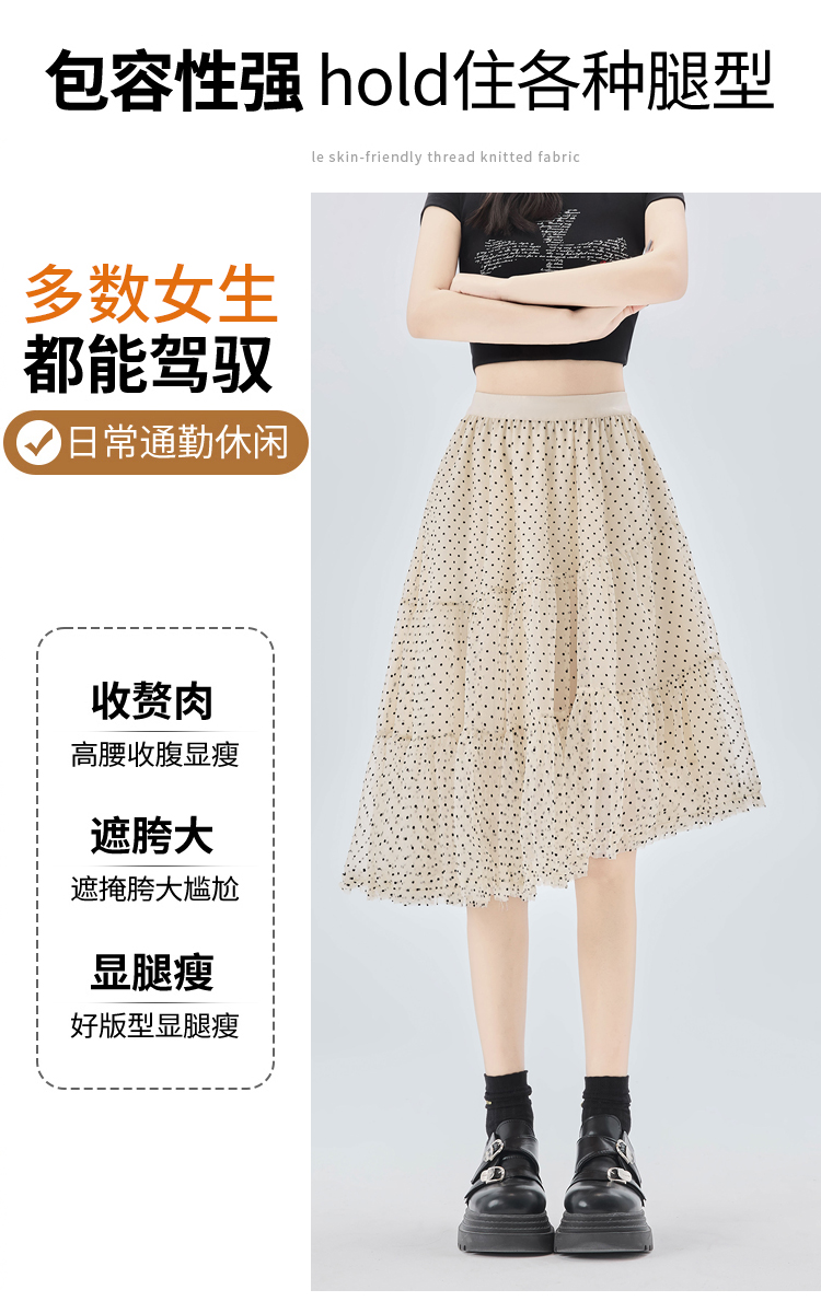 实拍 不规则网纱波点百褶半身裙女夏季高腰显瘦木耳边a字中长裙
