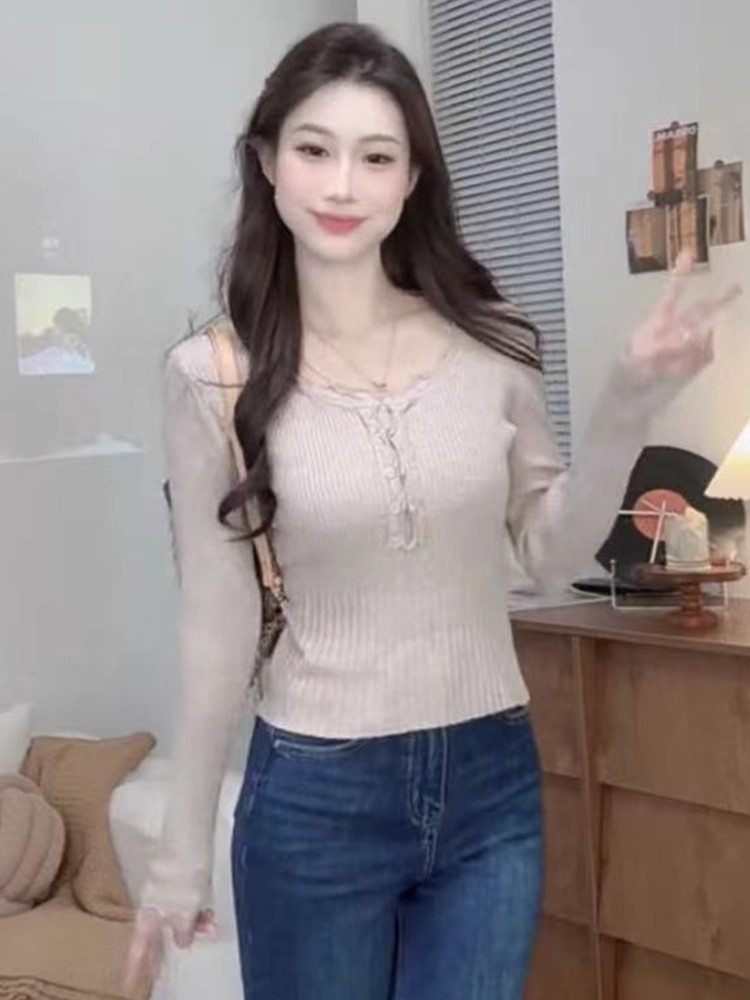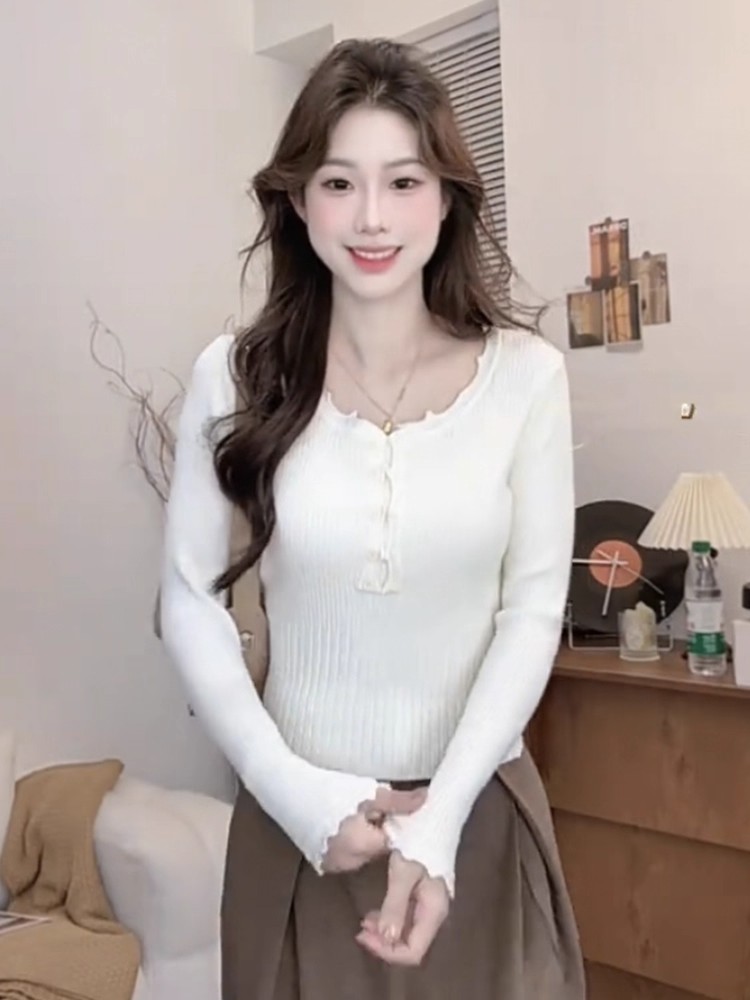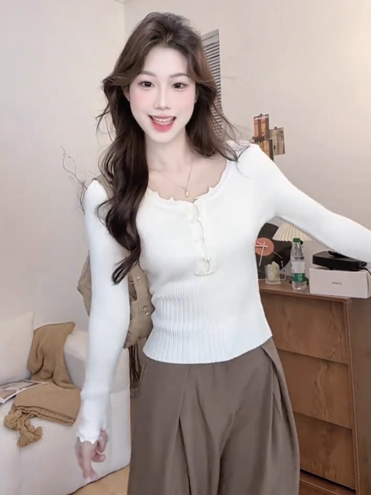 法式浪漫风半纽扣花边领毛针织衫女2026春秋新款设计感百搭短上衣