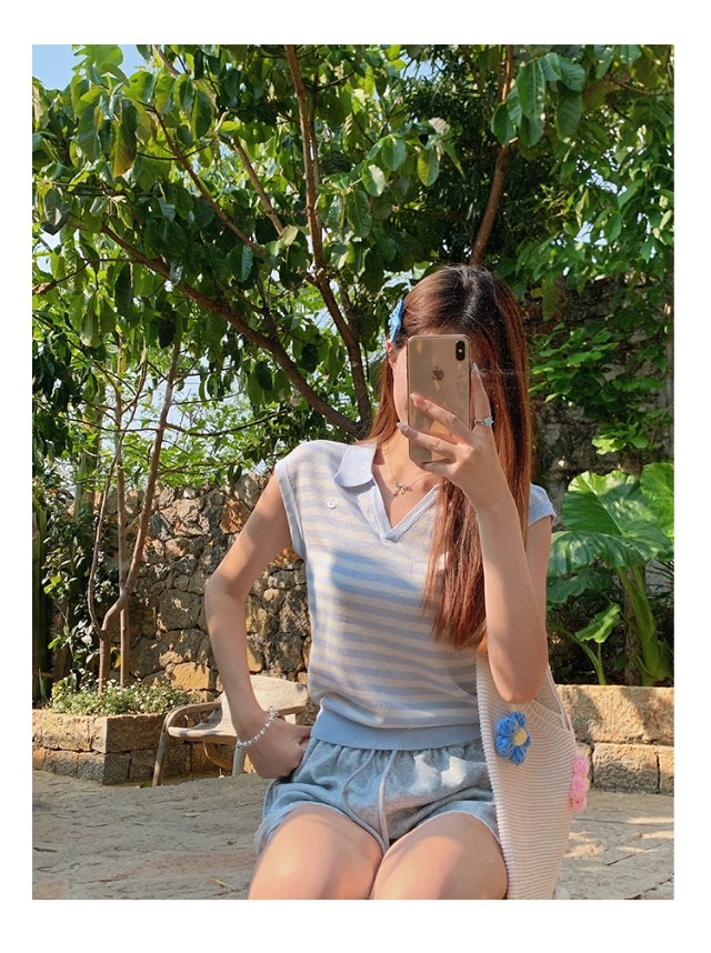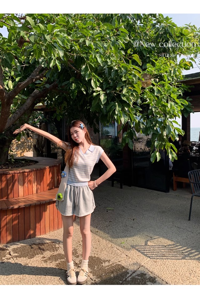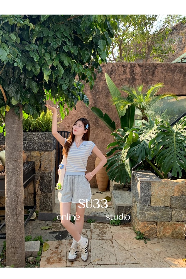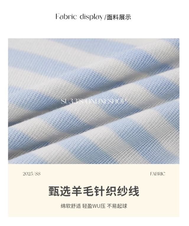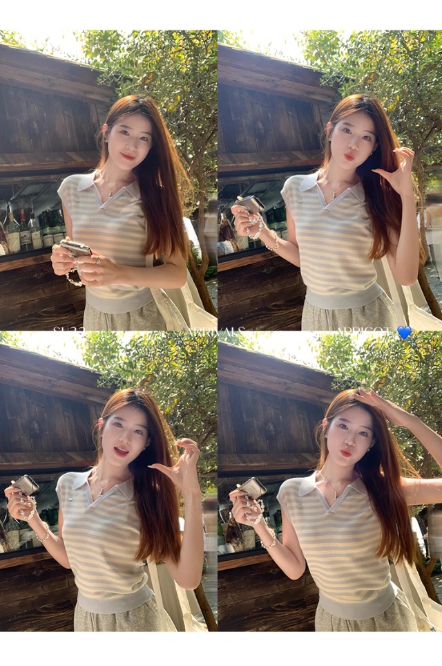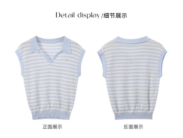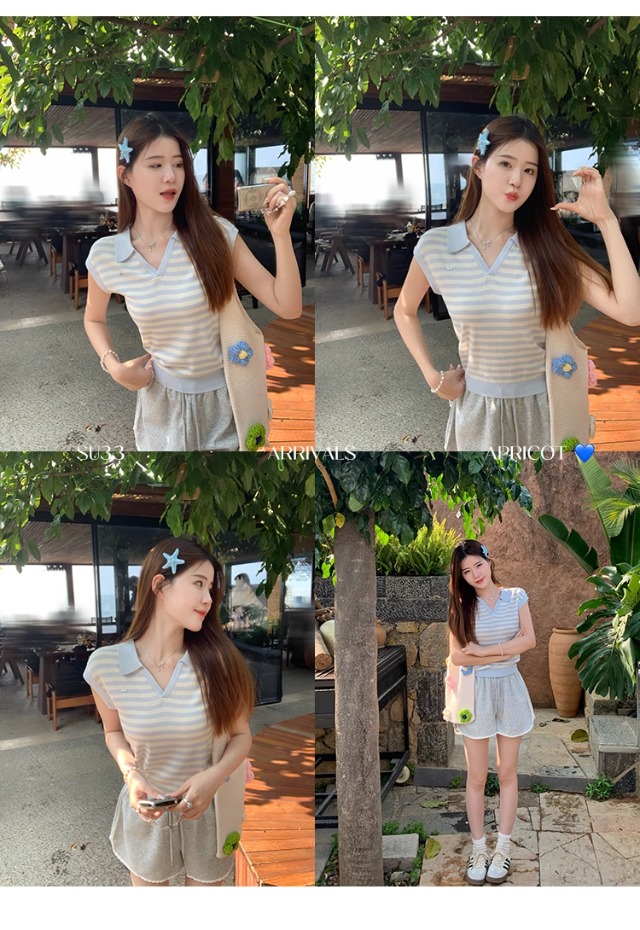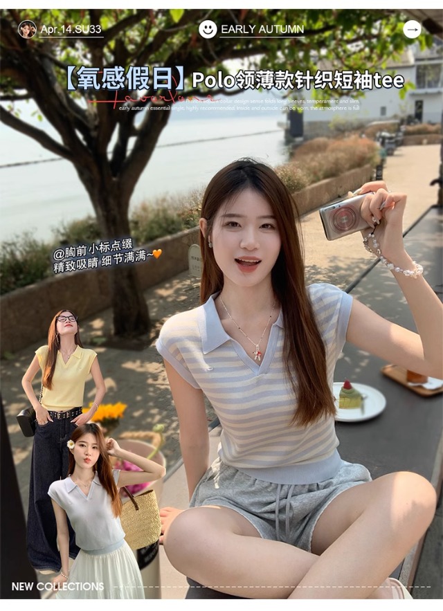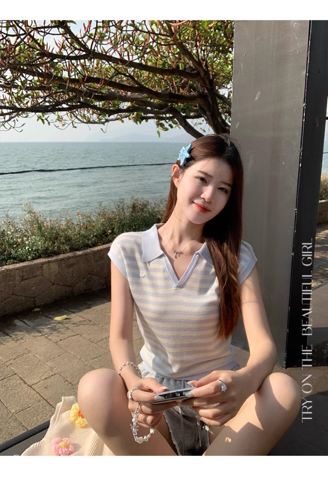 针织短袖女2026新款夏季薄款polo领t恤高级感短款条纹上衣