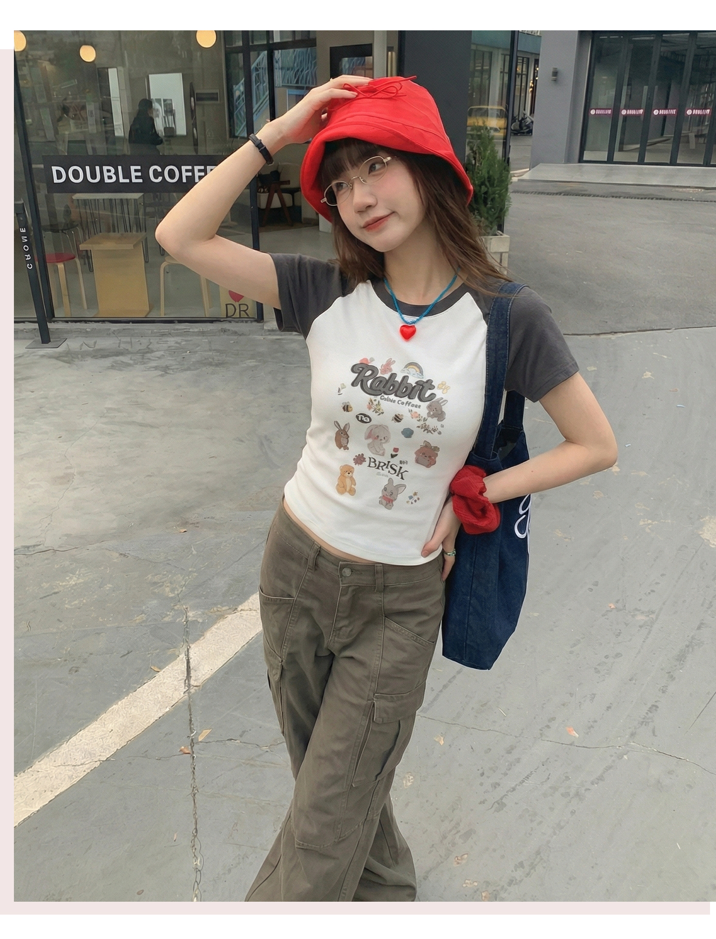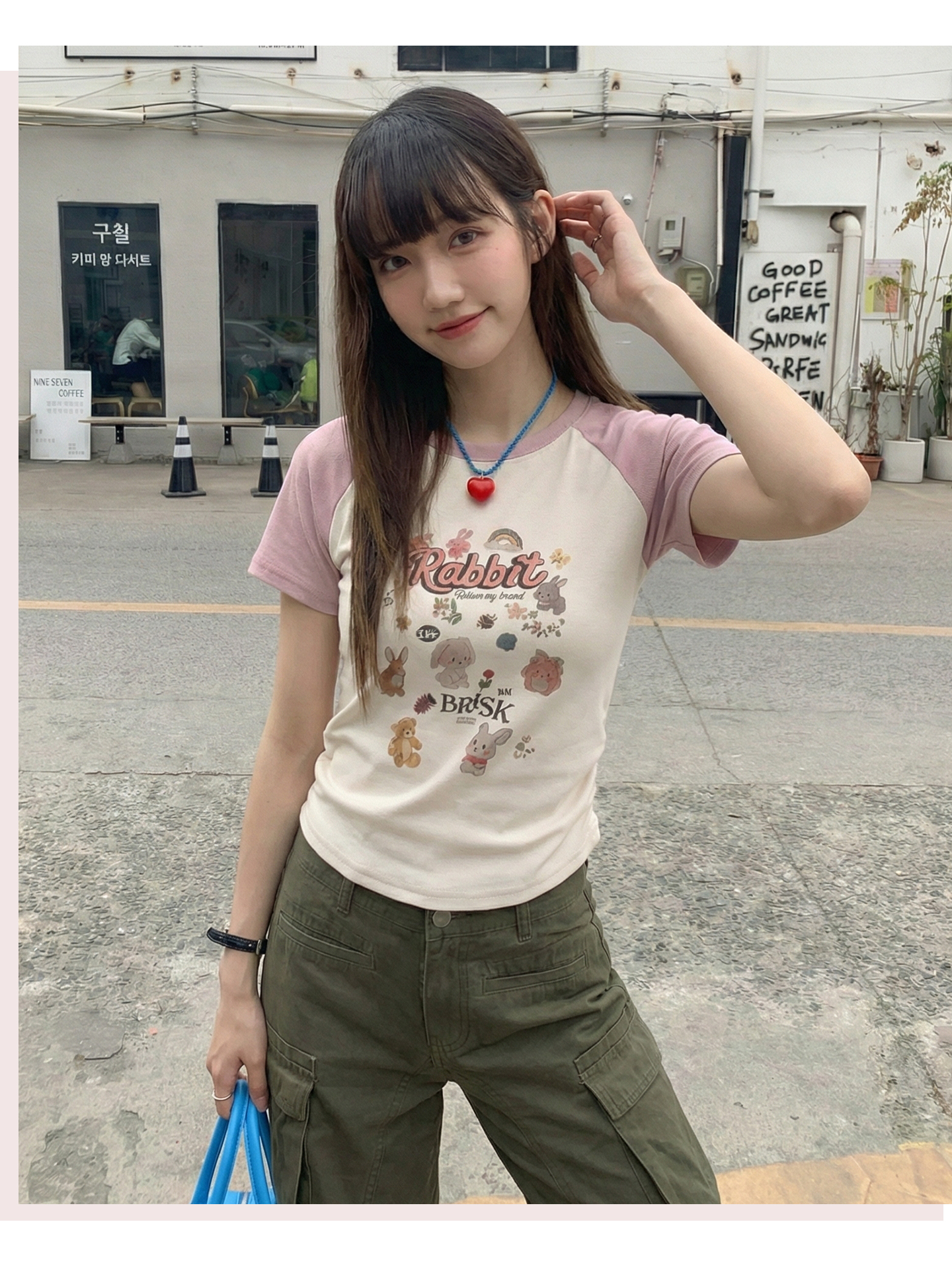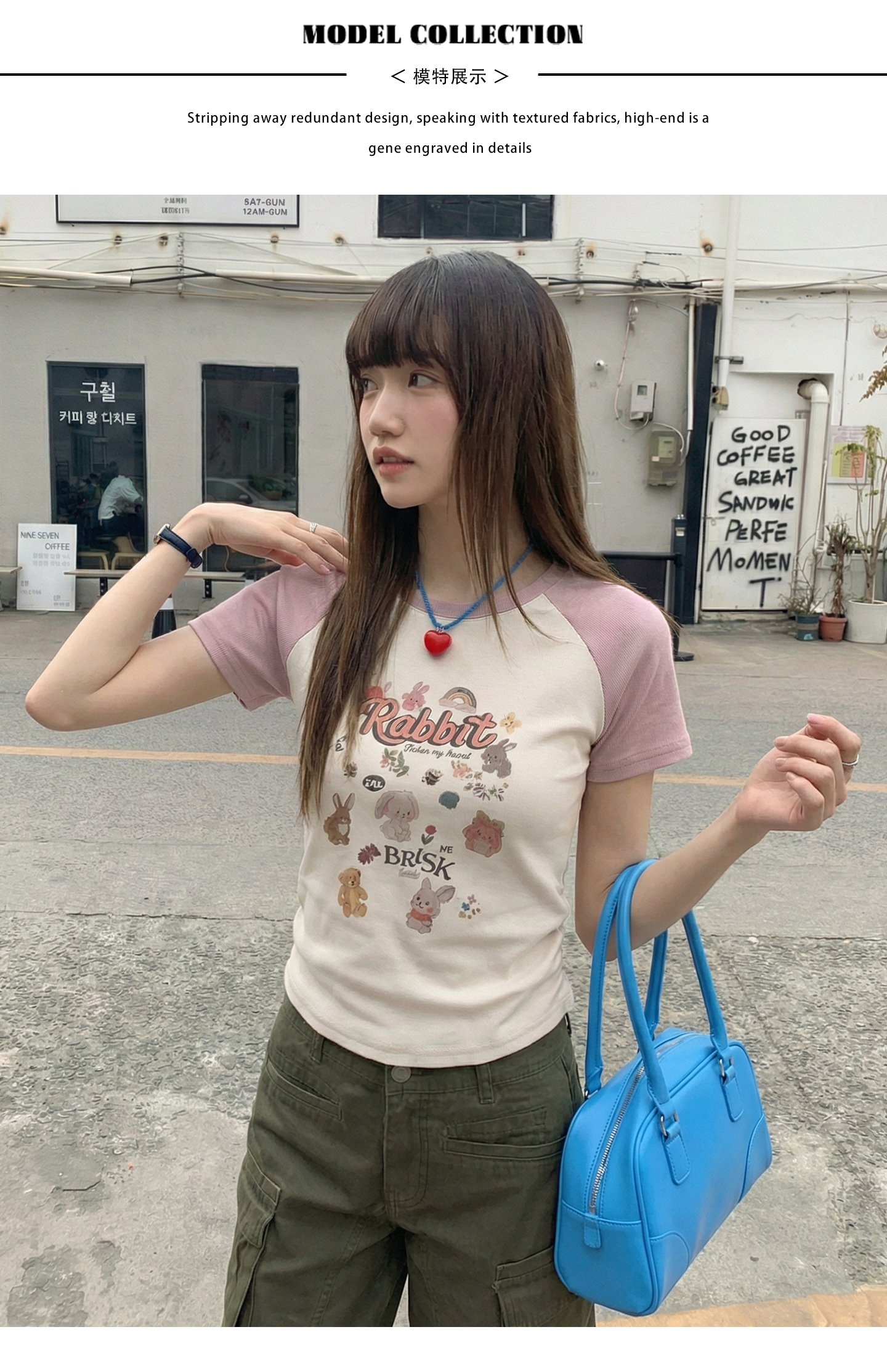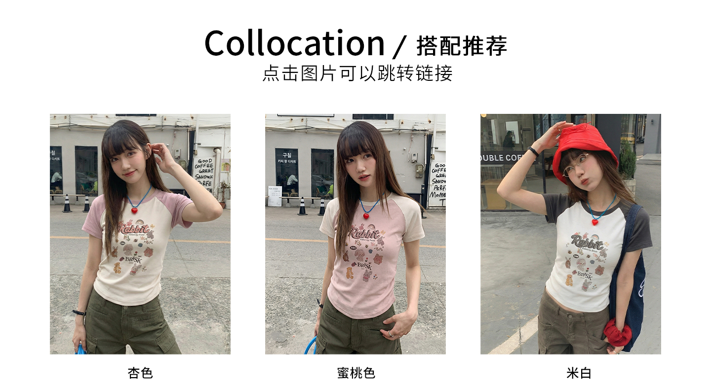 实拍实价#美式复古卡通印花插肩袖短袖t恤女春季设计感短款上衣