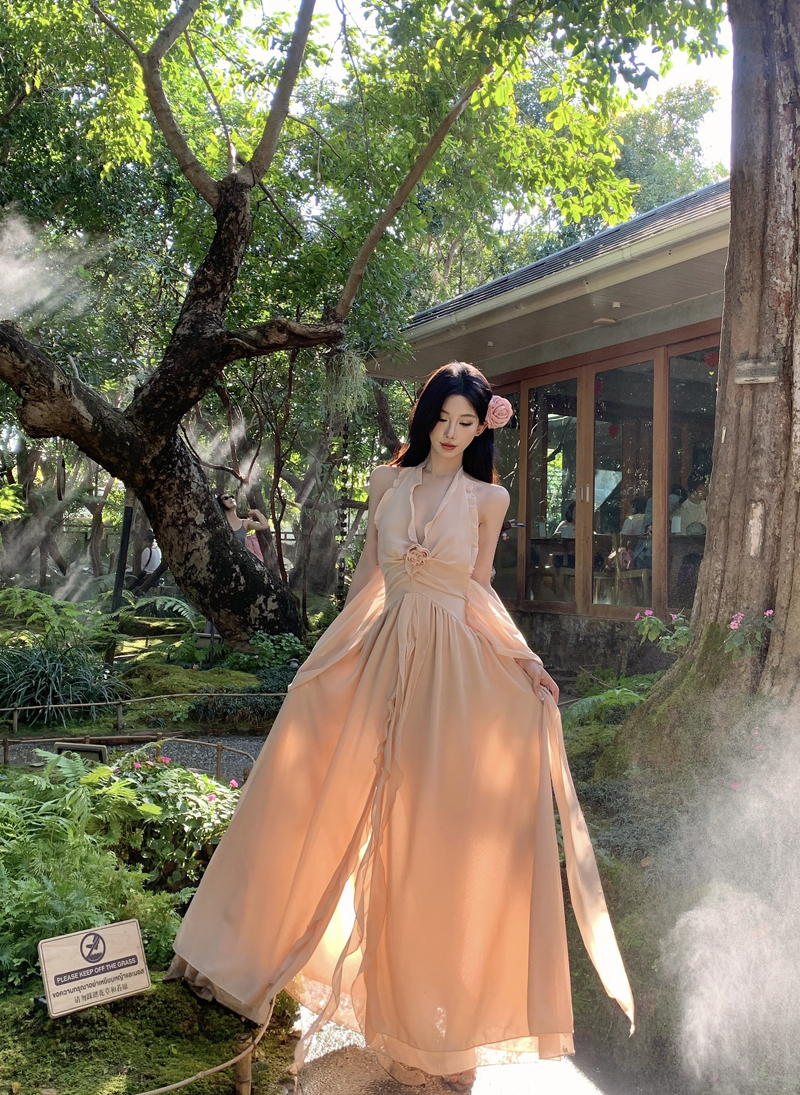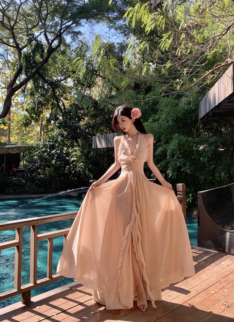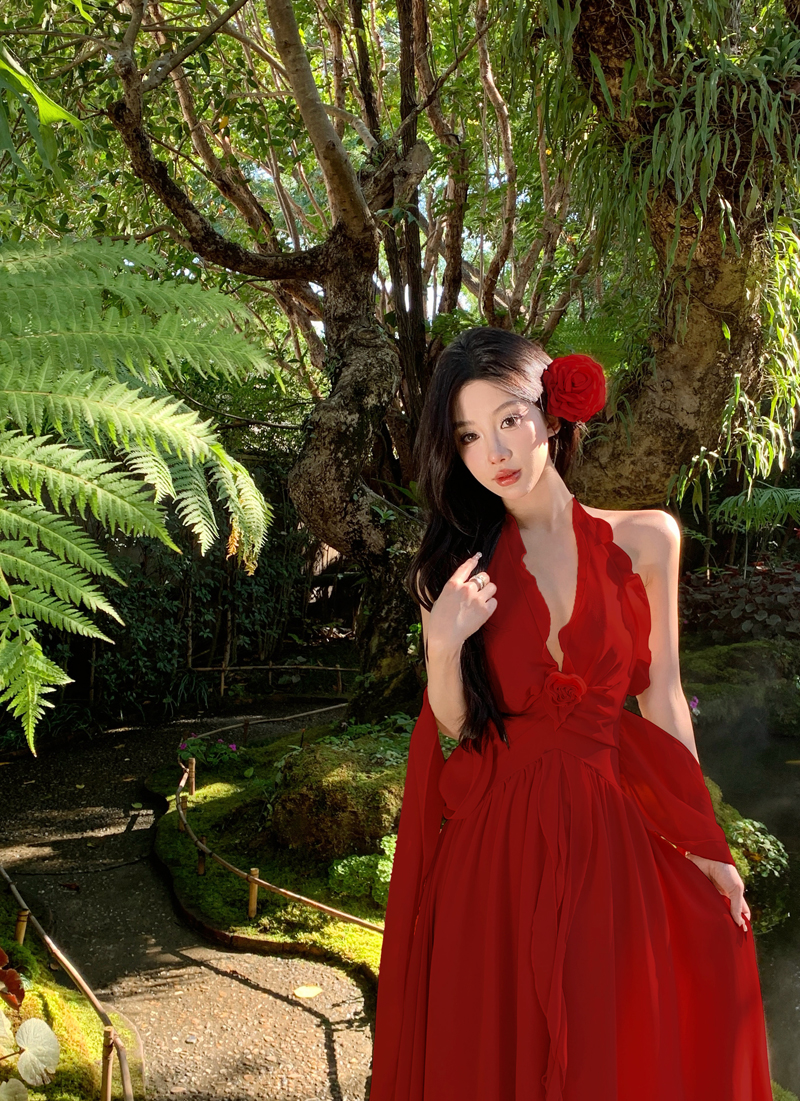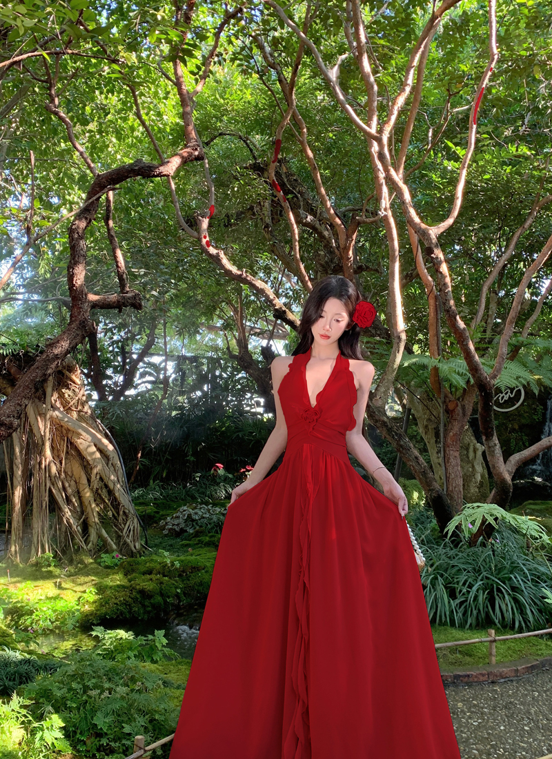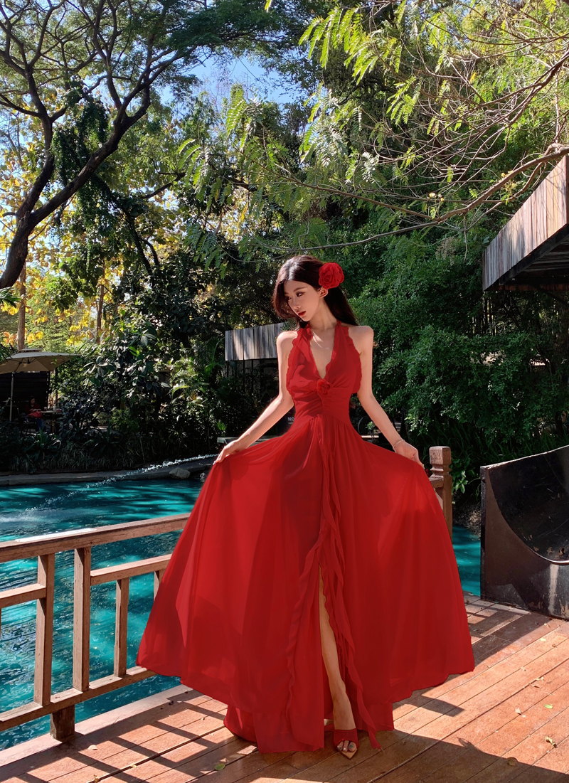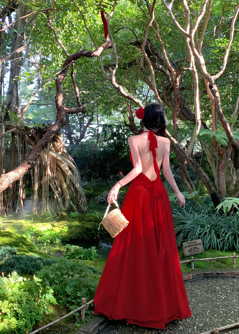 实拍复古红色显白挂脖露背长裙海边度假旅游氛围感雪纺长裙