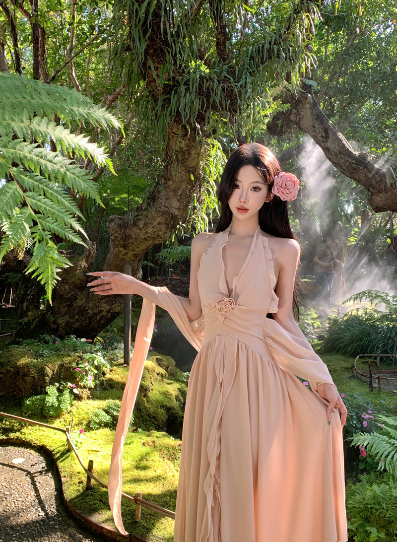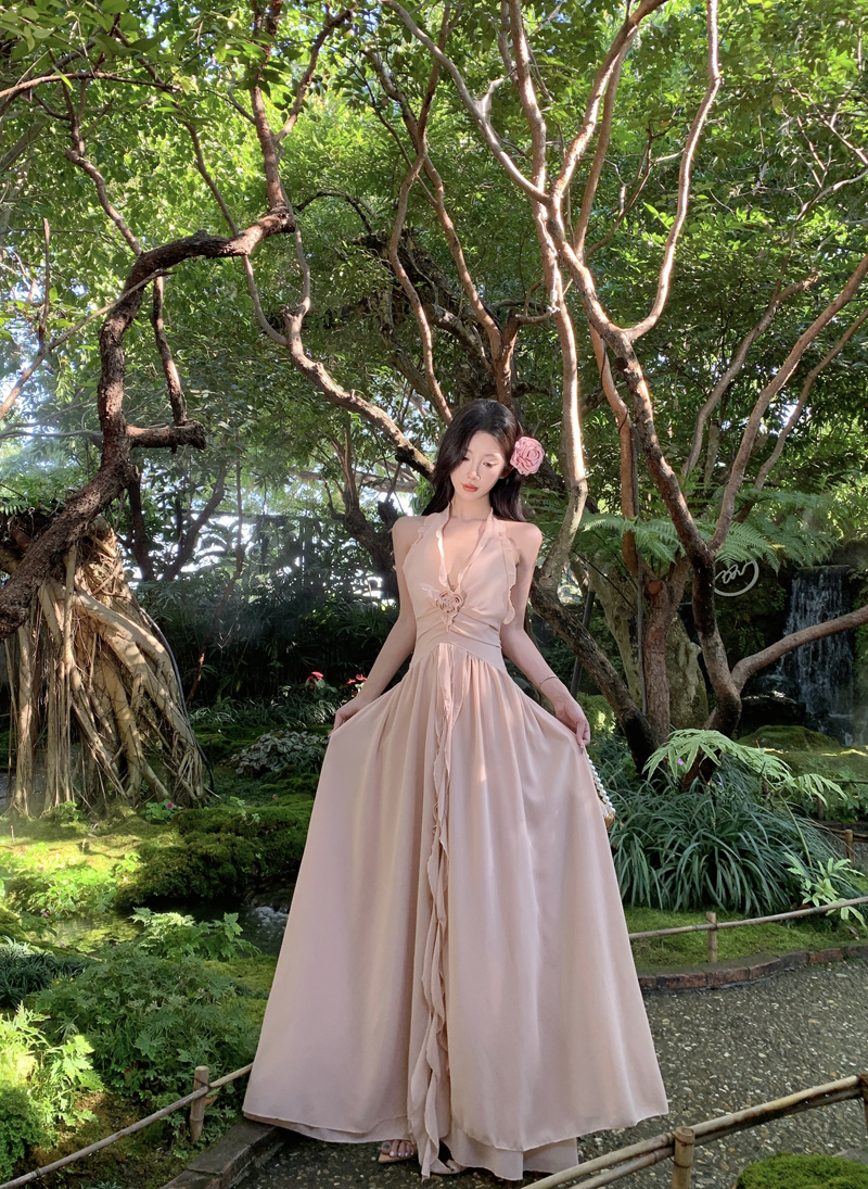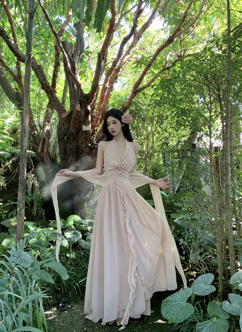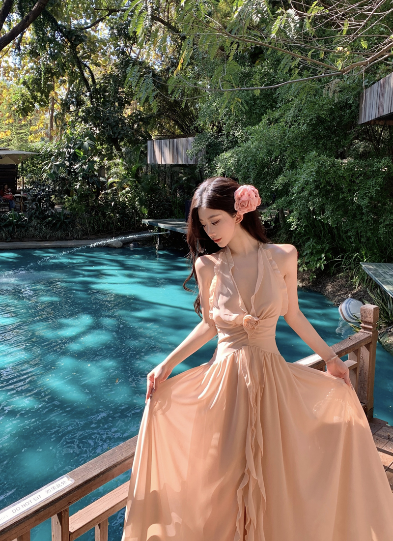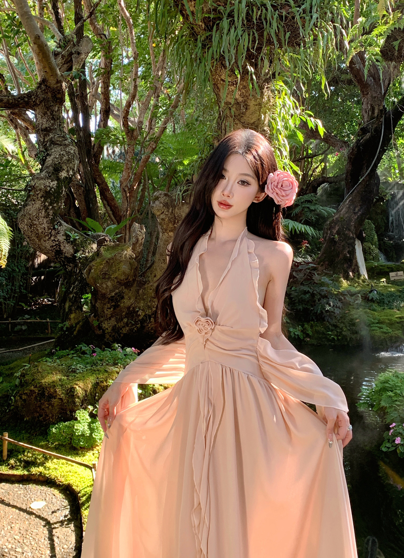 实拍复古红色显白挂脖露背长裙海边度假旅游氛围感雪纺长裙