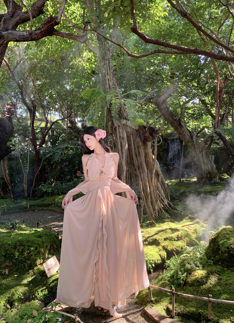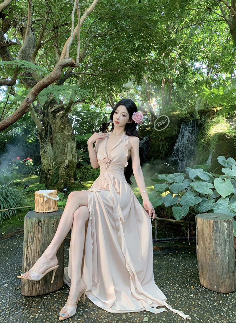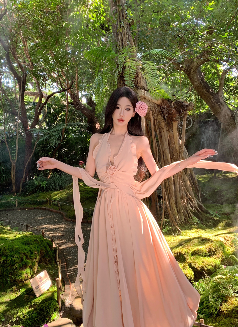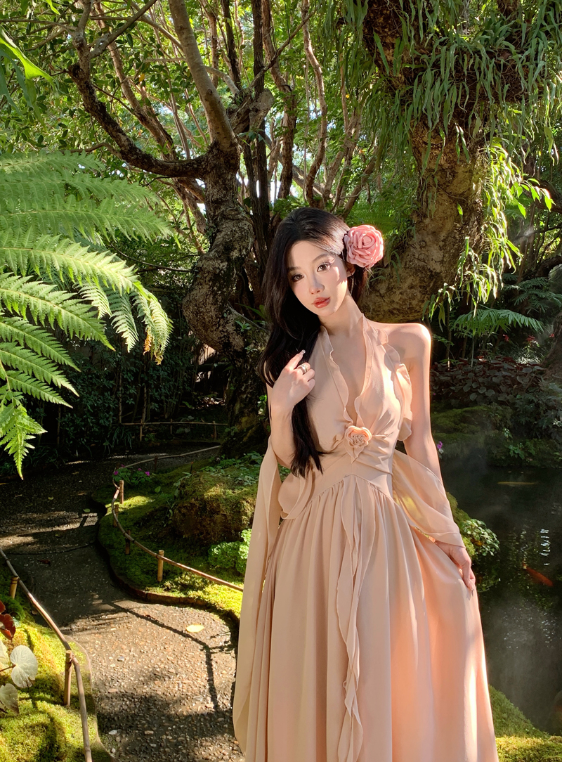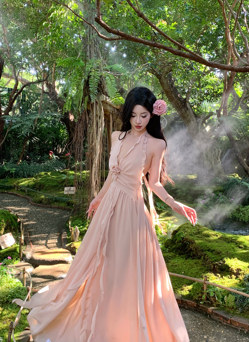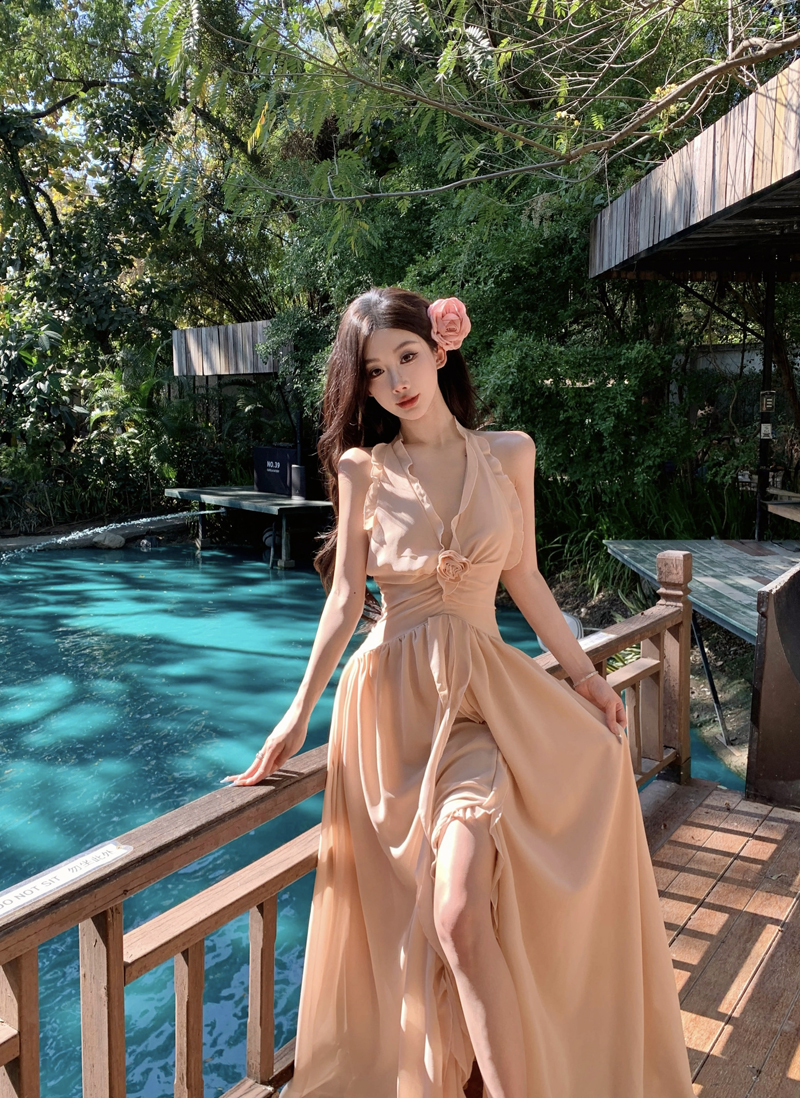 实拍复古红色显白挂脖露背长裙海边度假旅游氛围感雪纺长裙