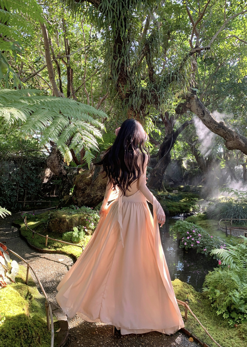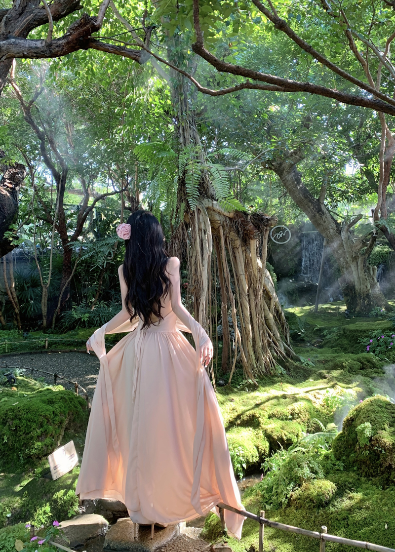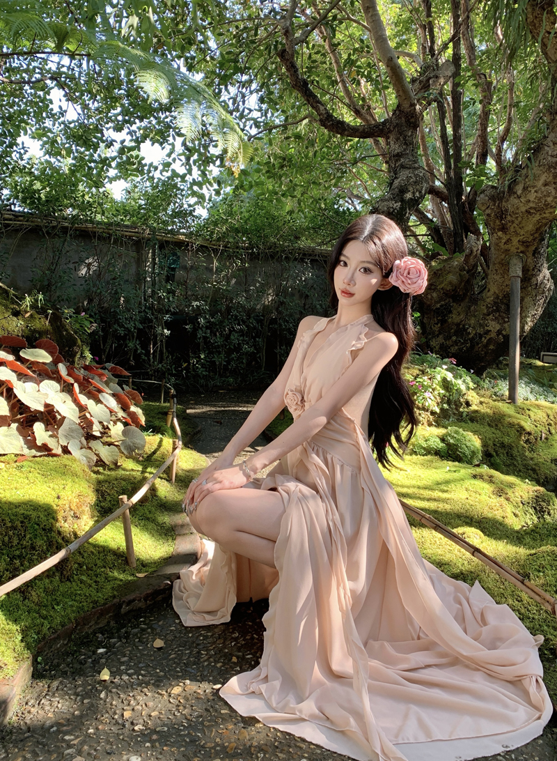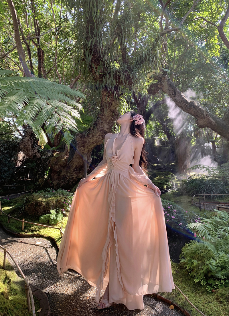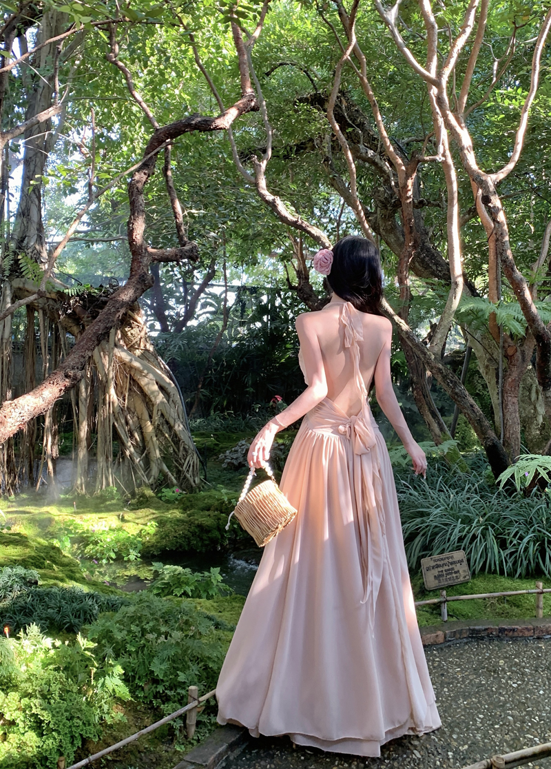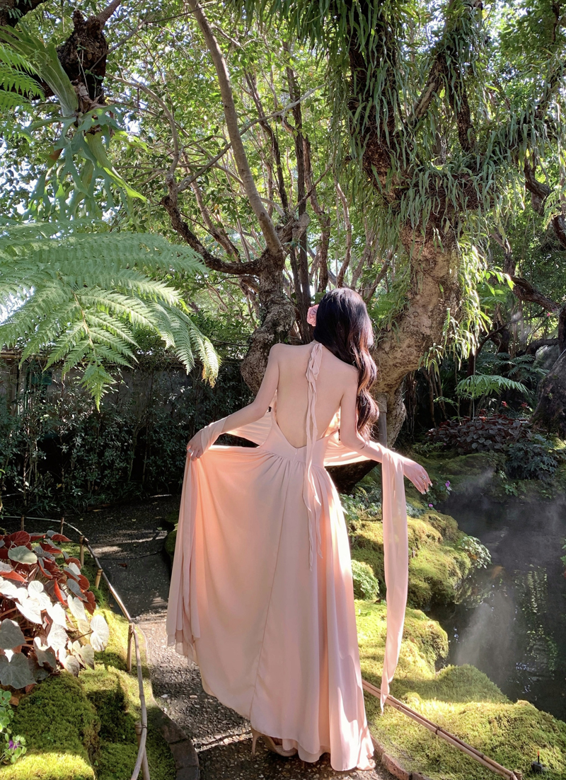 实拍复古红色显白挂脖露背长裙海边度假旅游氛围感雪纺长裙