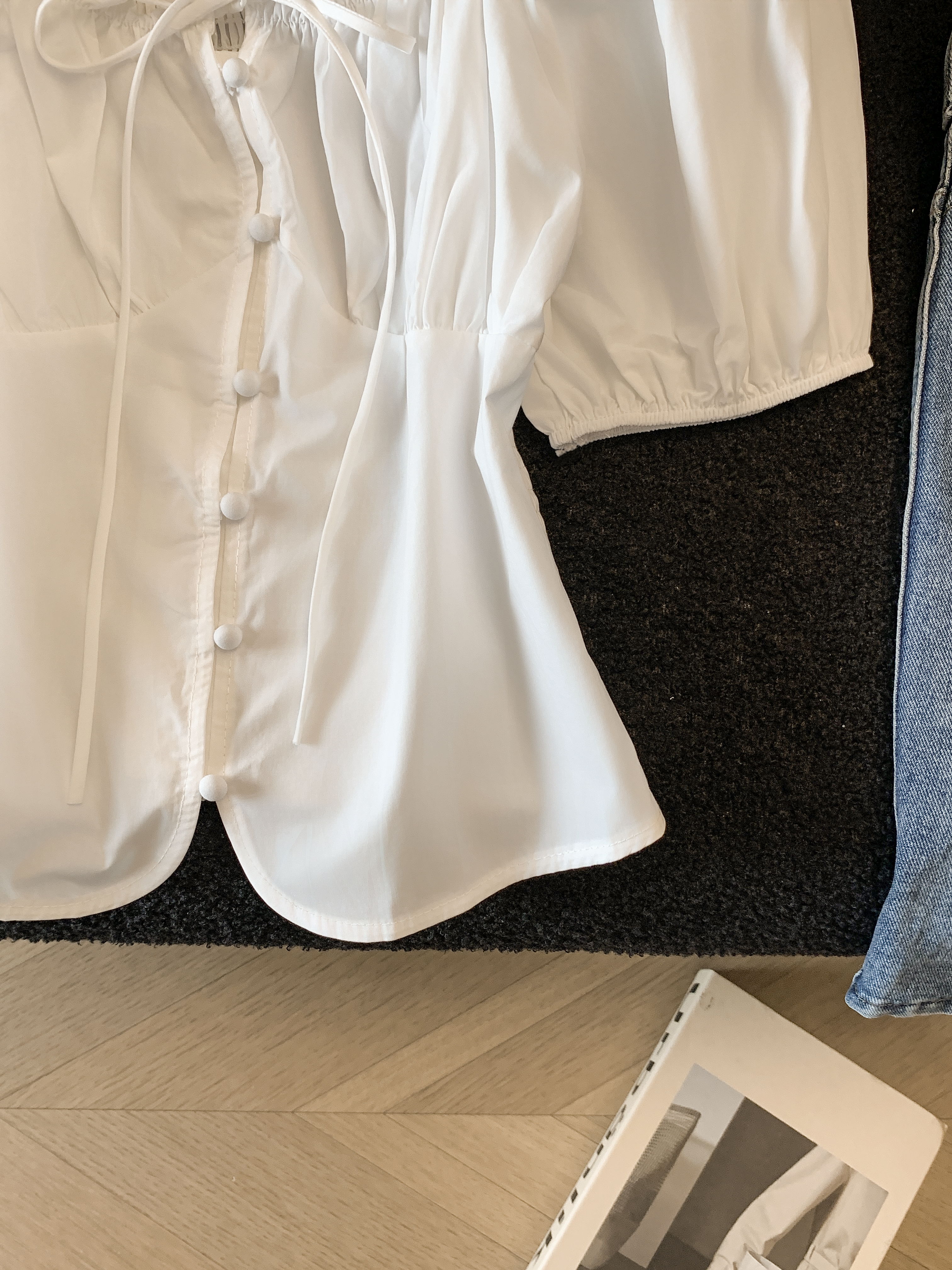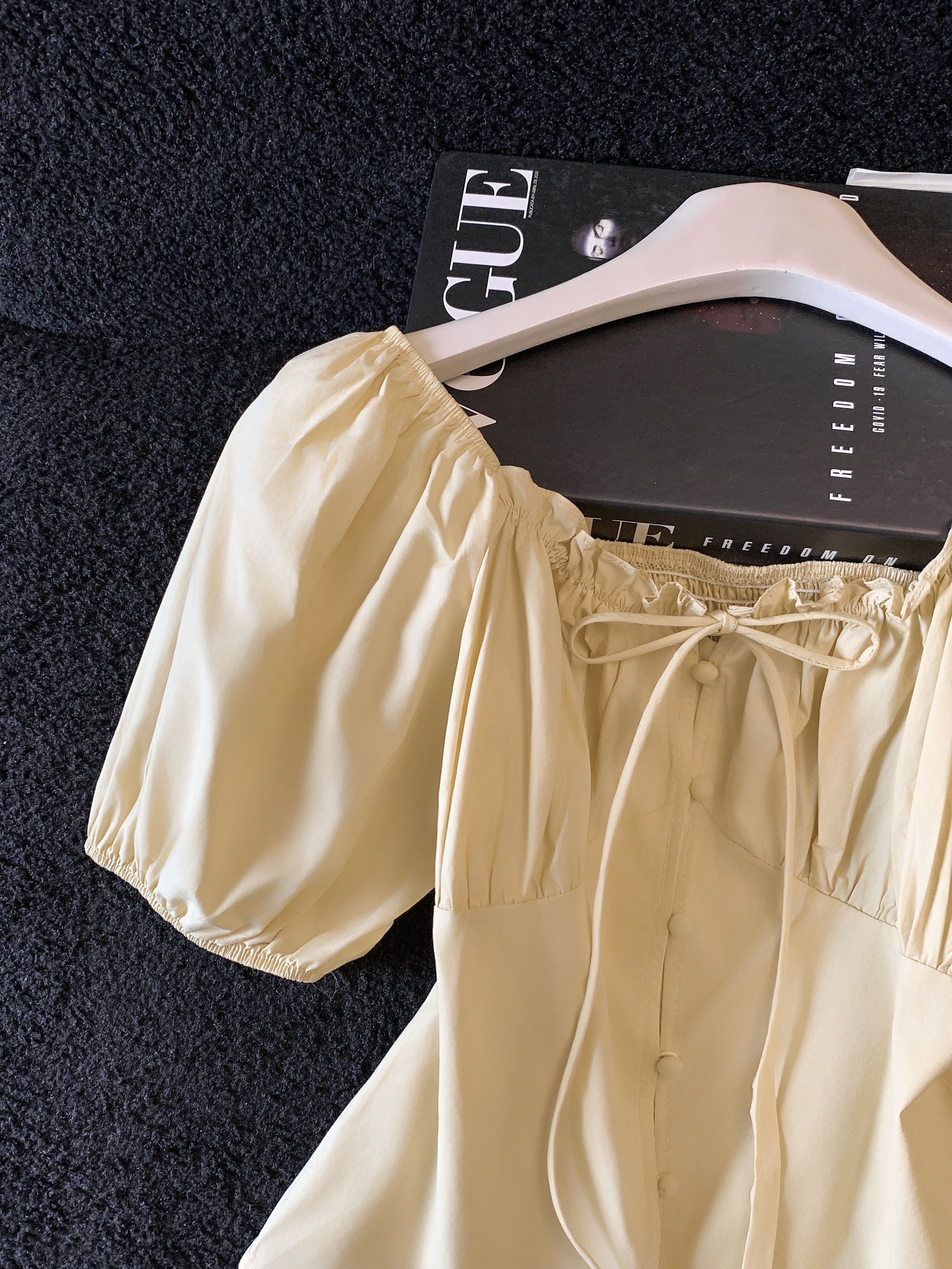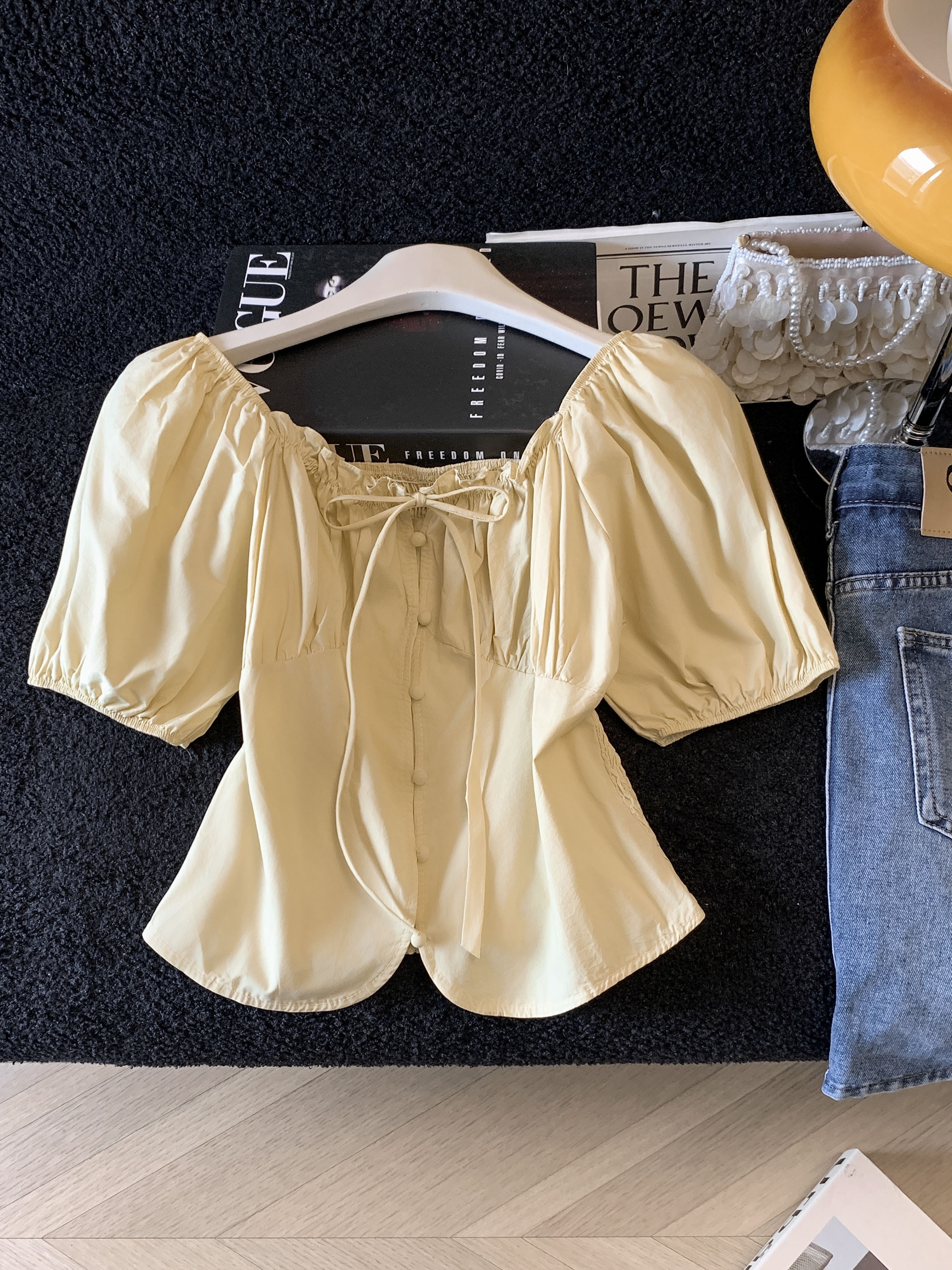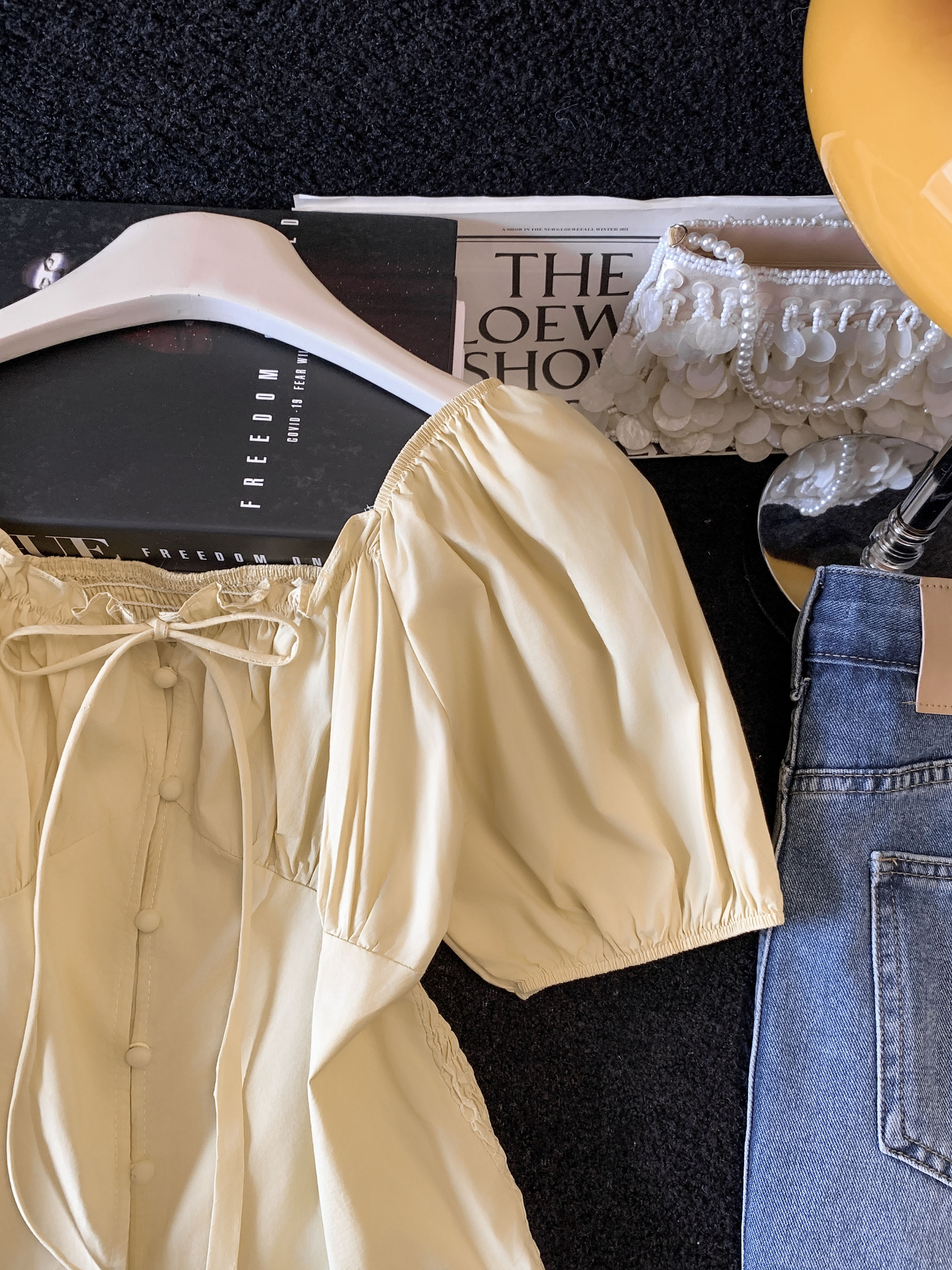 实拍~韩系甜美法式方领一字领显瘦纯色系带泡泡袖短袖衬衫