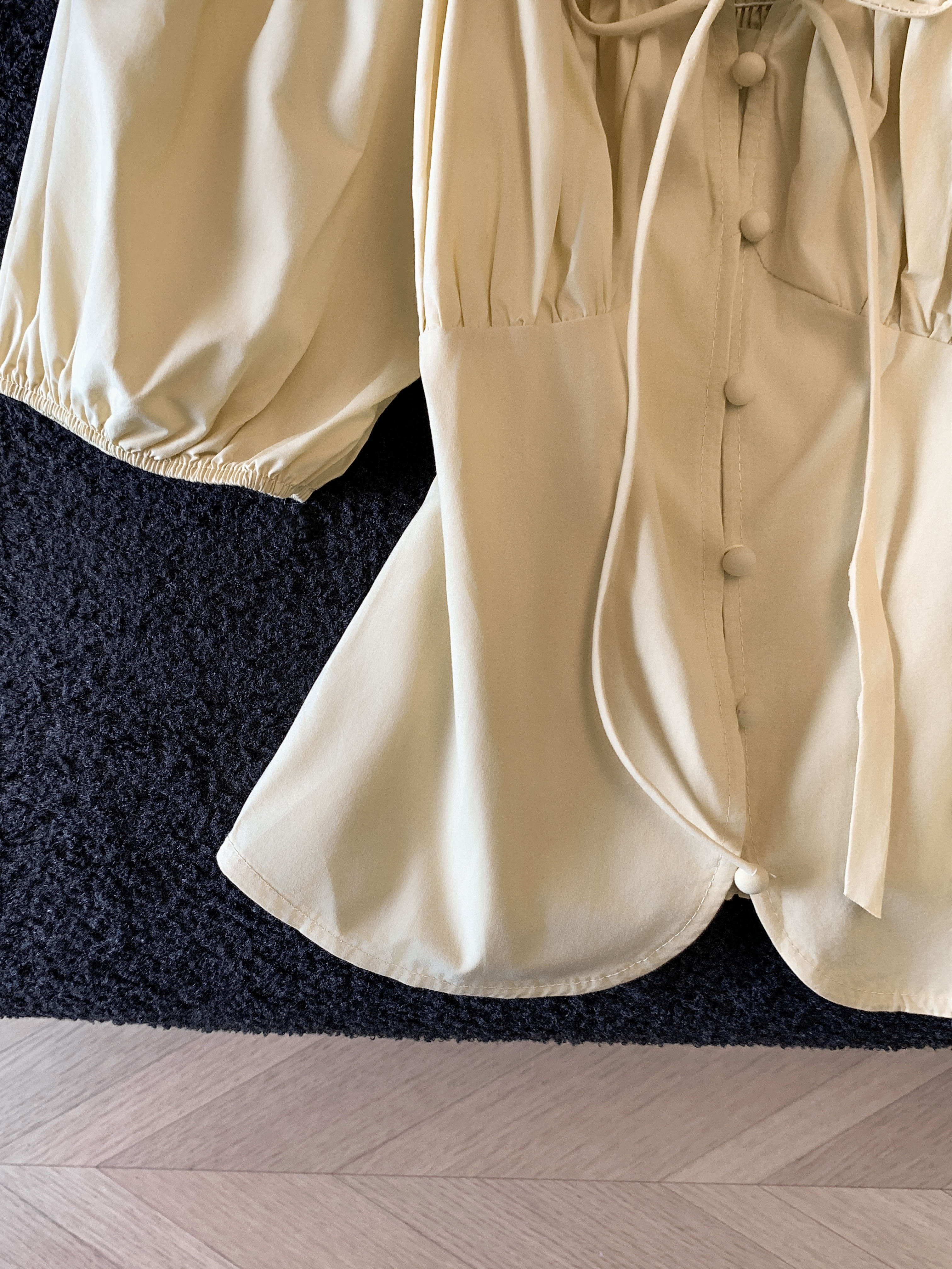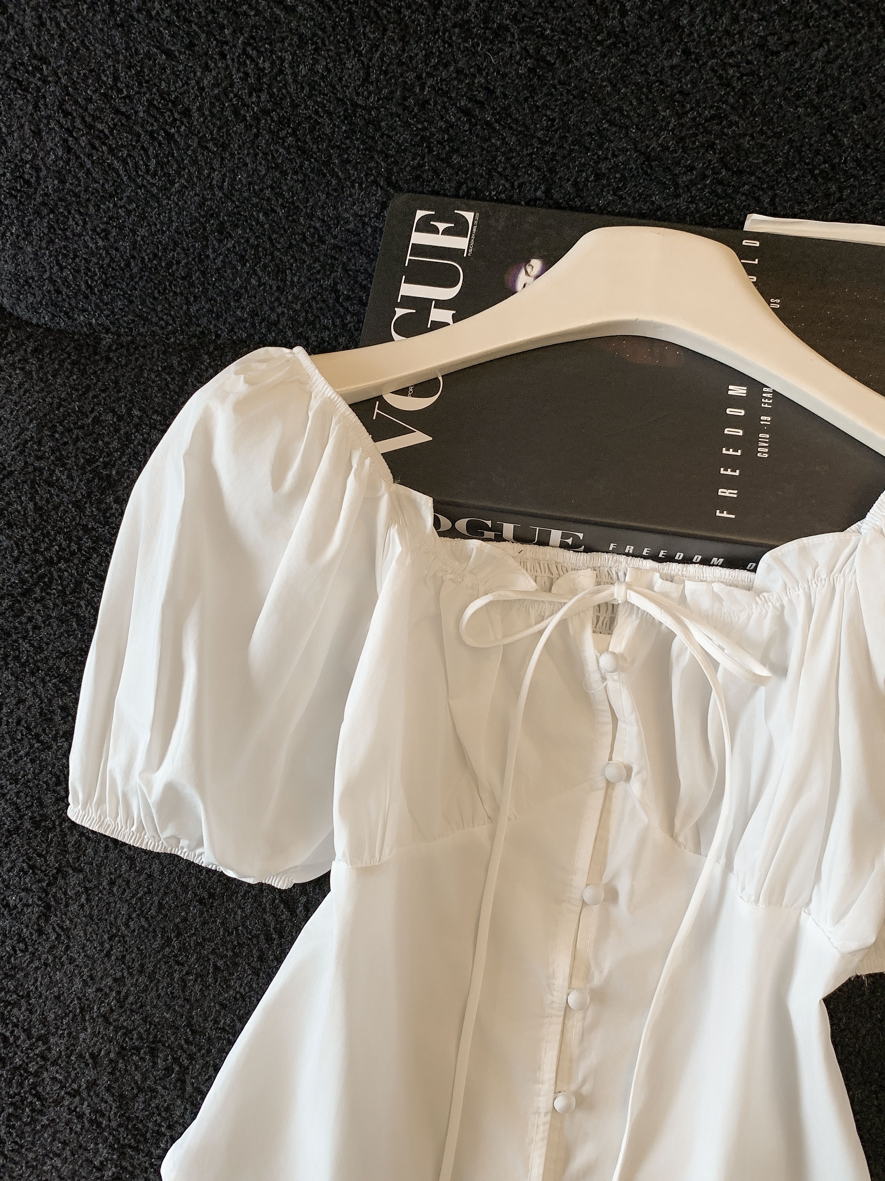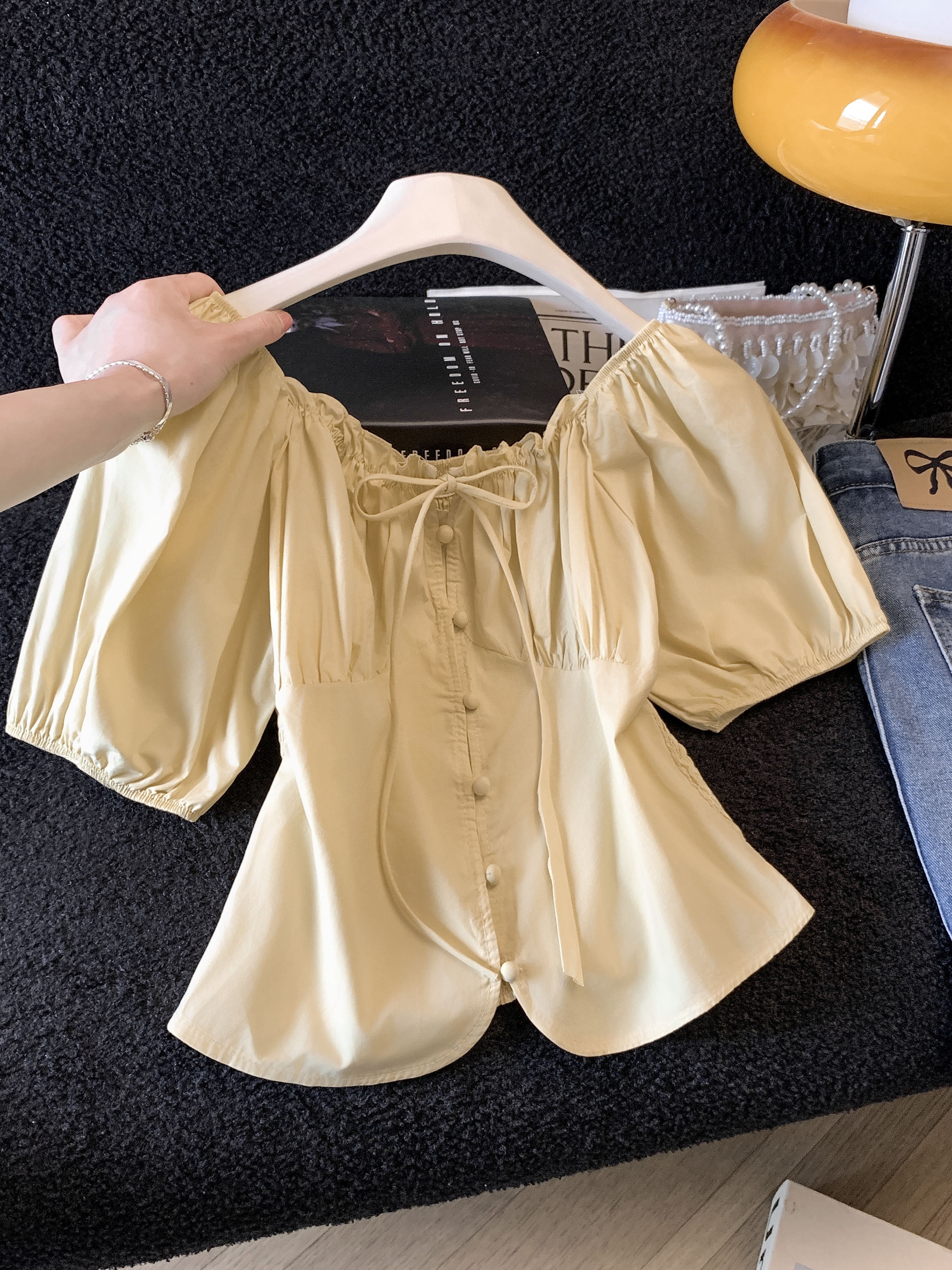 实拍~韩系甜美法式方领一字领显瘦纯色系带泡泡袖短袖衬衫