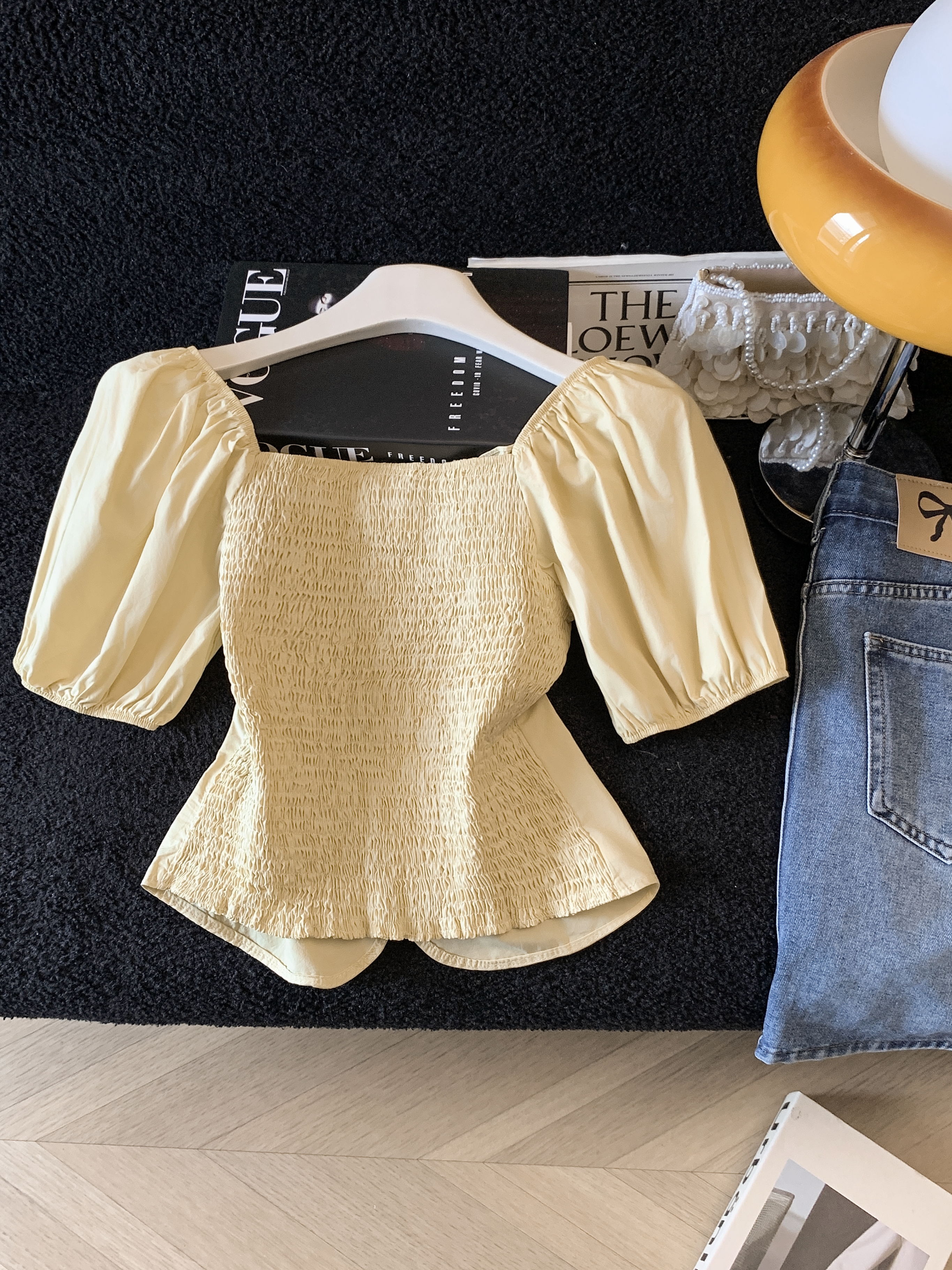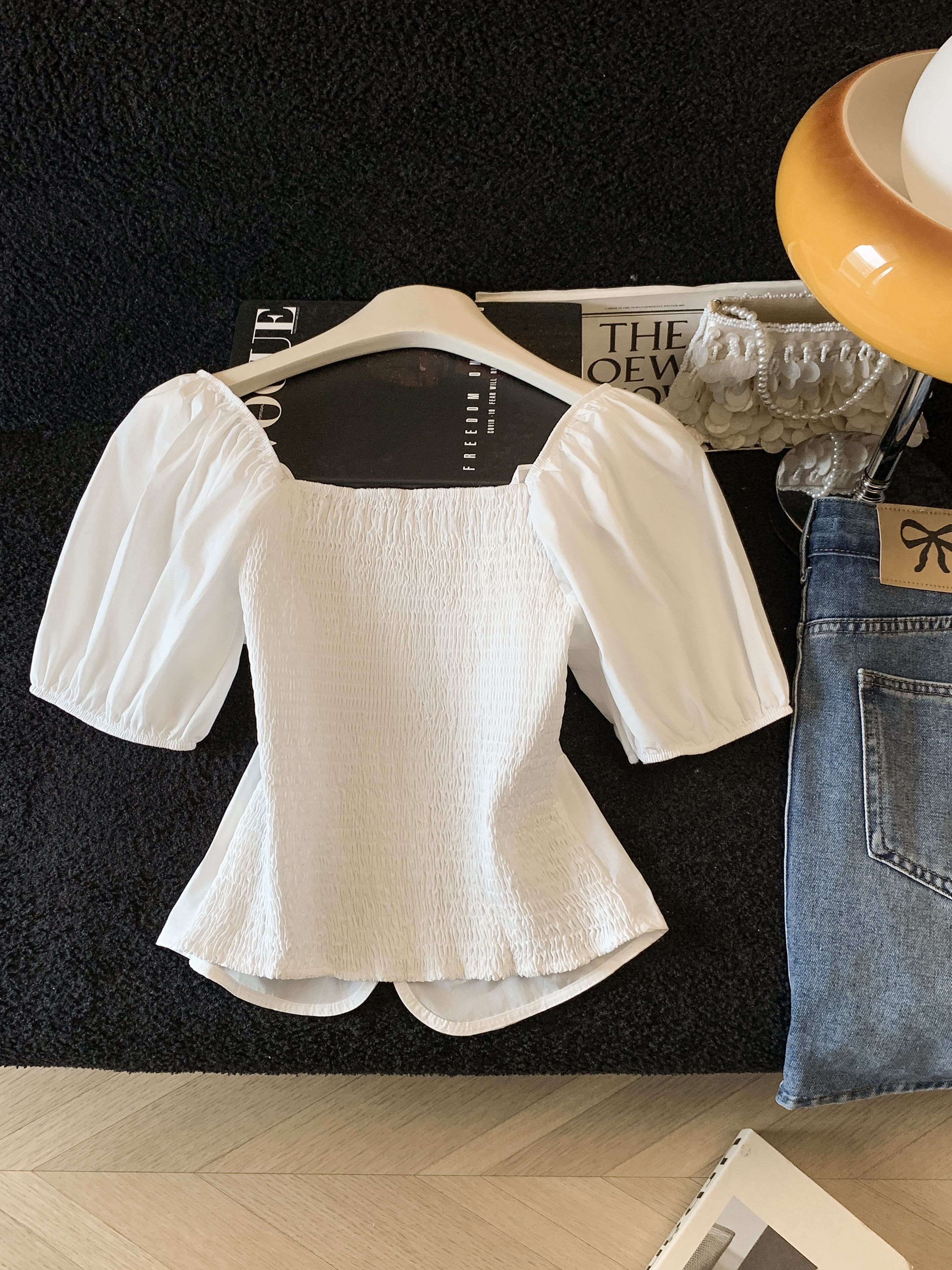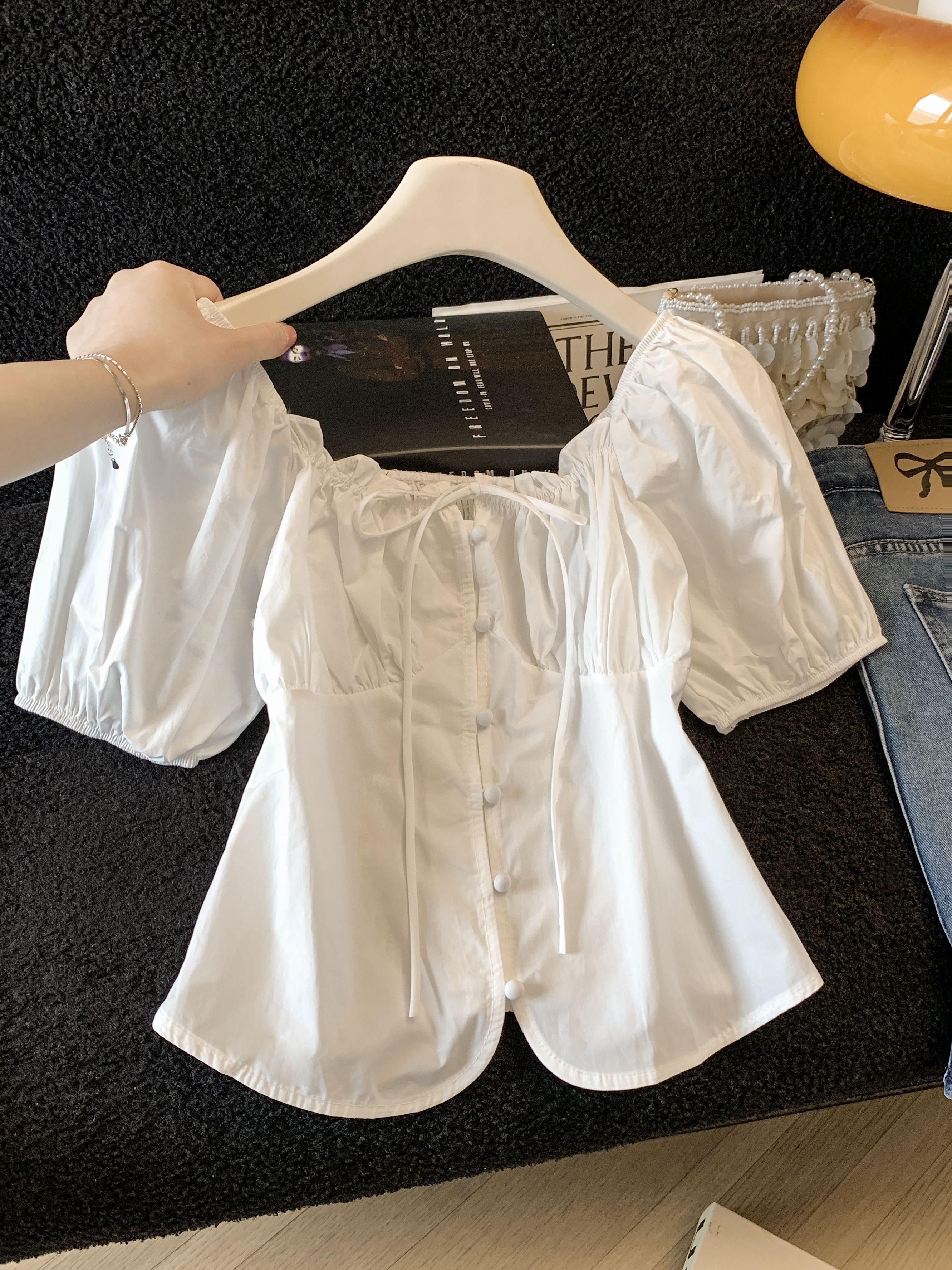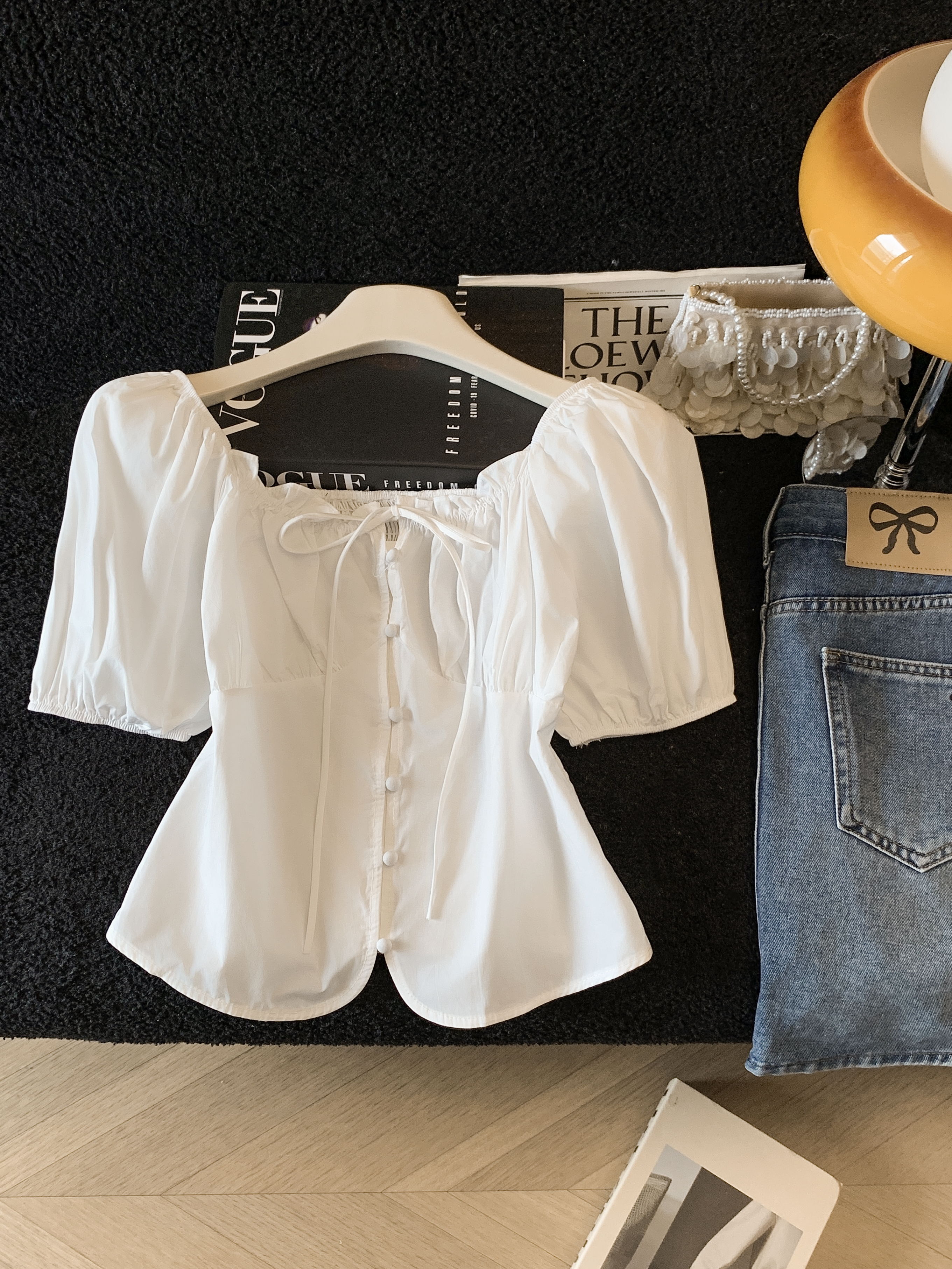 实拍~韩系甜美法式方领一字领显瘦纯色系带泡泡袖短袖衬衫