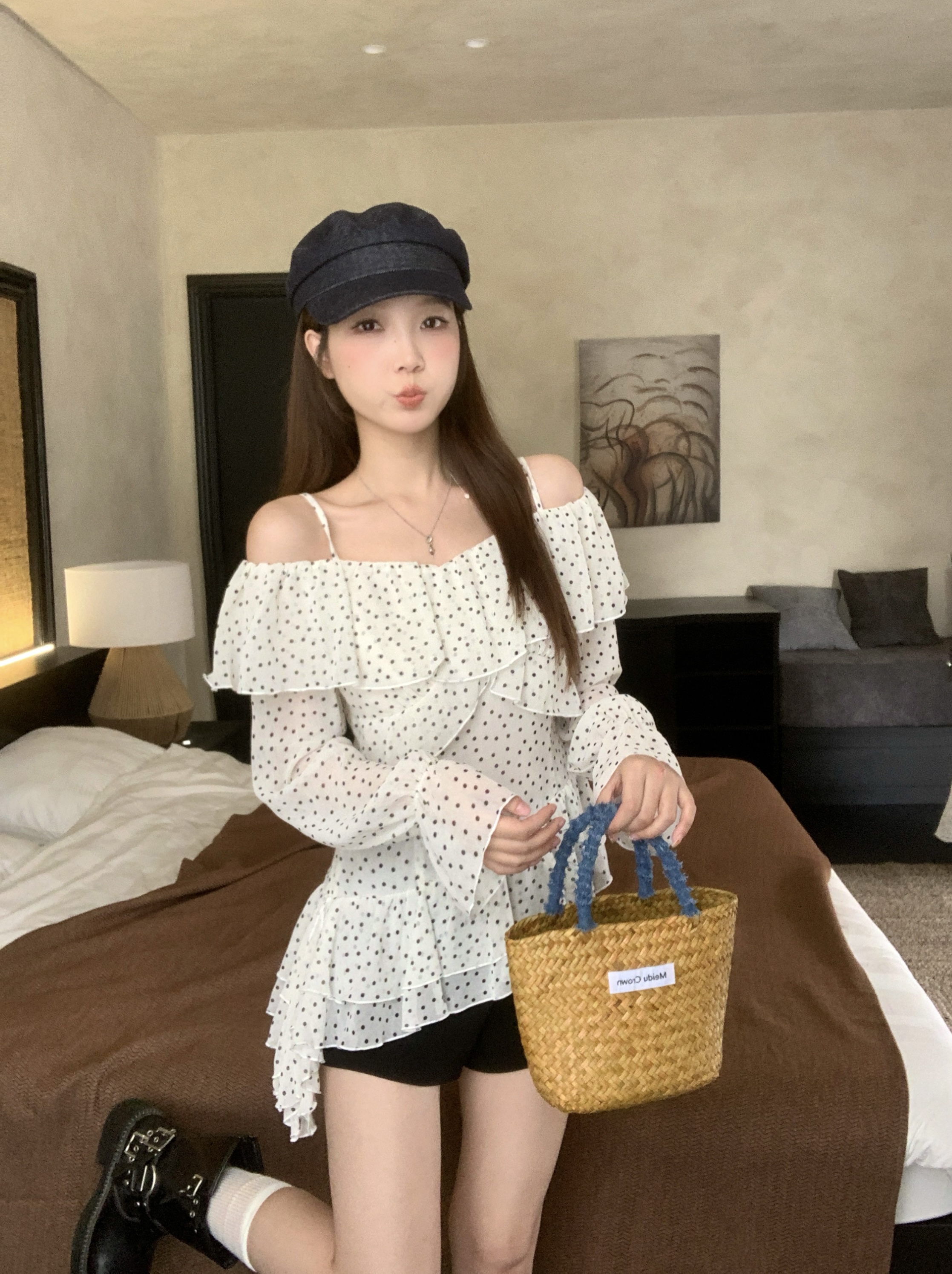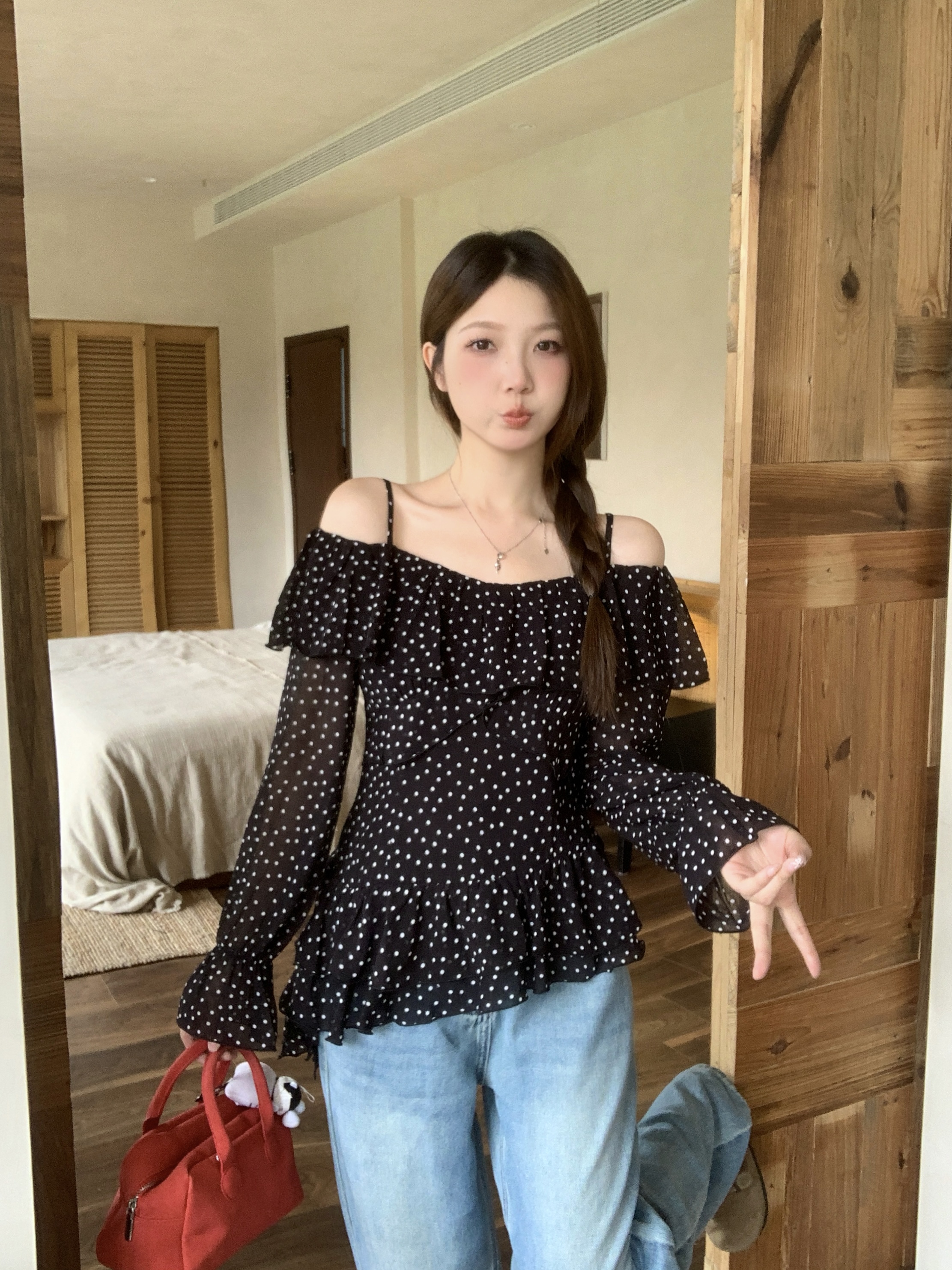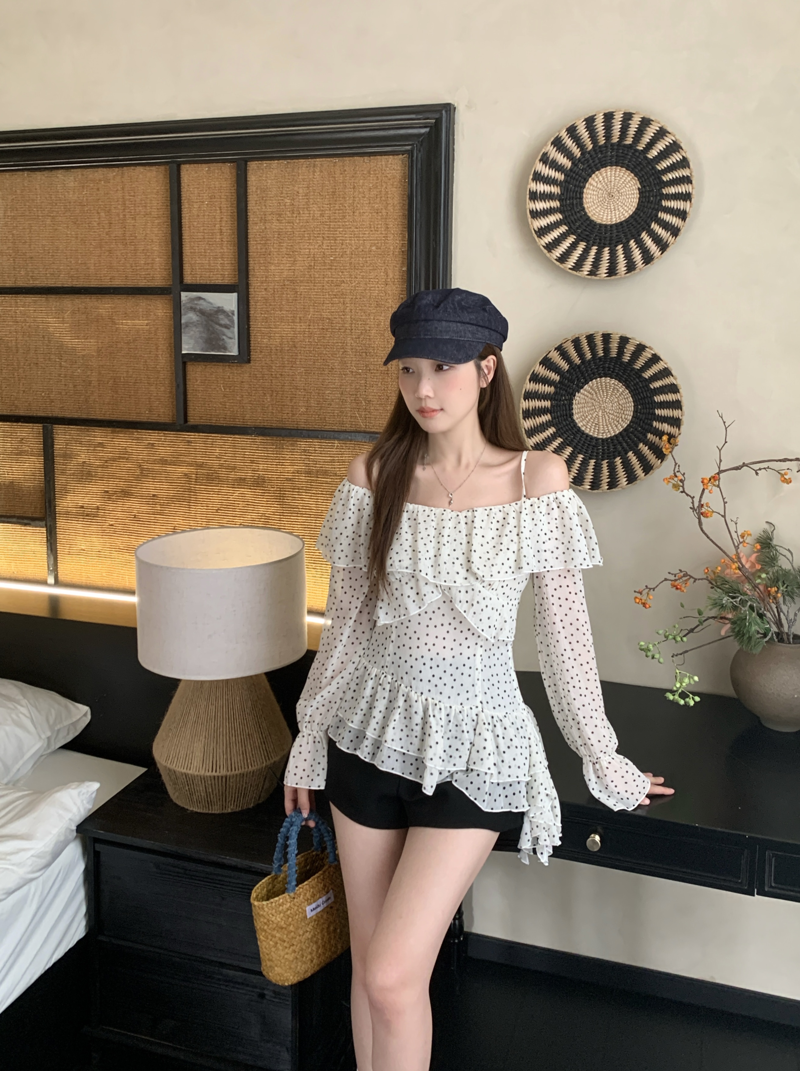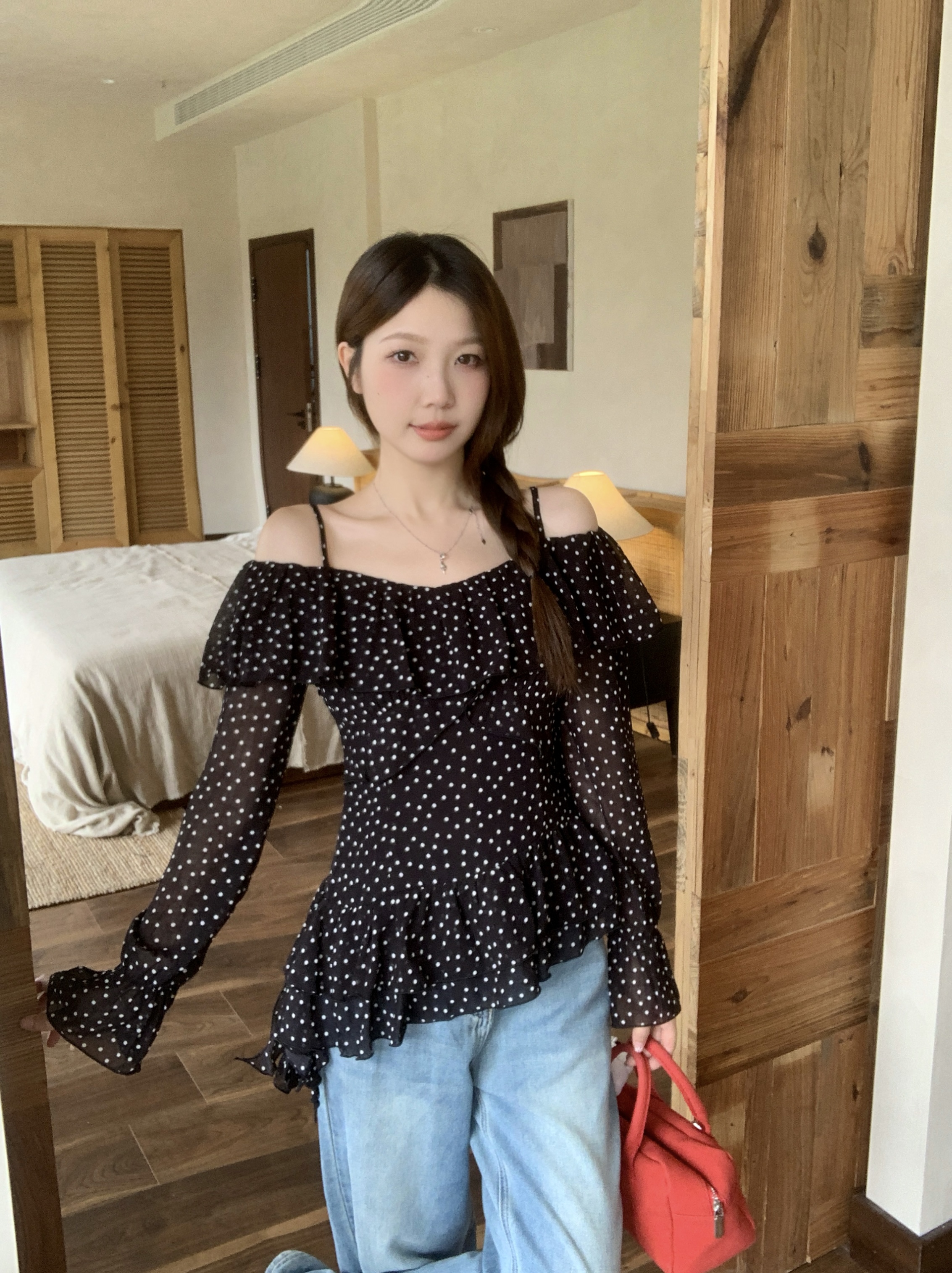 实拍 大码春季新款韩系波点荷叶边一字肩衬衫气质显瘦露肩上衣