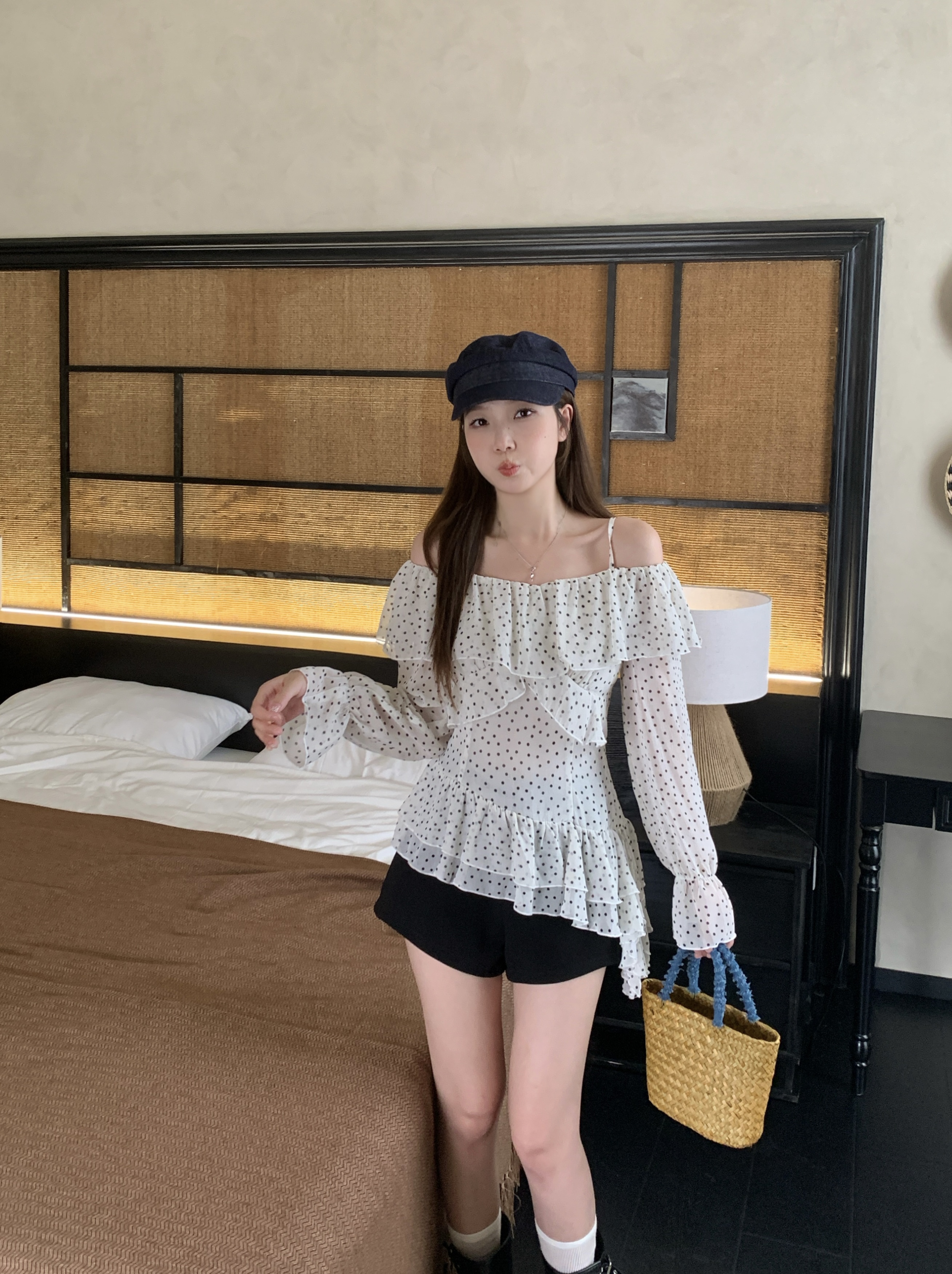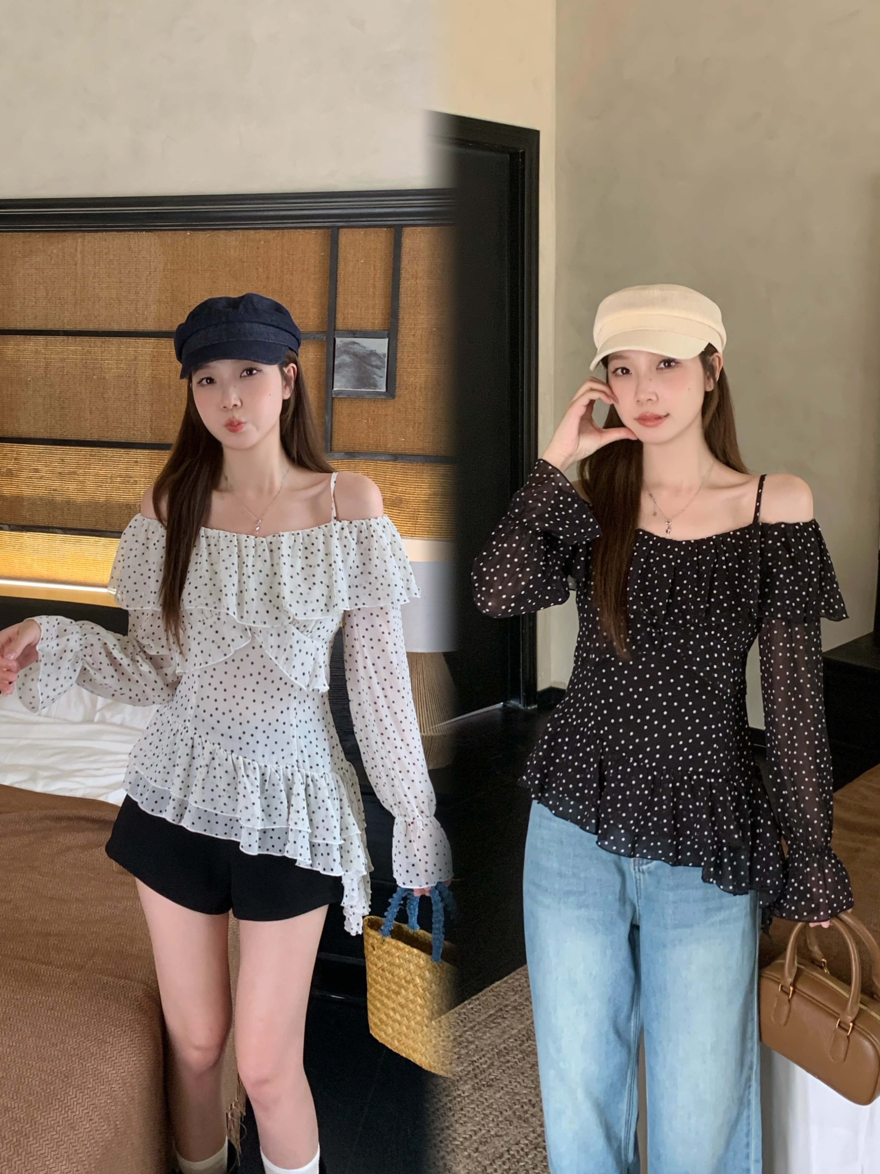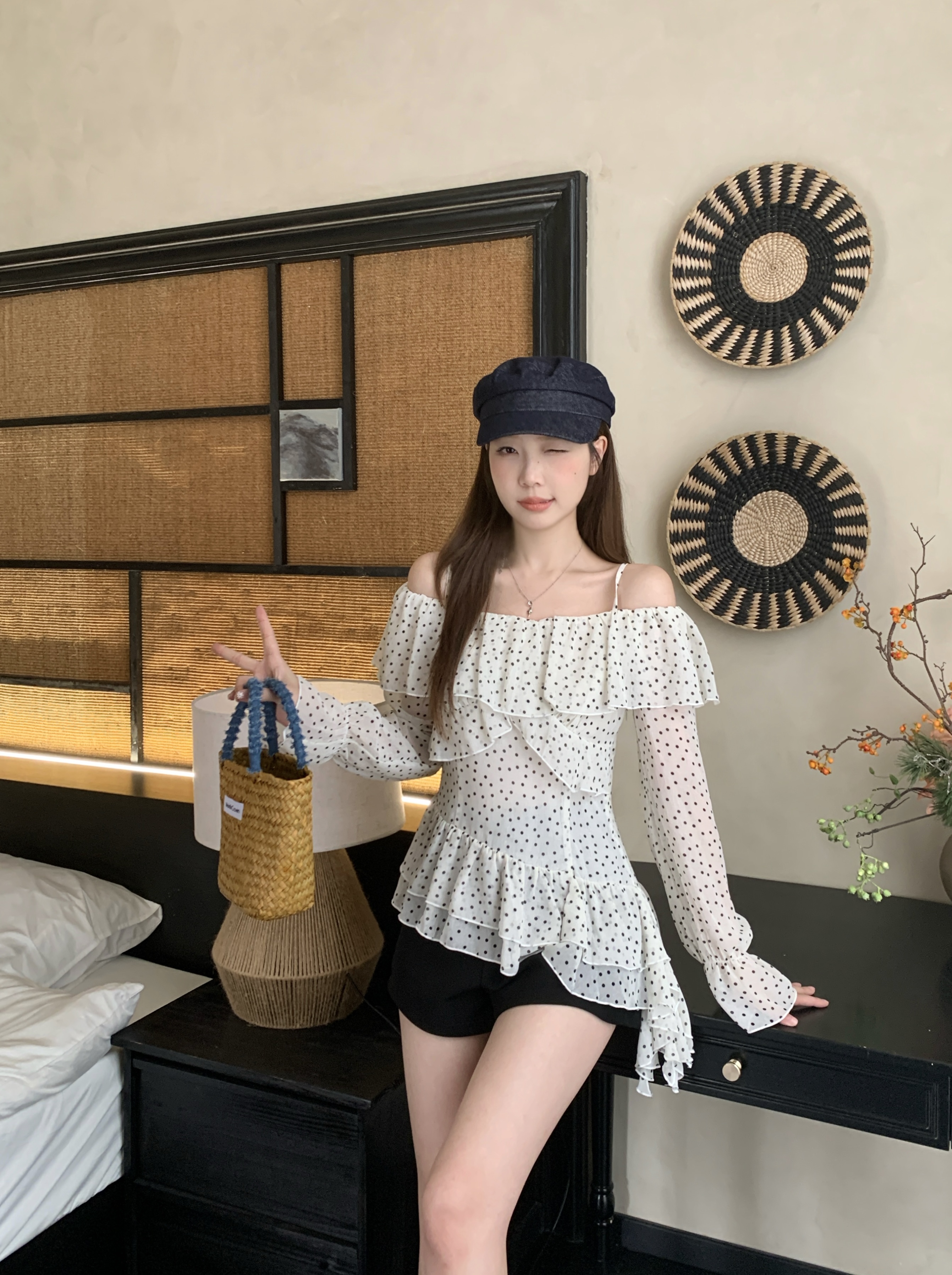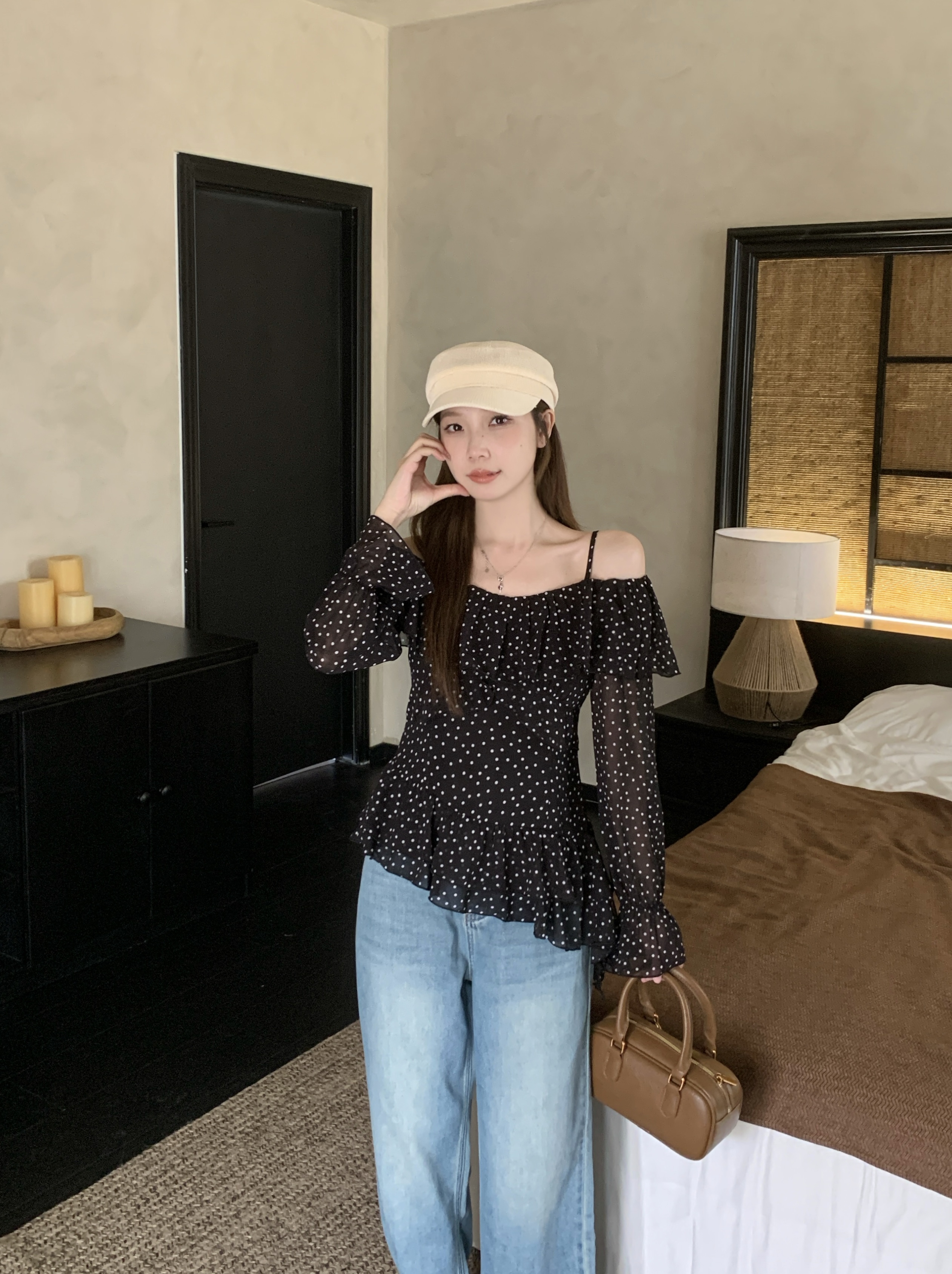 实拍 大码春季新款韩系波点荷叶边一字肩衬衫气质显瘦露肩上衣