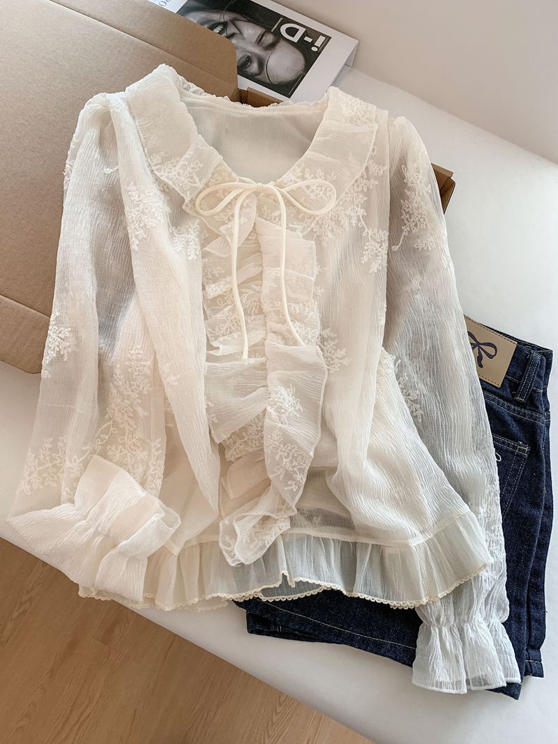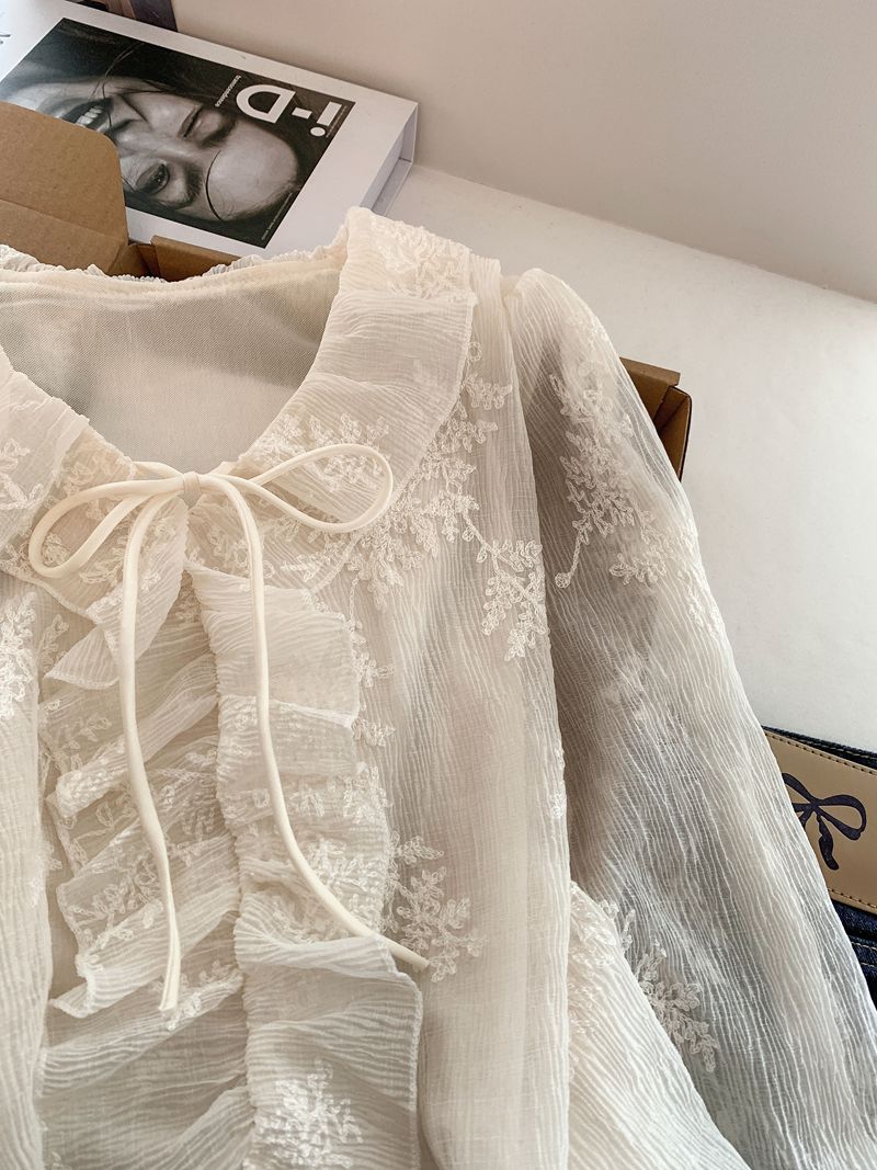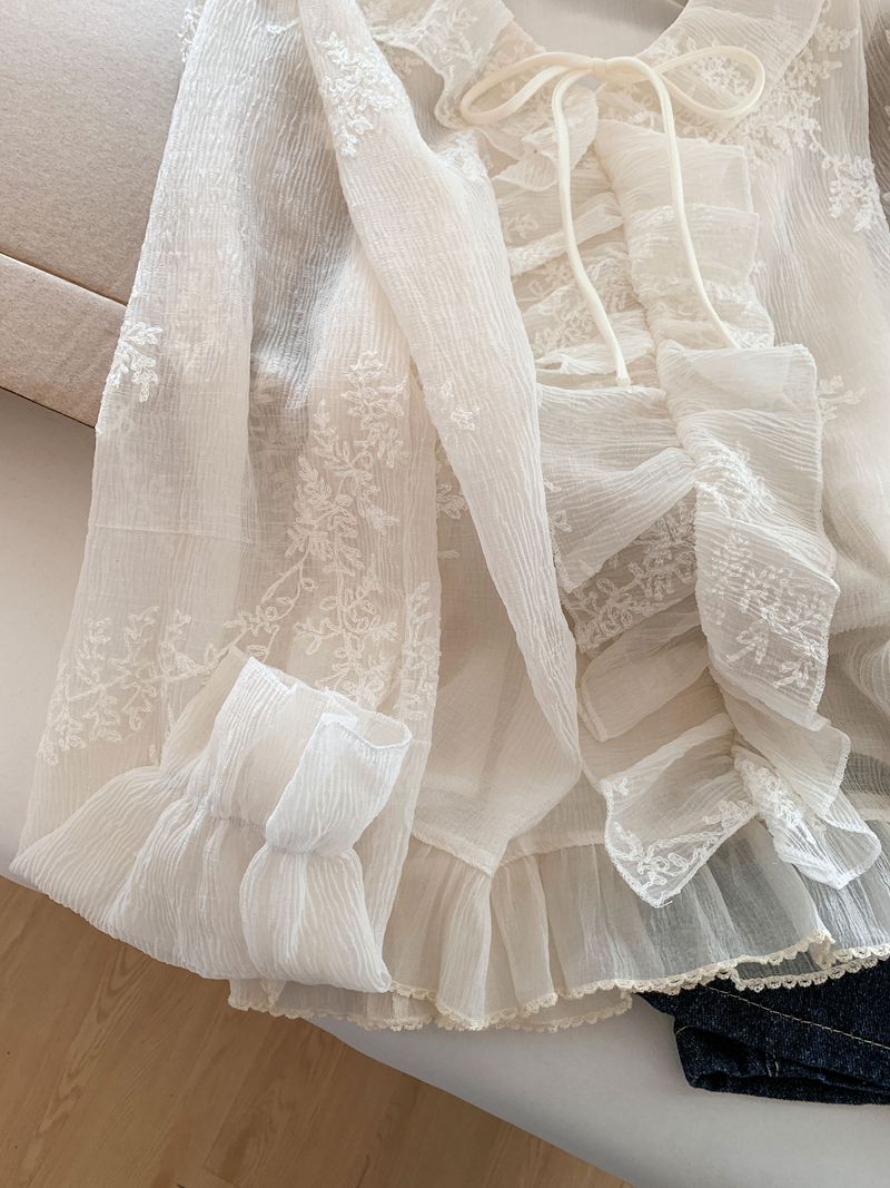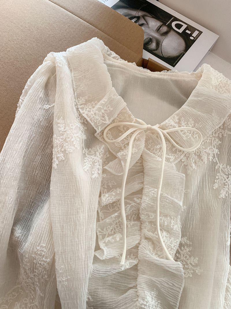 法式温柔风荷叶边衬衫女早春新款蕾丝刺绣娃娃衫设计感小衫