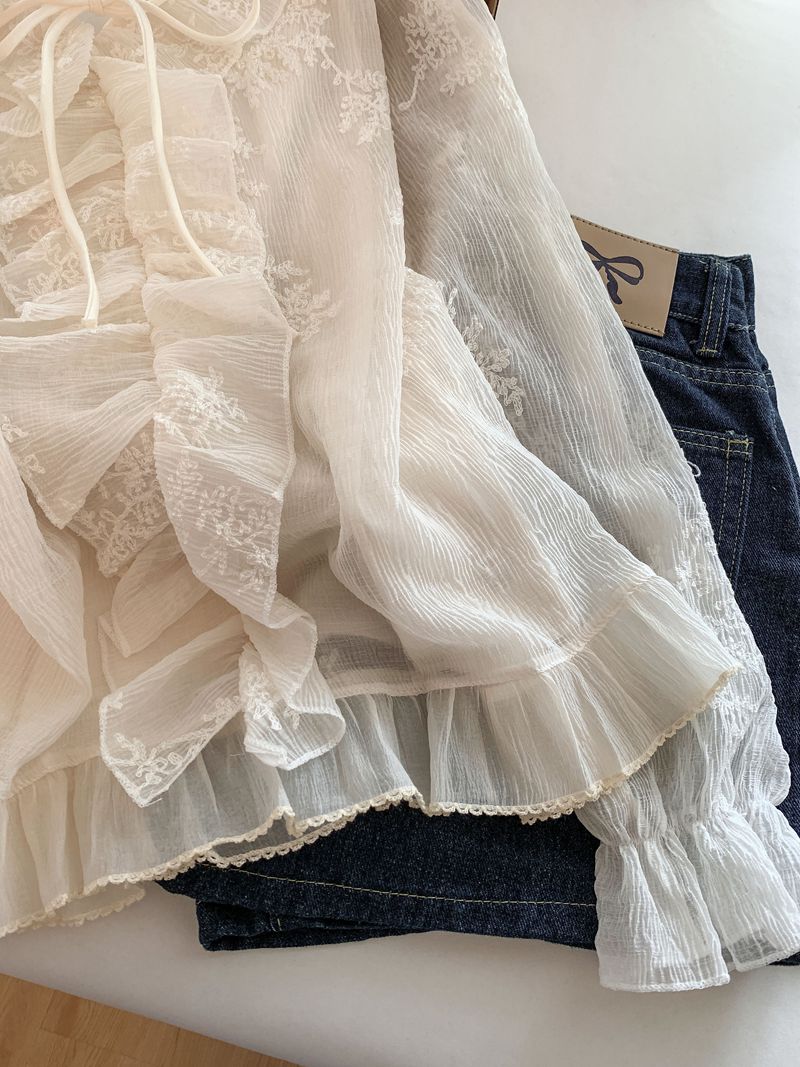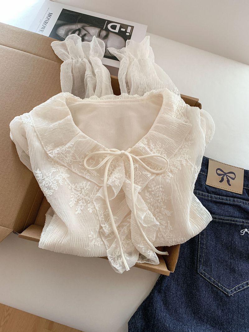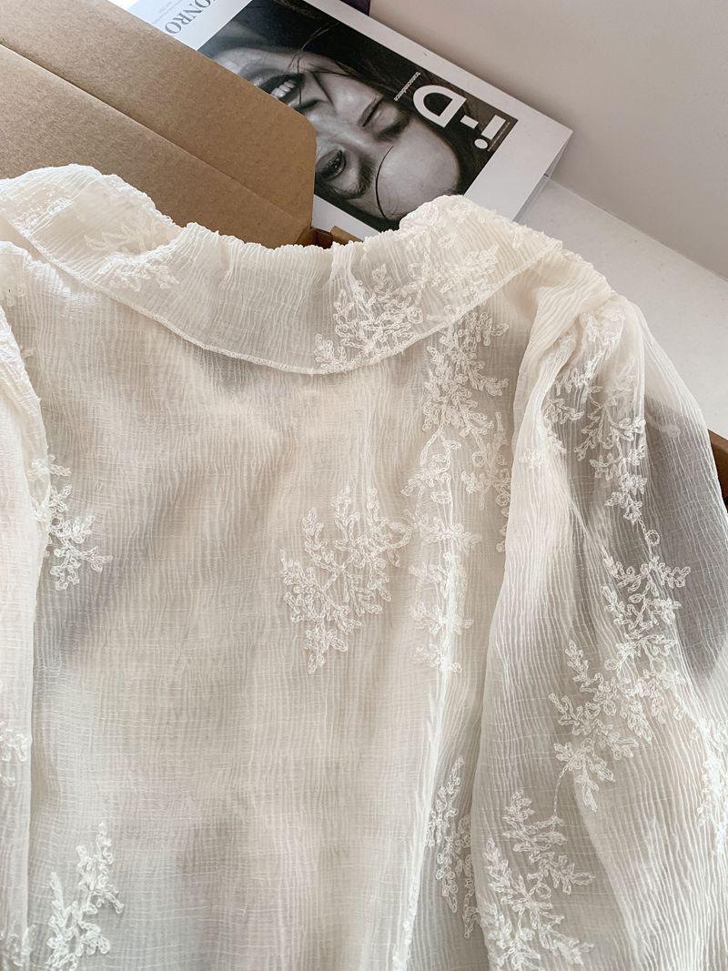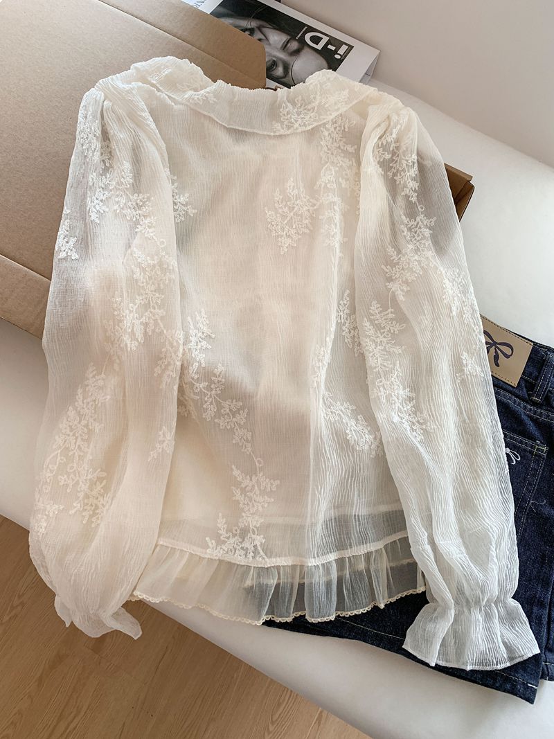 法式温柔风荷叶边衬衫女早春新款蕾丝刺绣娃娃衫设计感小衫