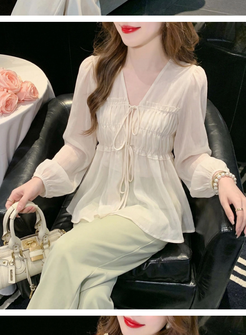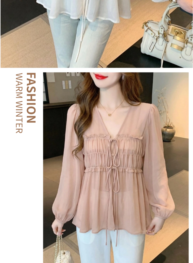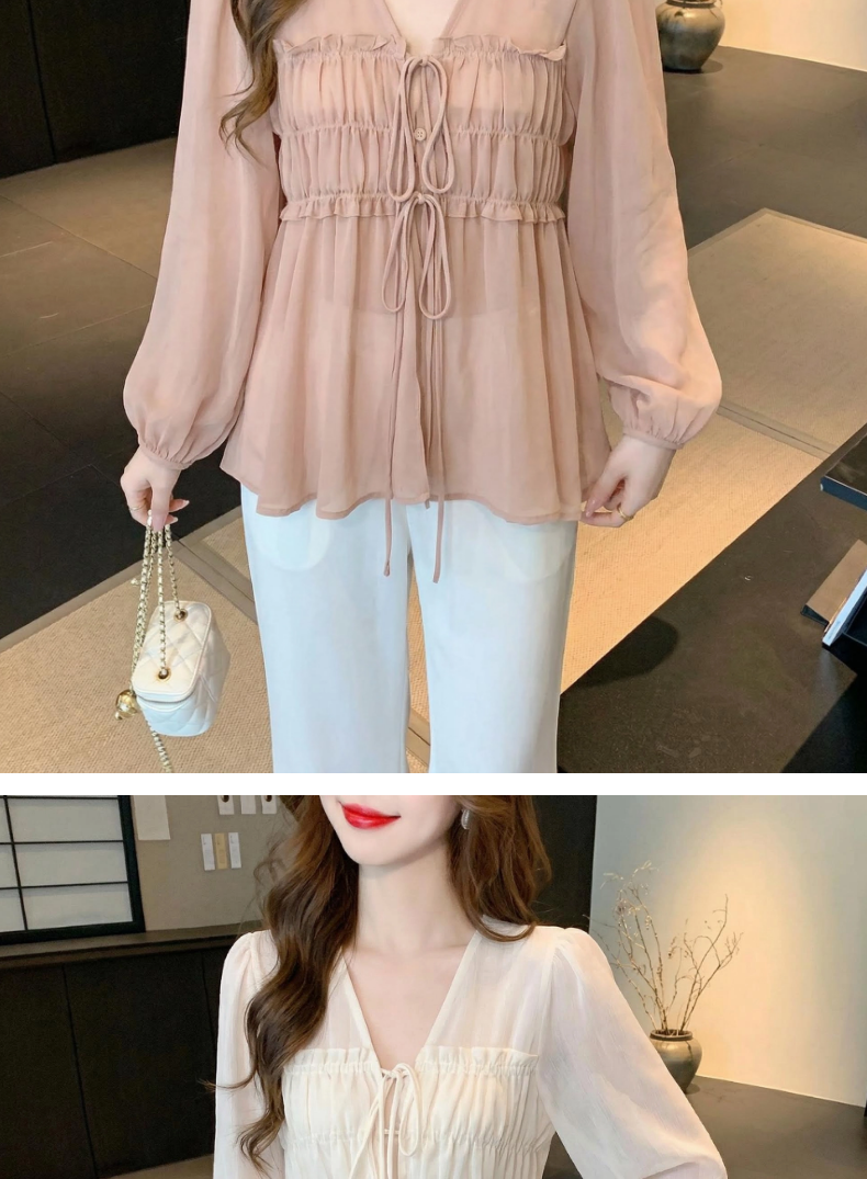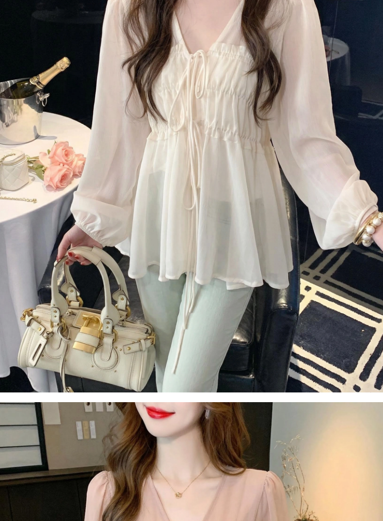 2026夏季新款实拍纯欲风抽褶系带V领衬衫女收腰泡泡袖娃娃衫上衣