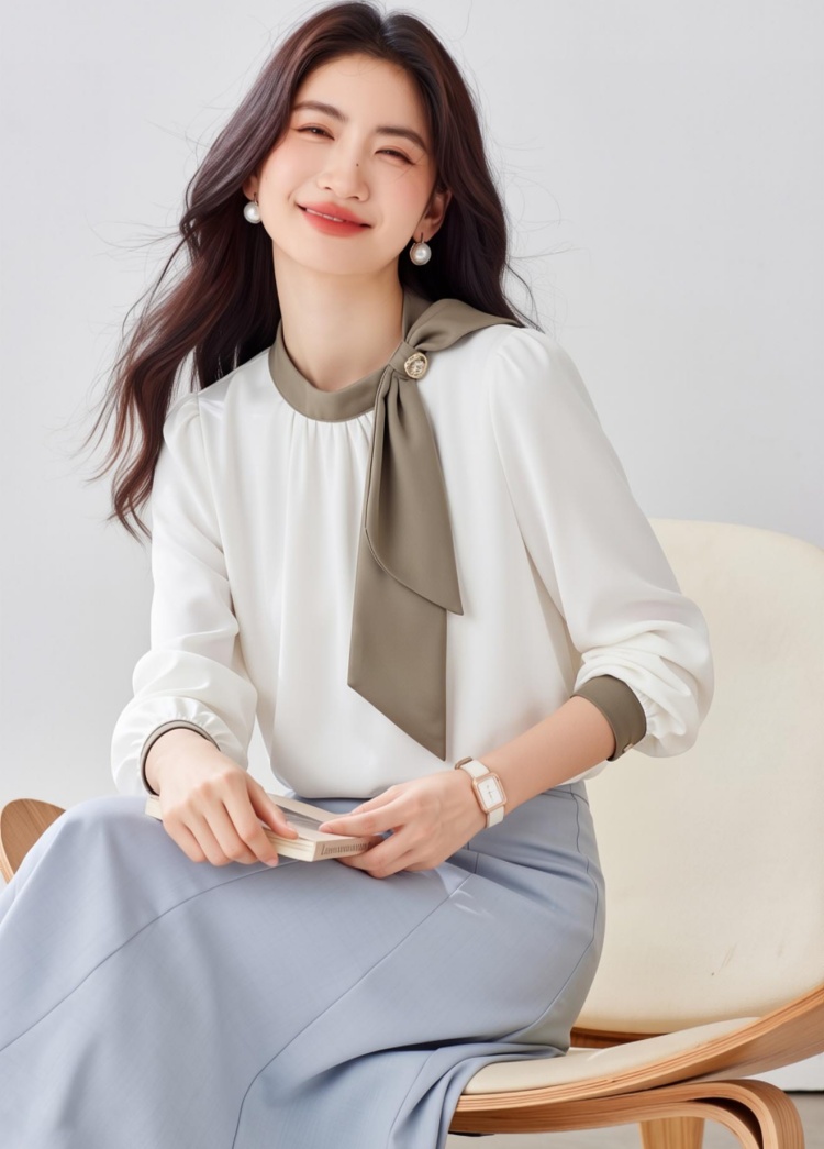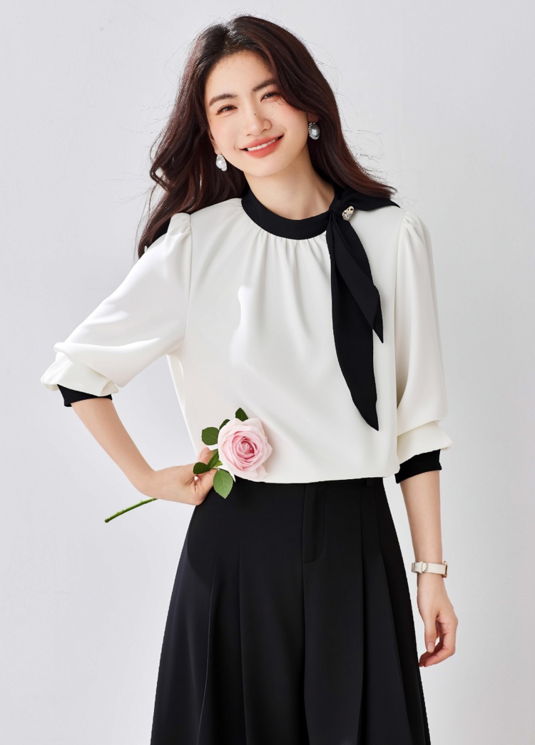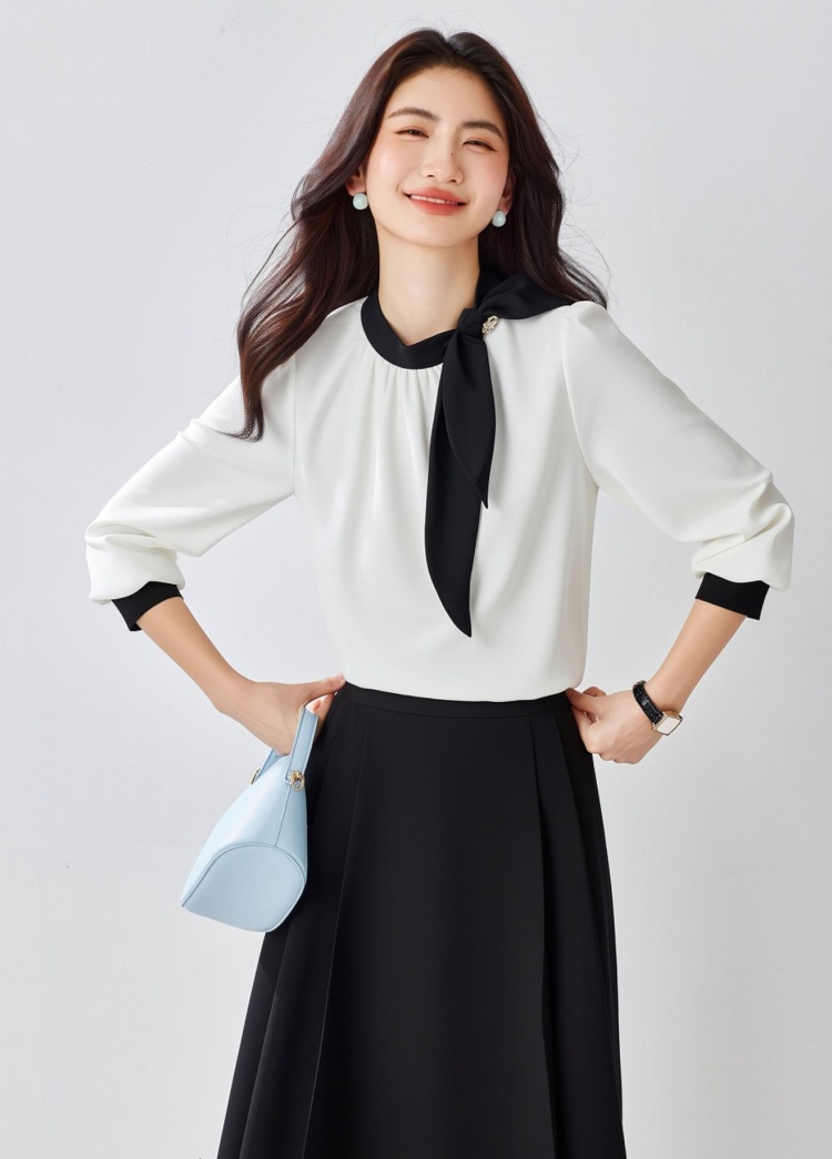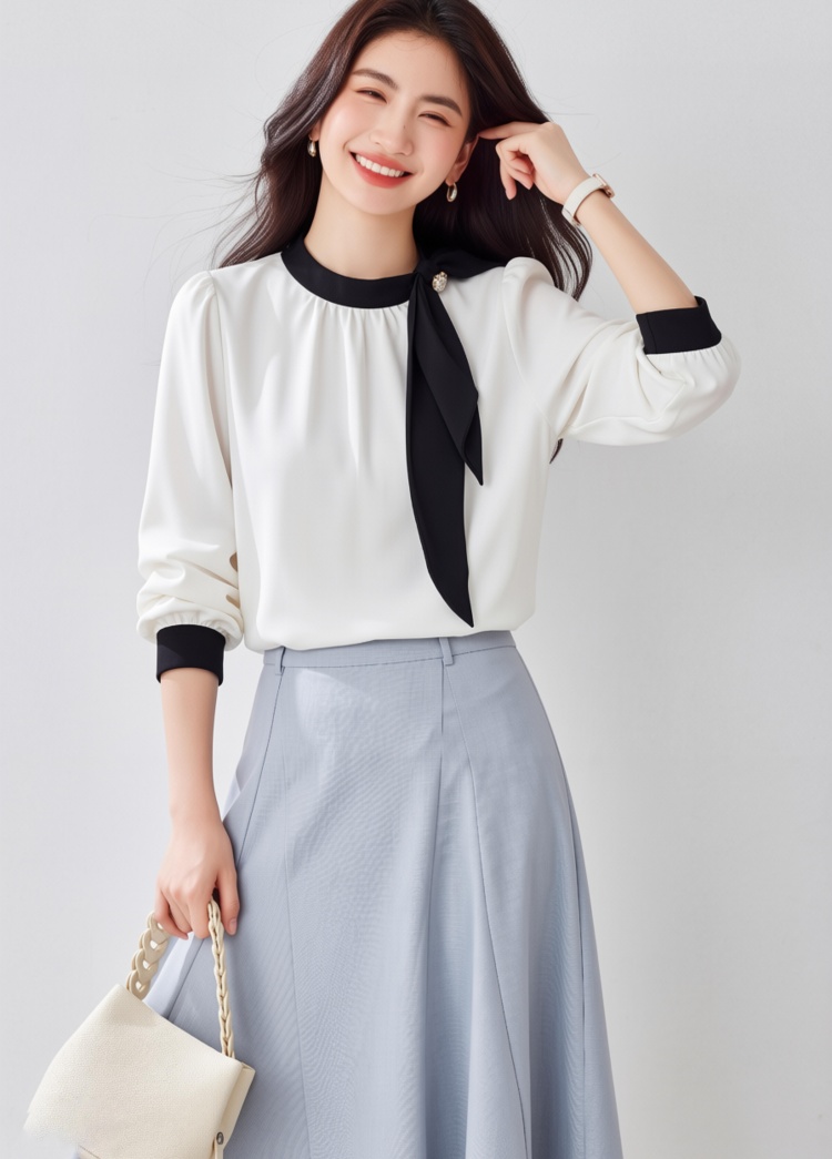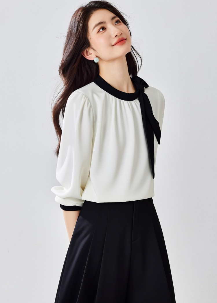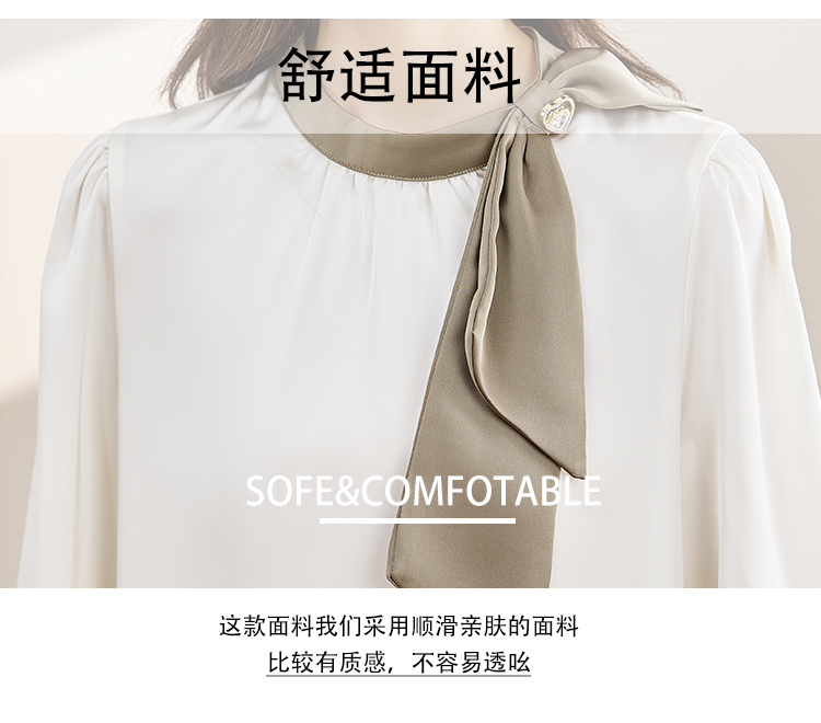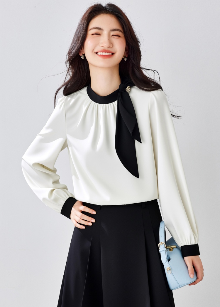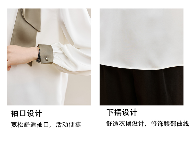 法式温柔领口蝴蝶结衬衫女装2026春秋新款拼色飘带设计感缎面上衣