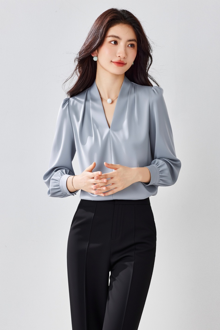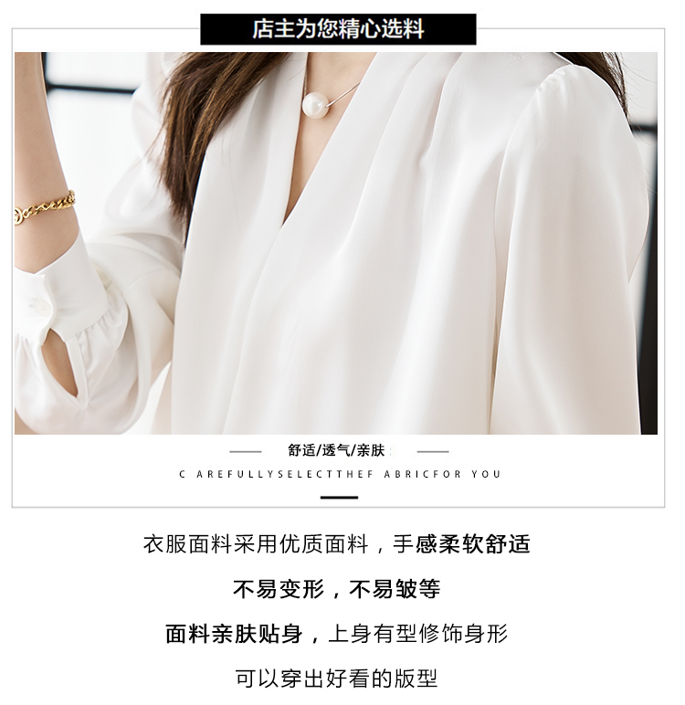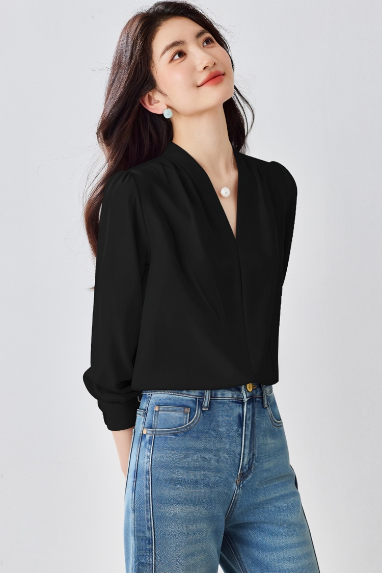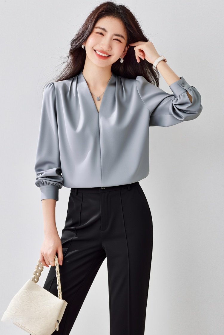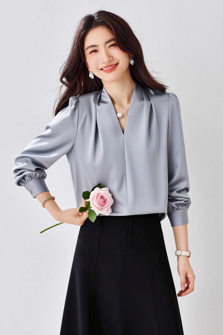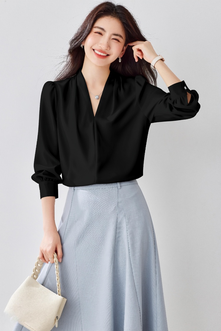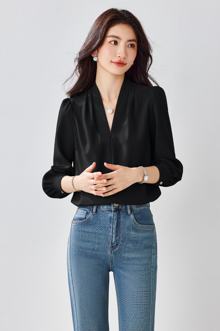 实拍3色 高级感简约衬衫女春季气质V领轻熟风通勤缎面雪纺衫上衣