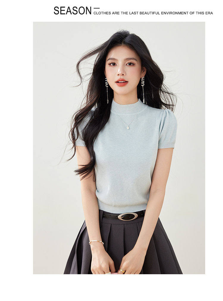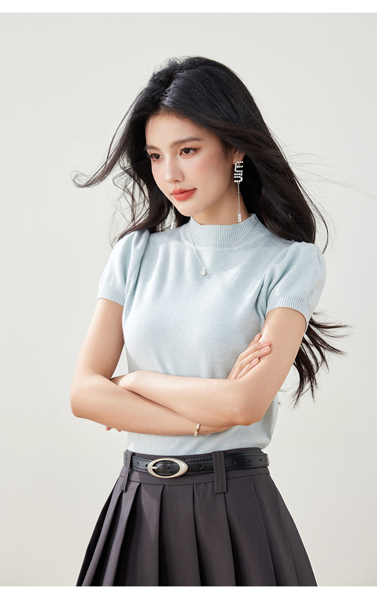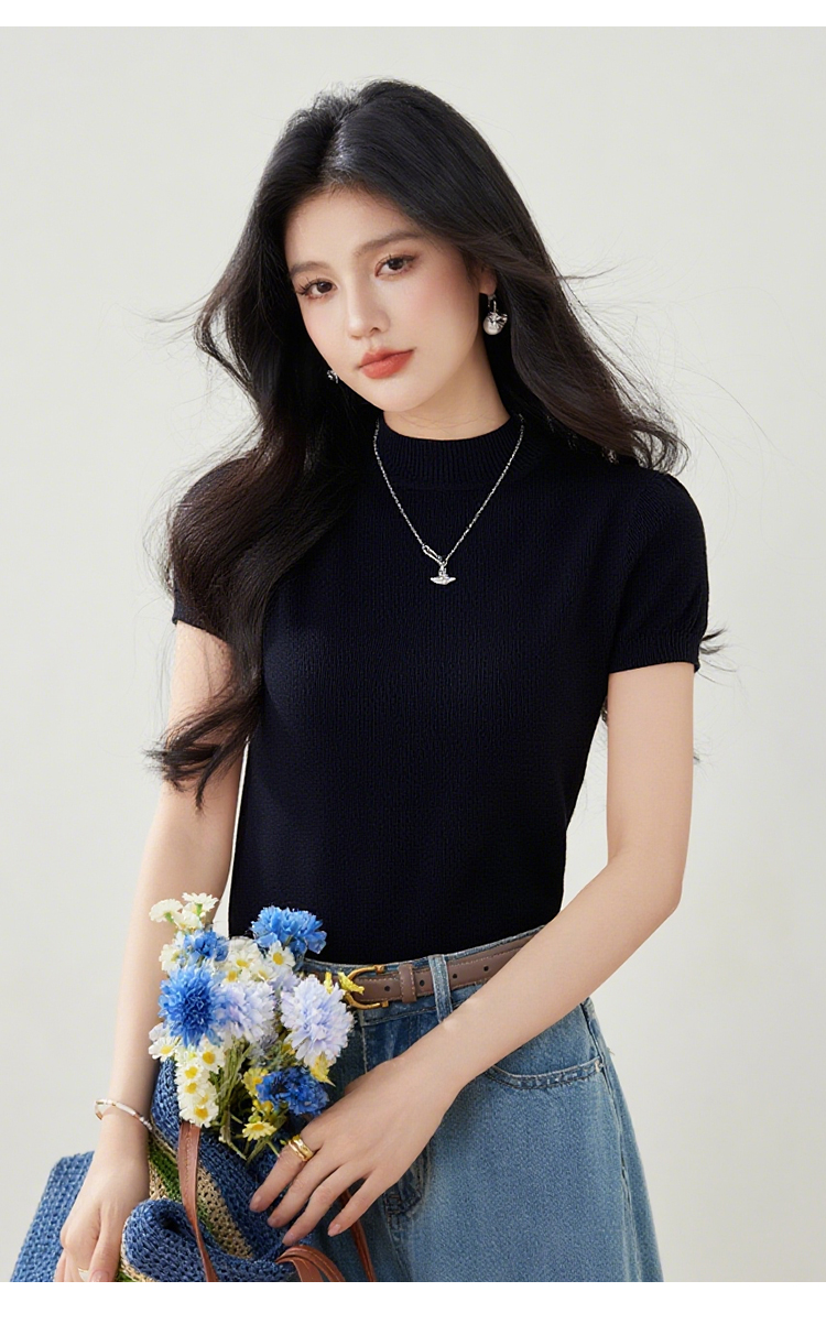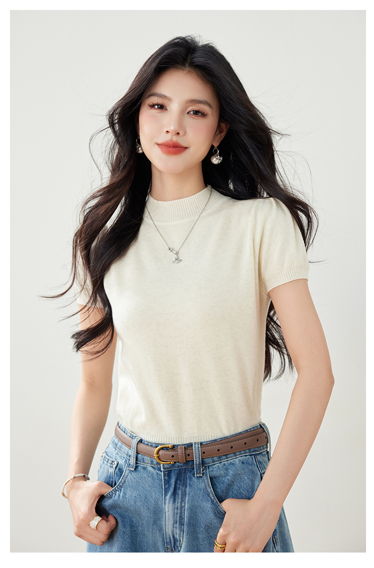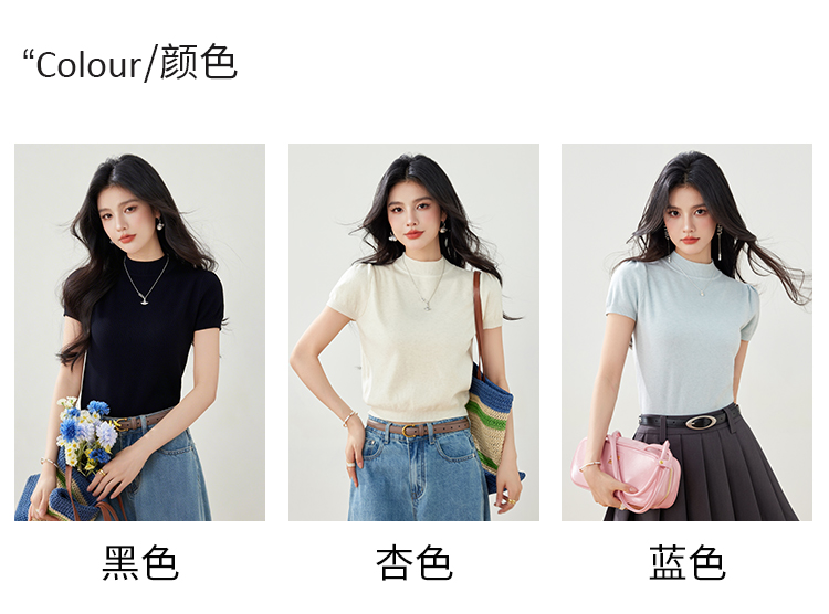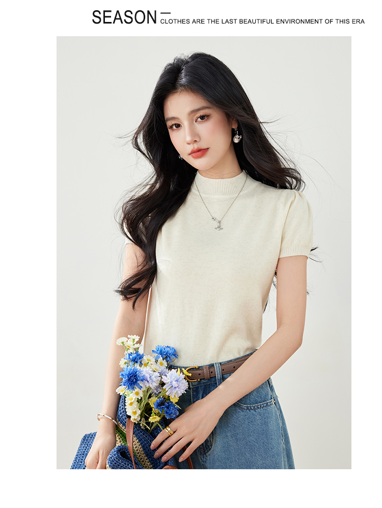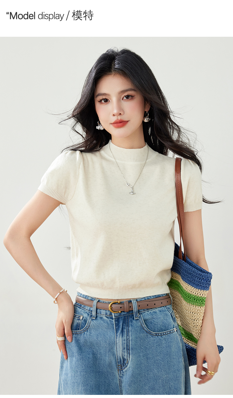 实拍早秋新款短袖针织衫女纯色韩版百搭短款修身小款小个子女