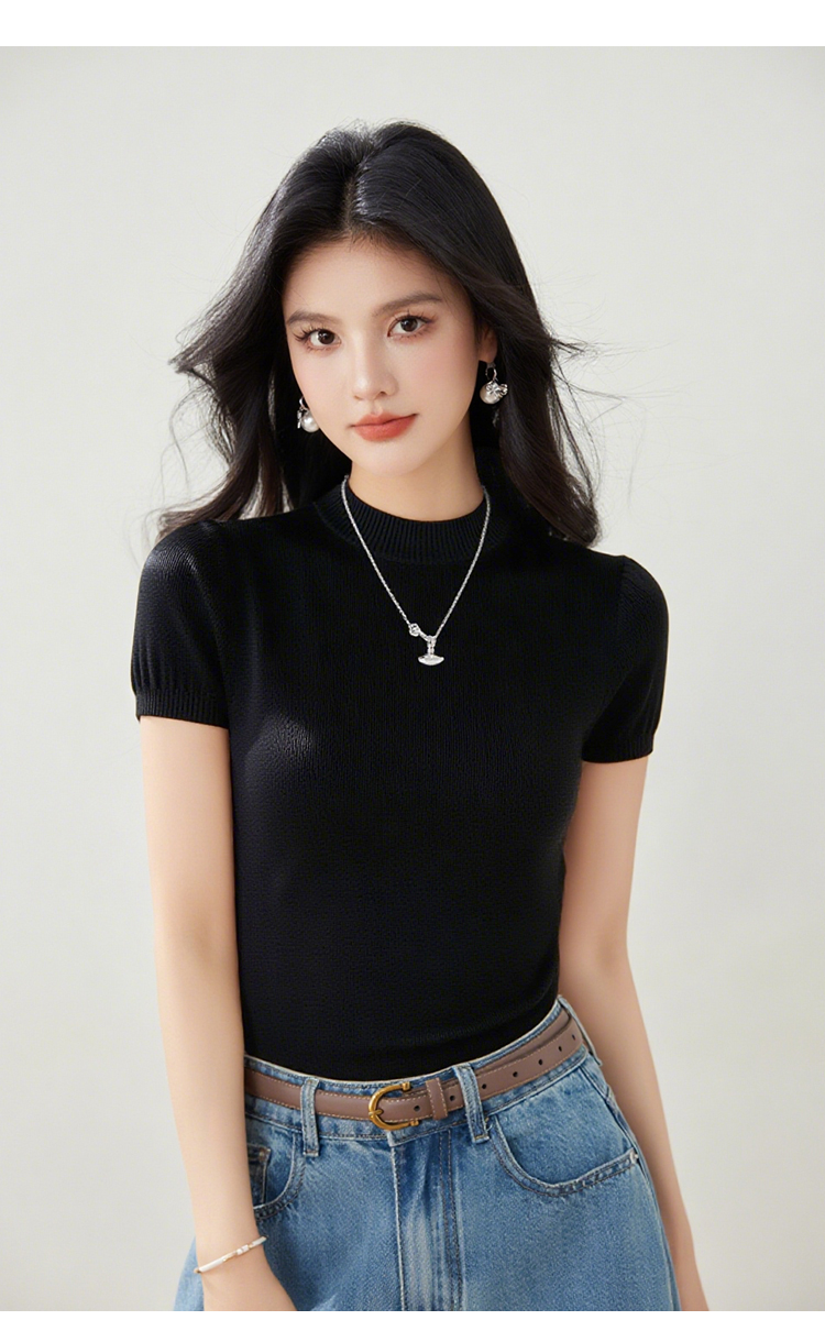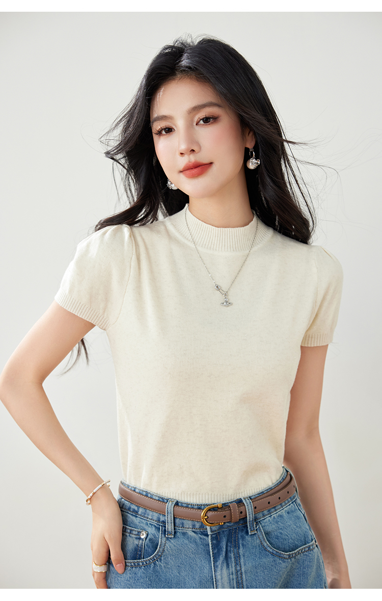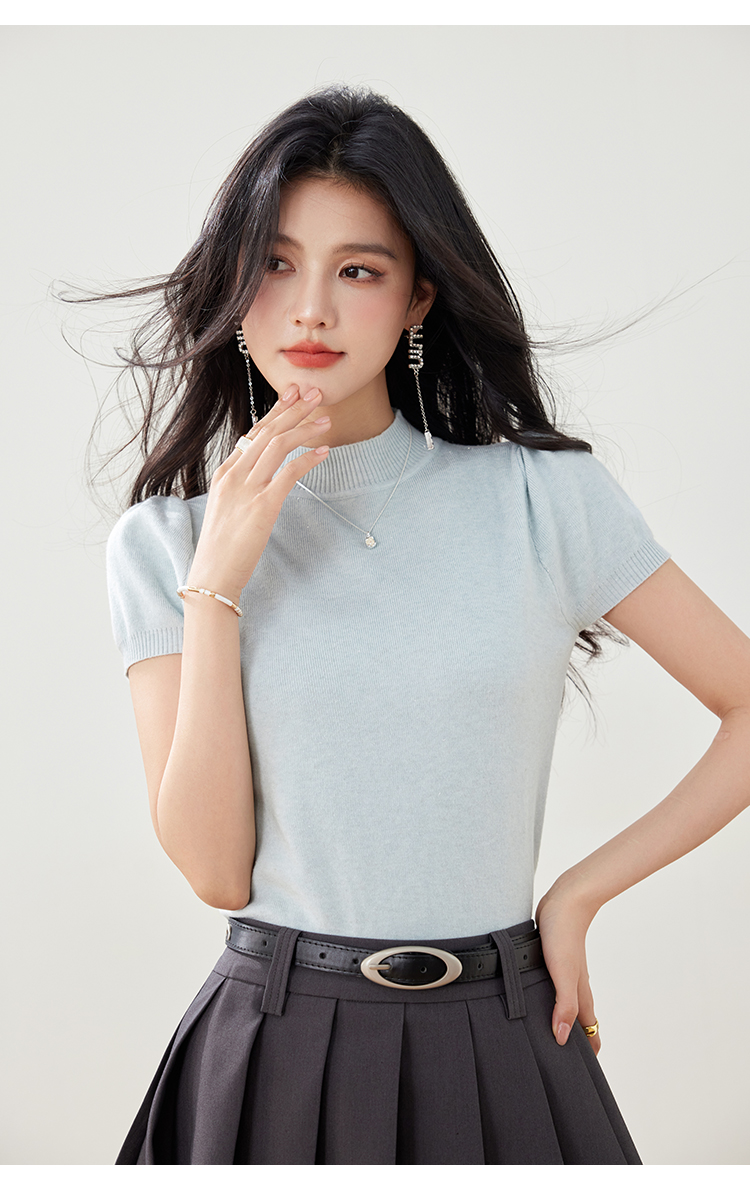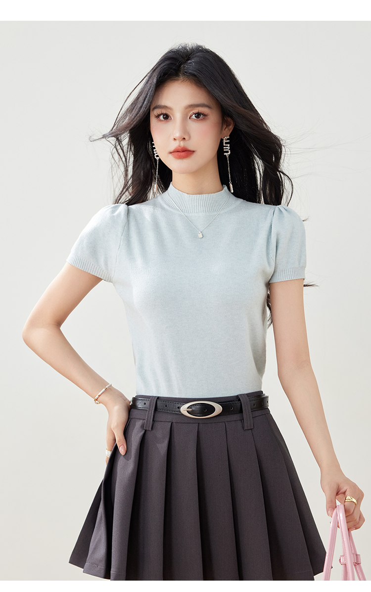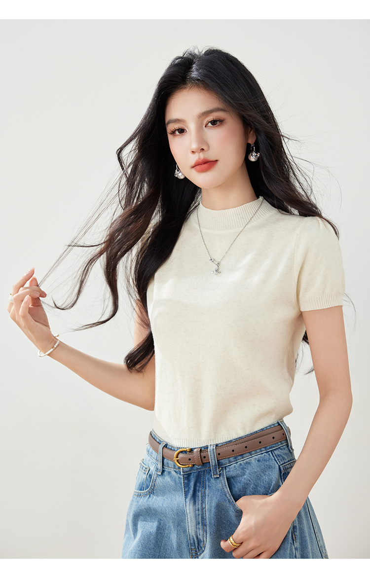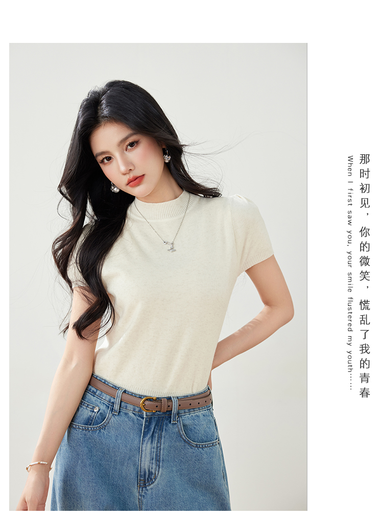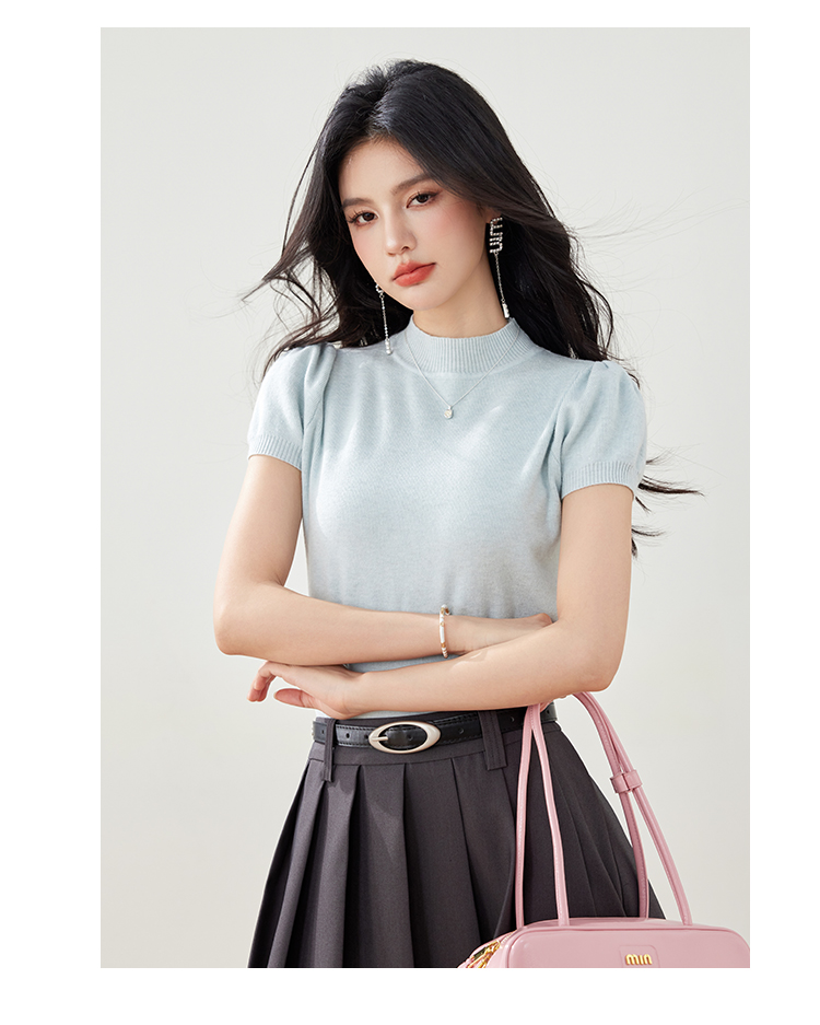 实拍早秋新款短袖针织衫女纯色韩版百搭短款修身小款小个子女