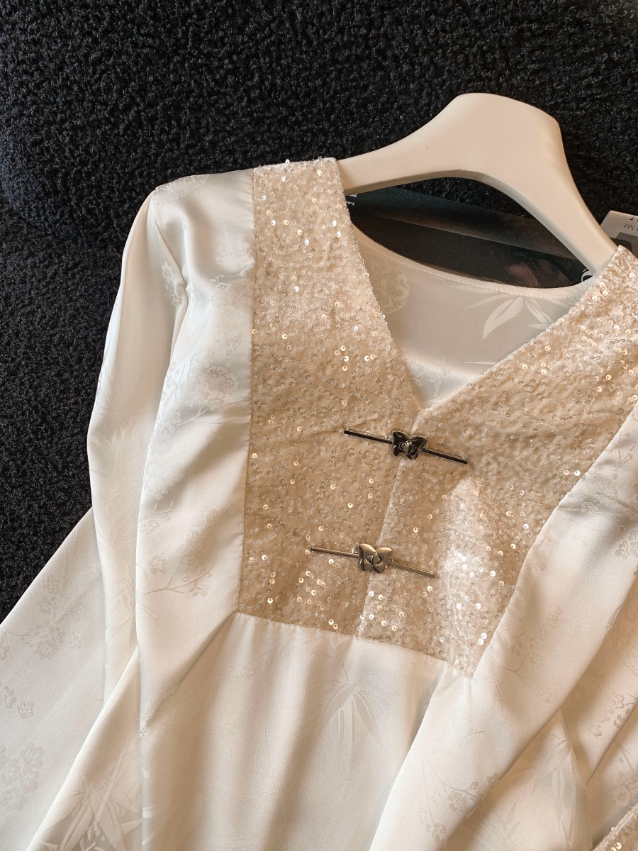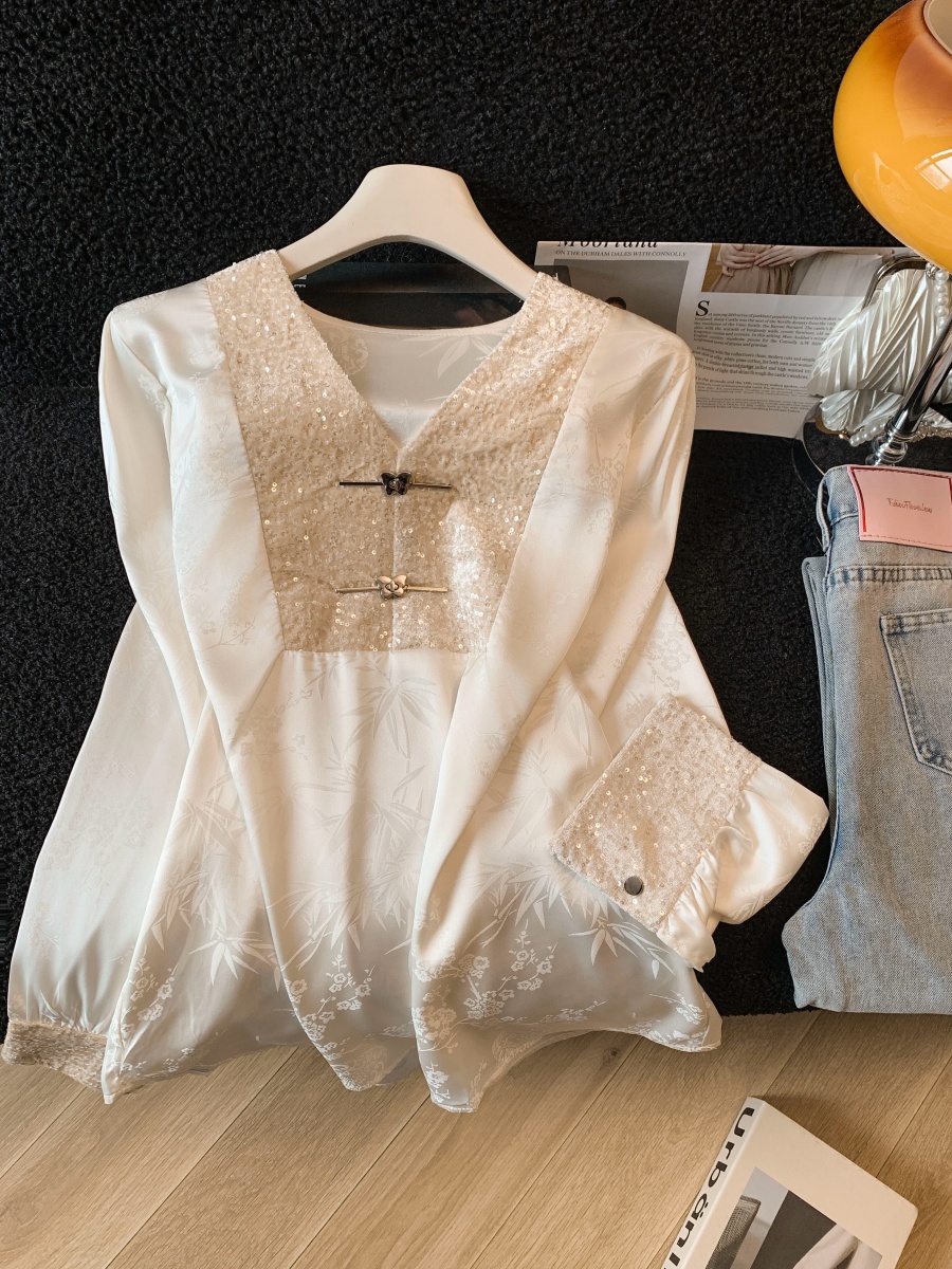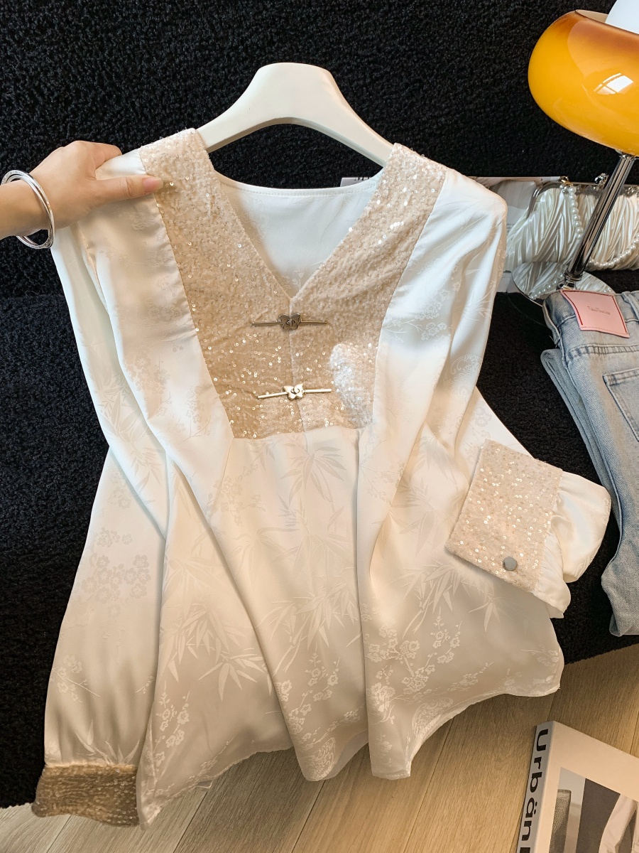 实拍高级感V领亮片拼接长袖衬衫女春2026新款温柔气质新中式衬衣
