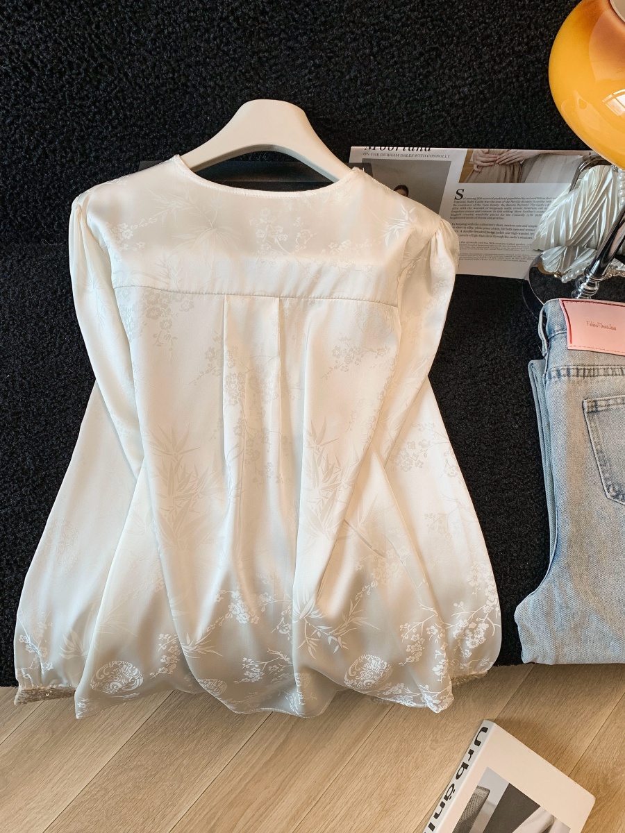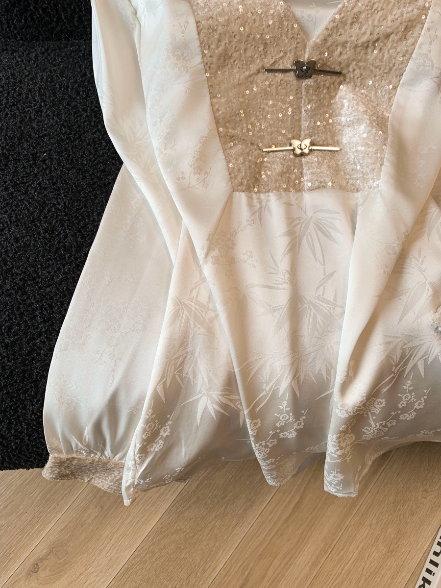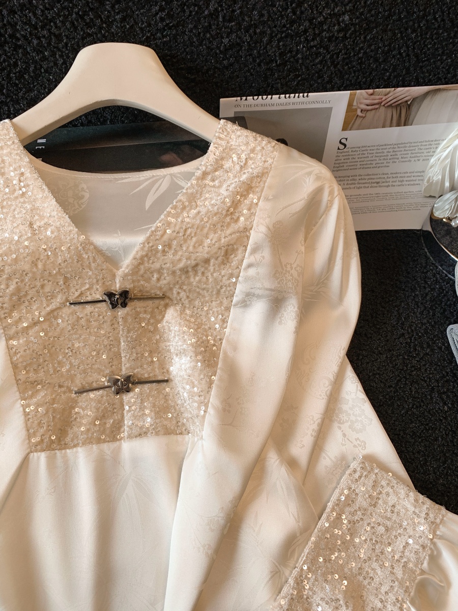 实拍高级感V领亮片拼接长袖衬衫女春2026新款温柔气质新中式衬衣