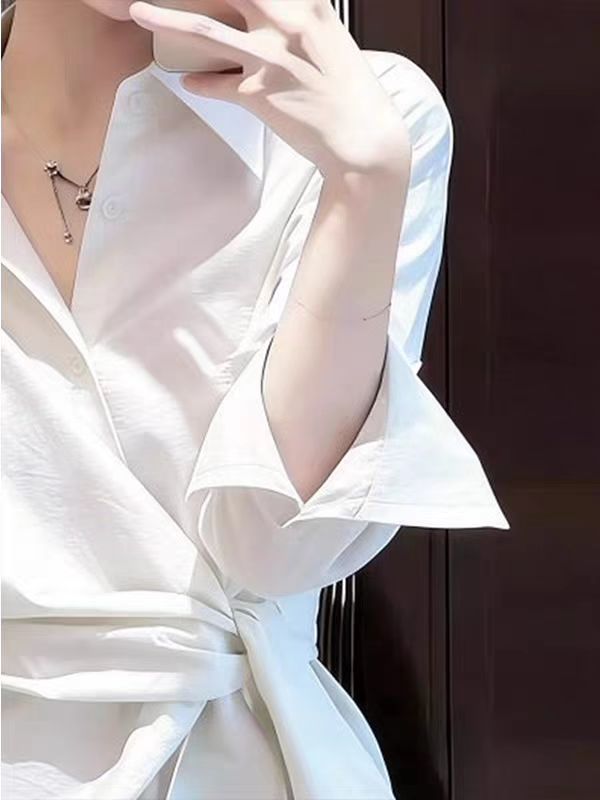 白色显白收腰绑带设计感翻领上衣2026春季女装新款翻领洋派衬衫潮