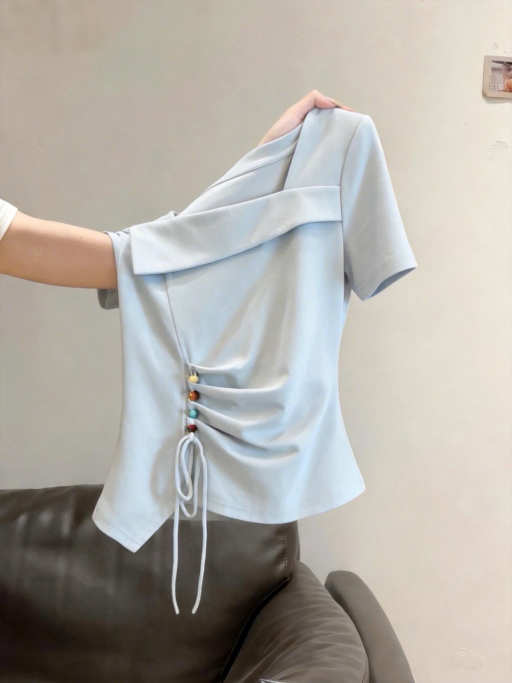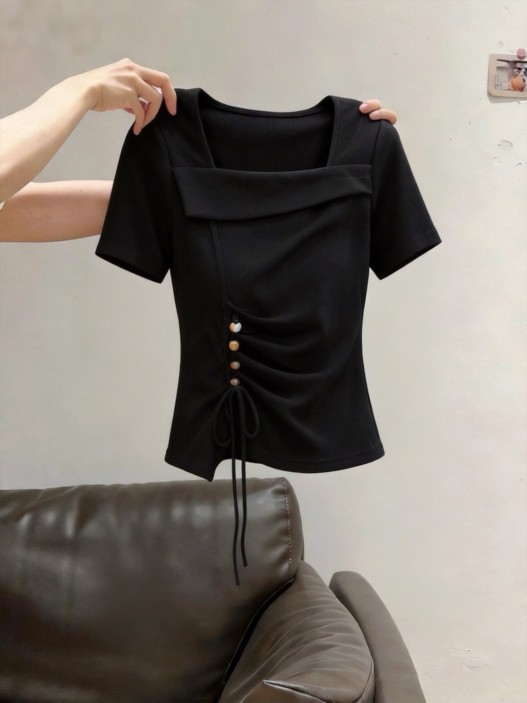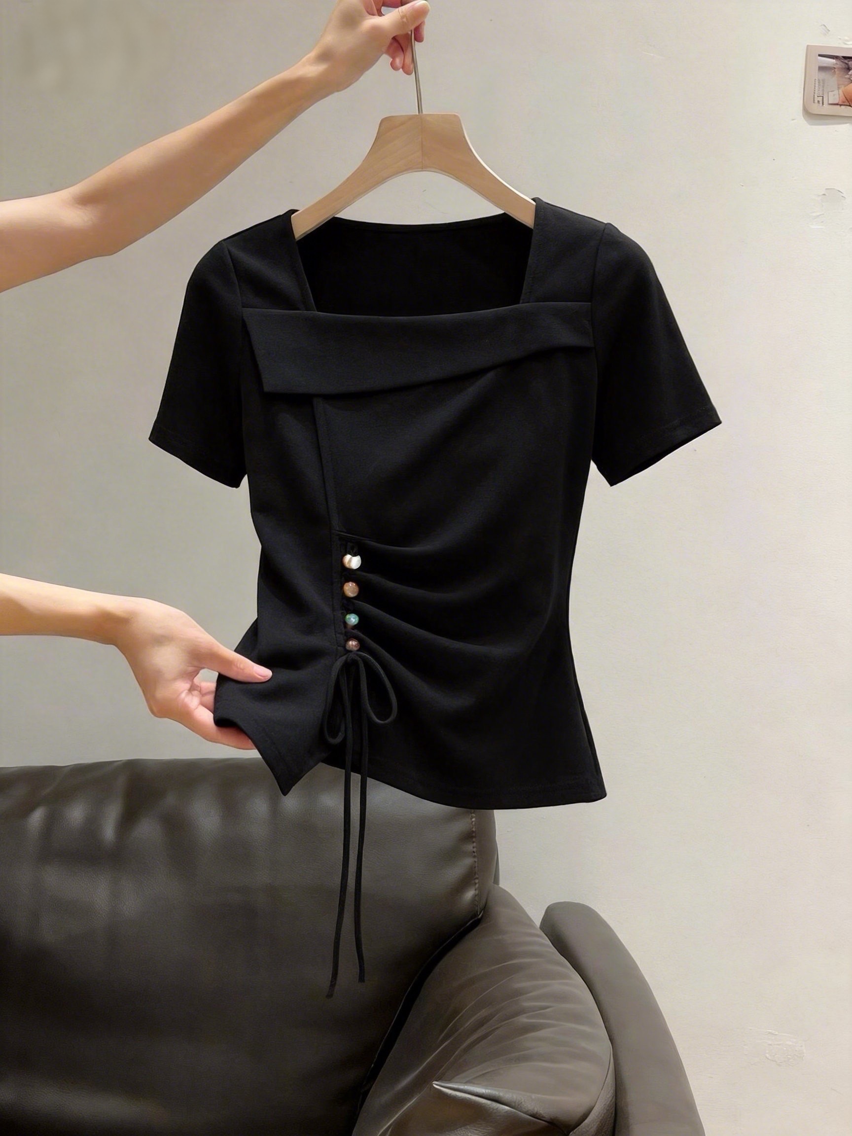 实拍新中式黑色设计感短袖T恤女夏季国风方领别致独特正肩上衣