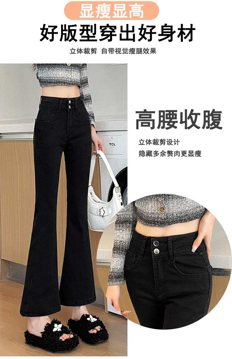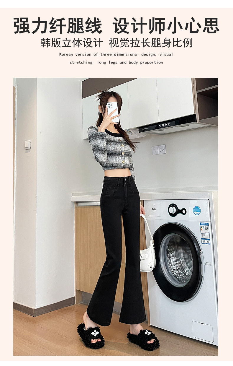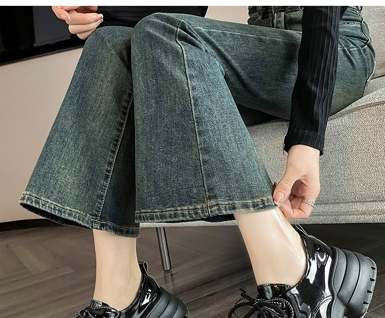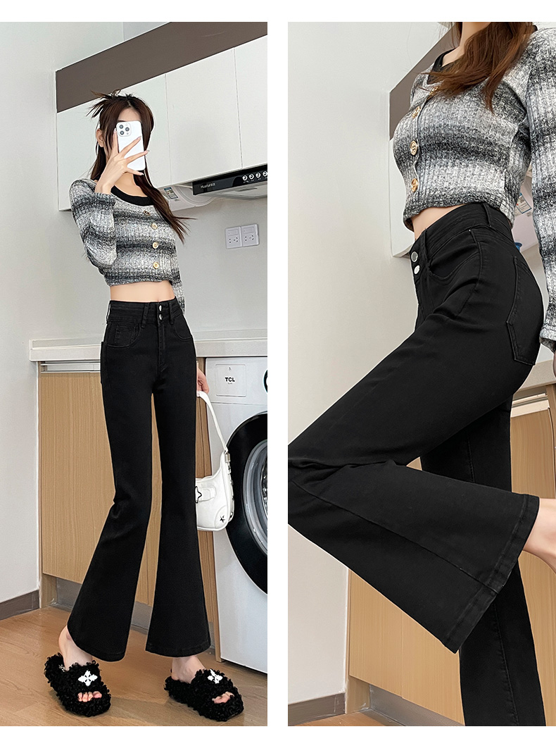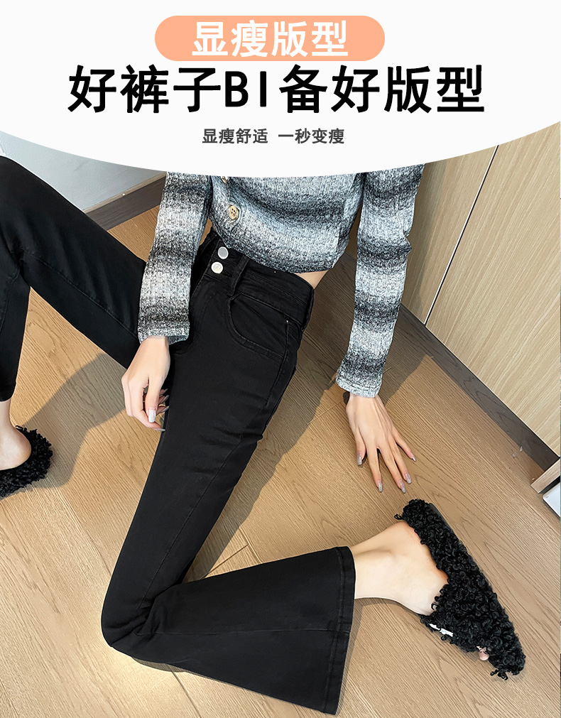 双排扣水泥灰微喇牛仔裤女修身显瘦春秋秋装复古怀旧收腹提臀马蹄