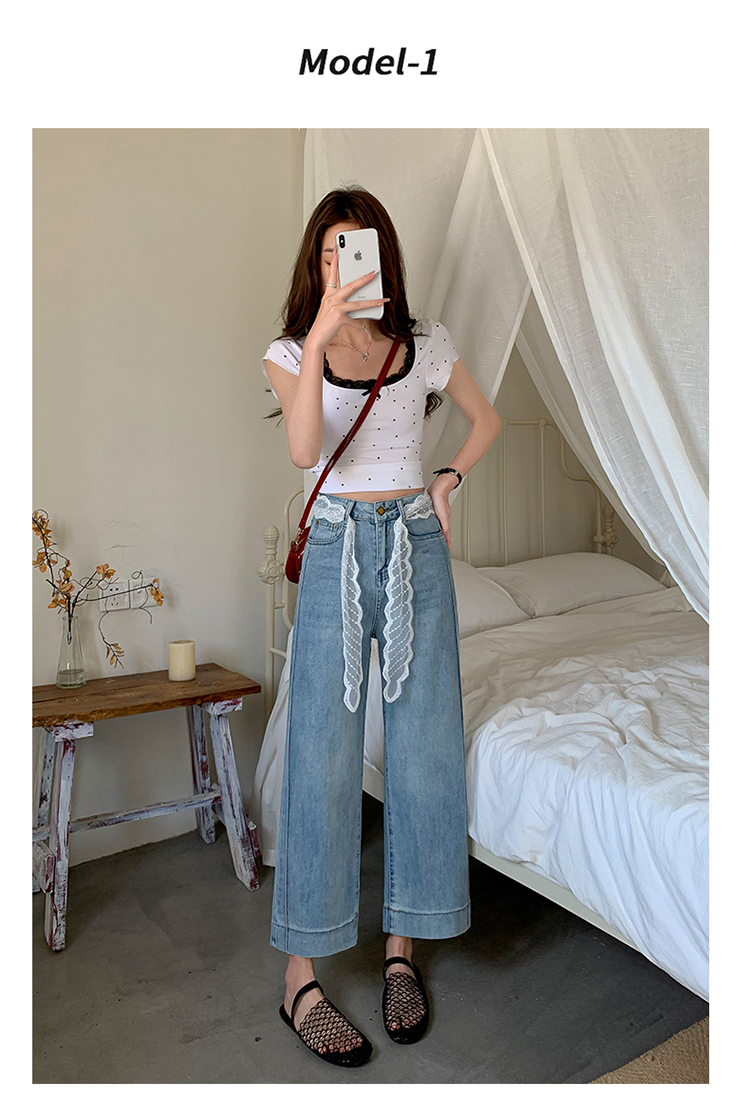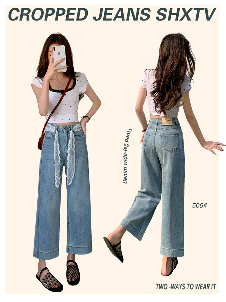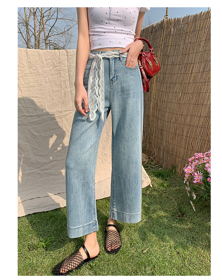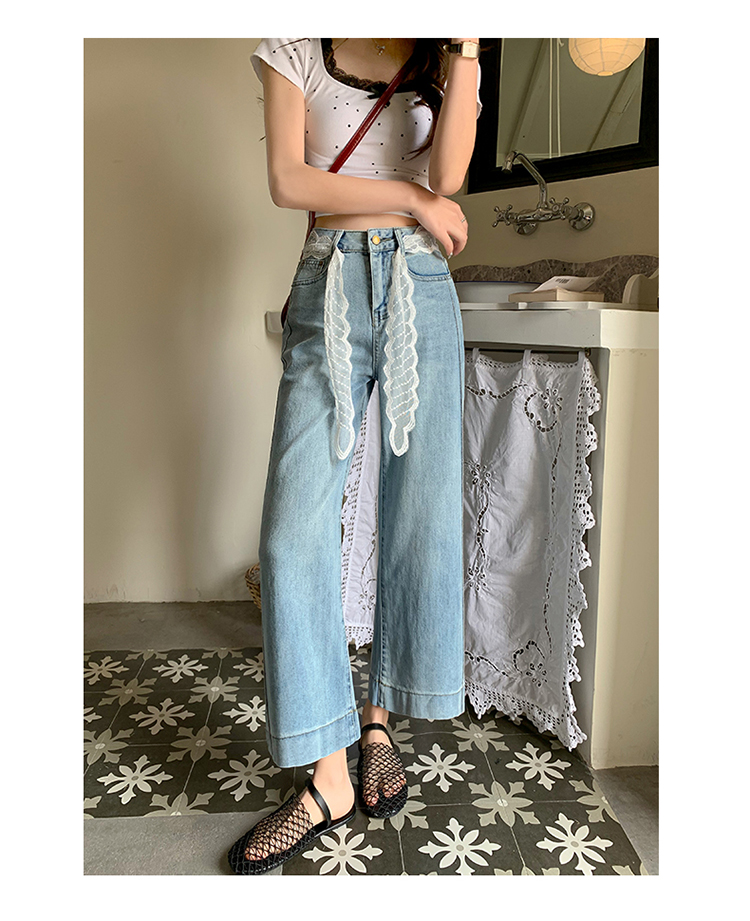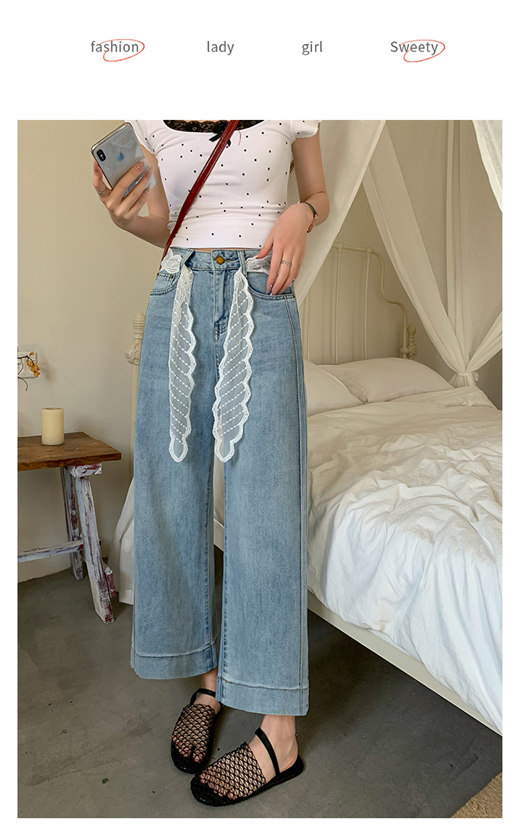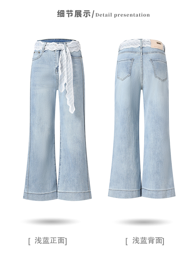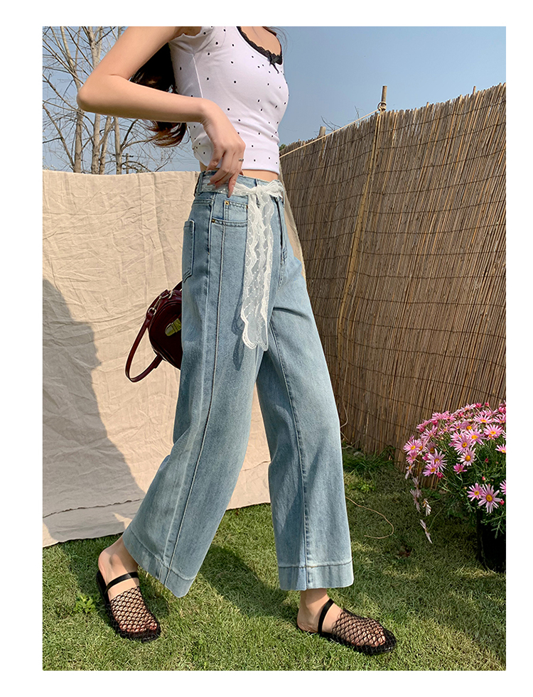 浅色阔腿牛仔裤女春2026新款蕾丝系带高腰直筒宽松显瘦九分烟管裤