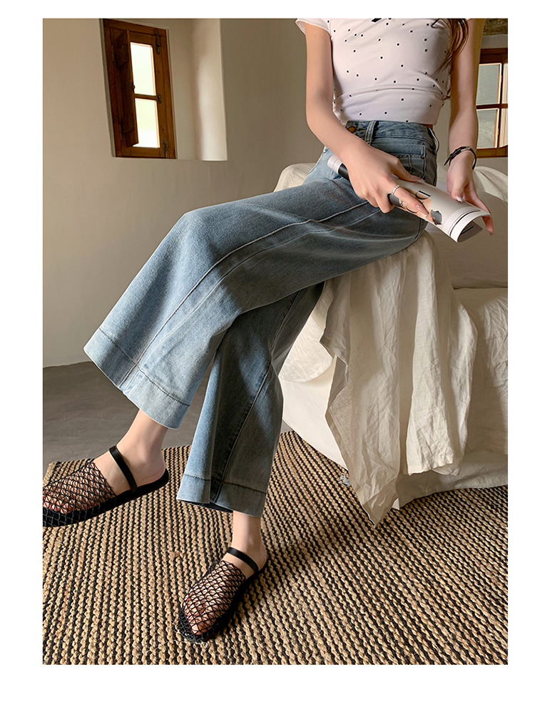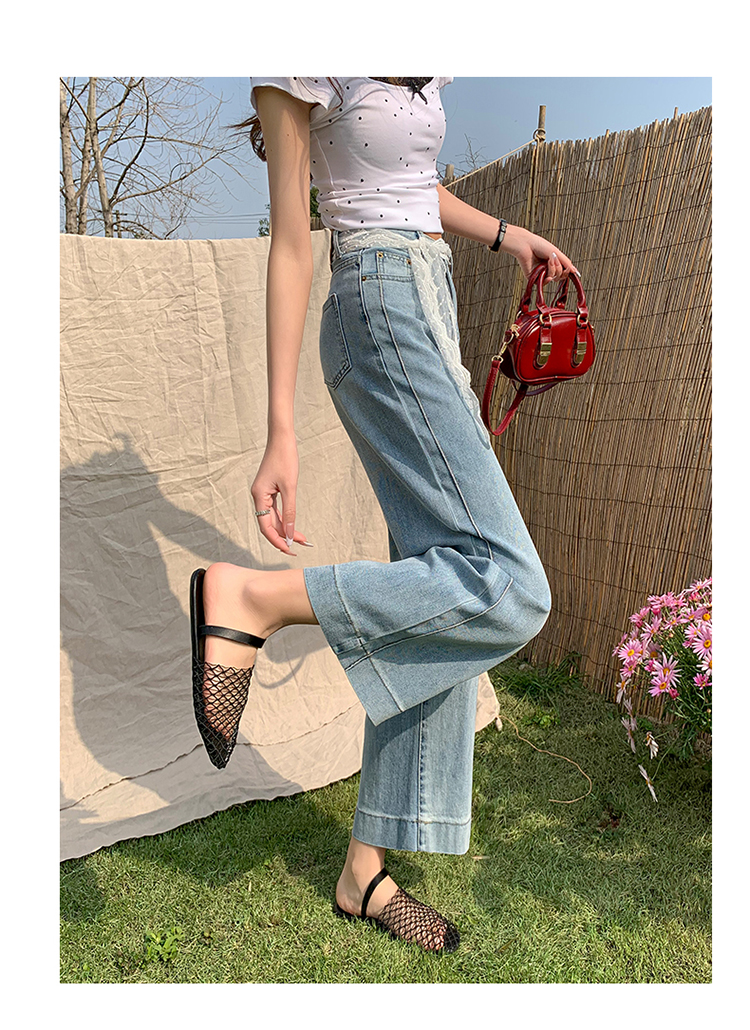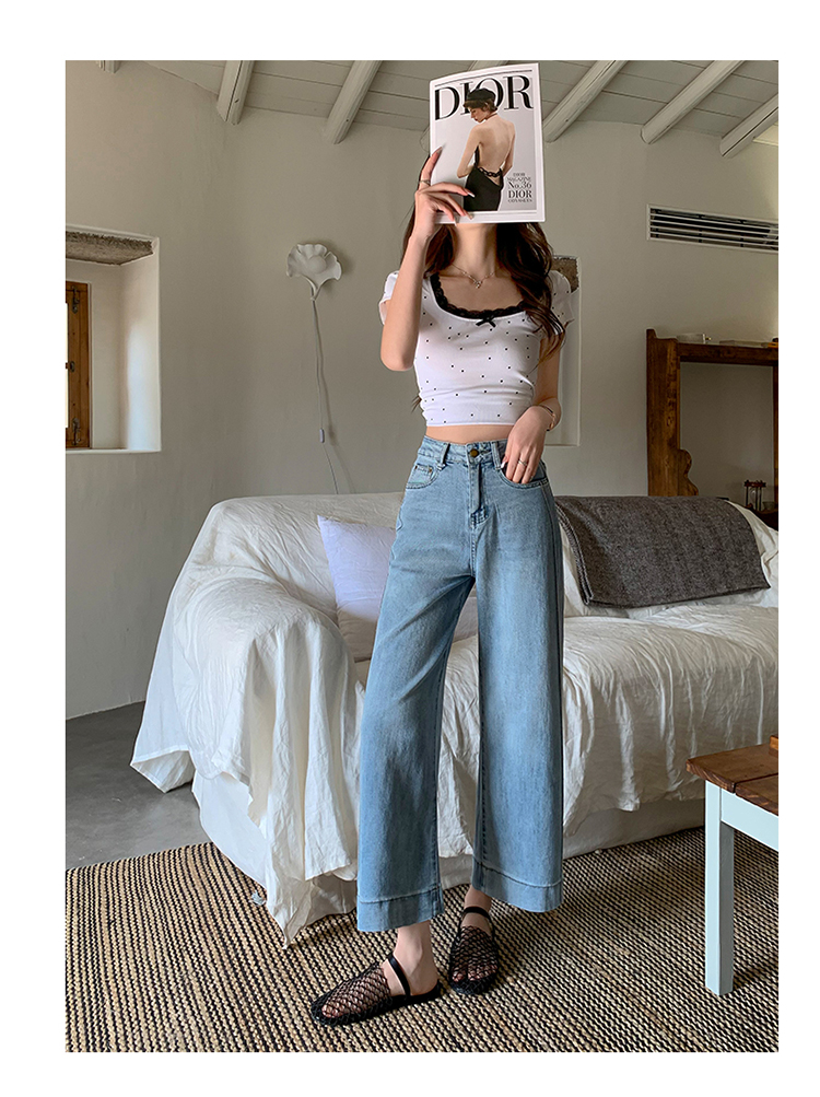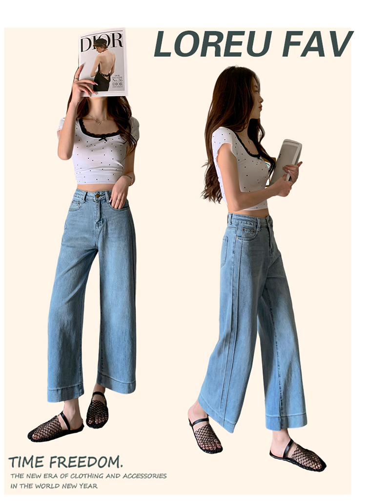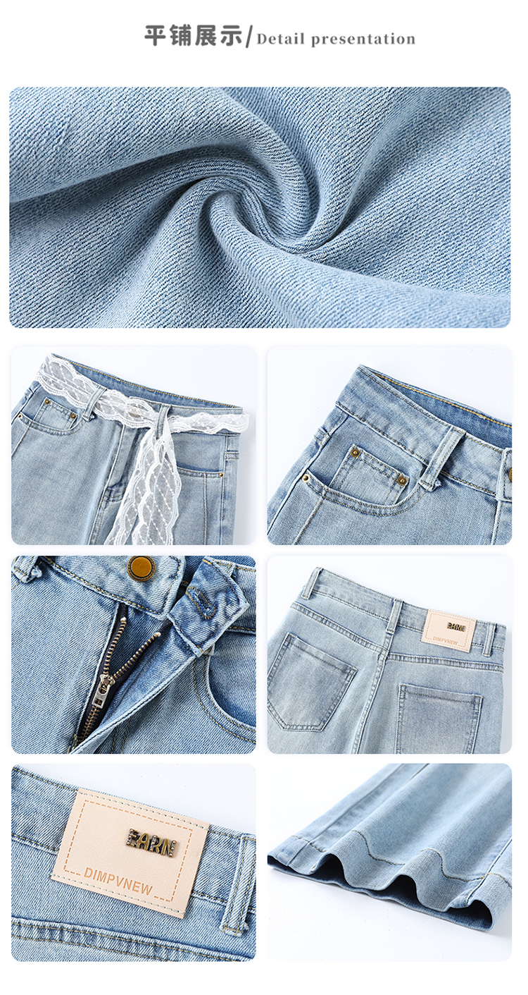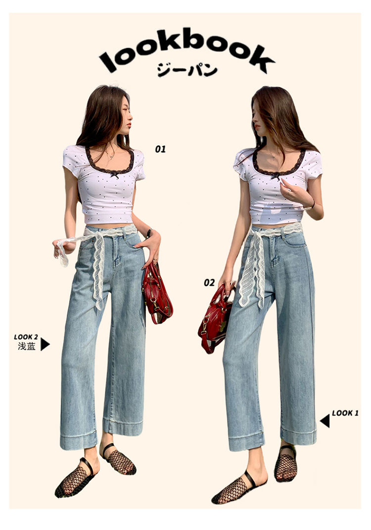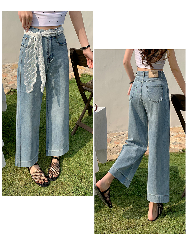 浅色阔腿牛仔裤女春2026新款蕾丝系带高腰直筒宽松显瘦九分烟管裤