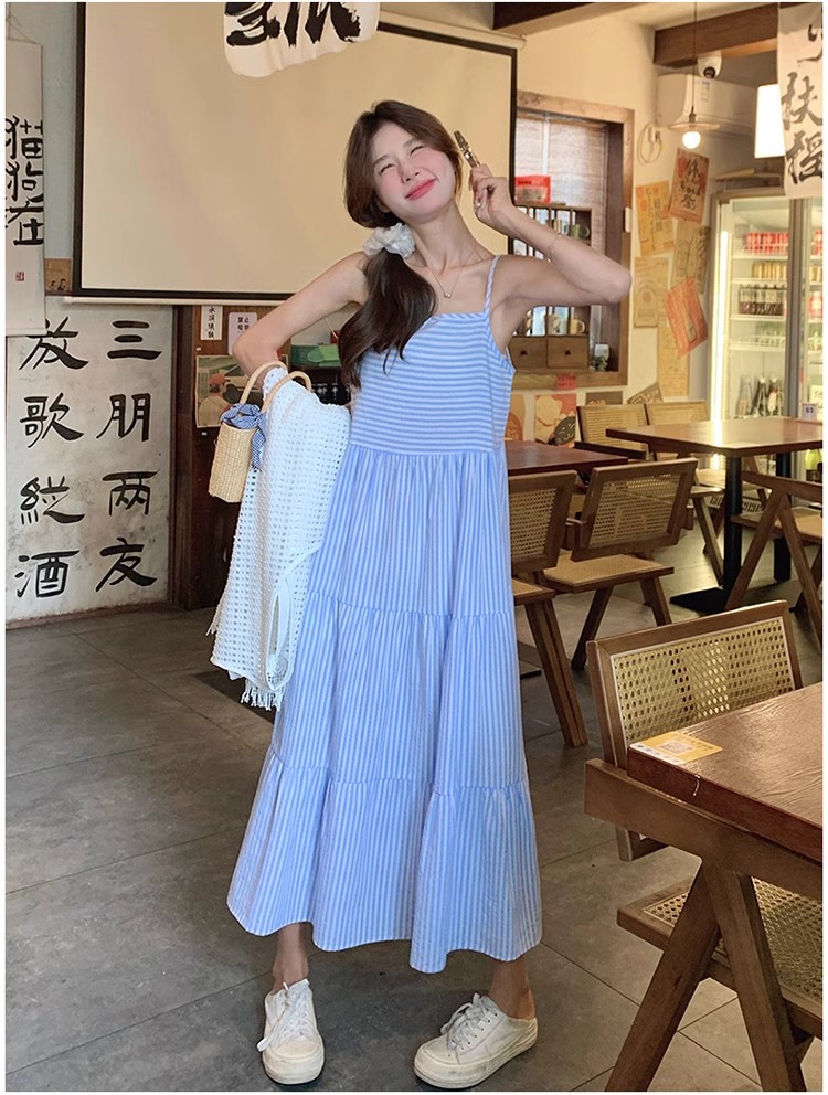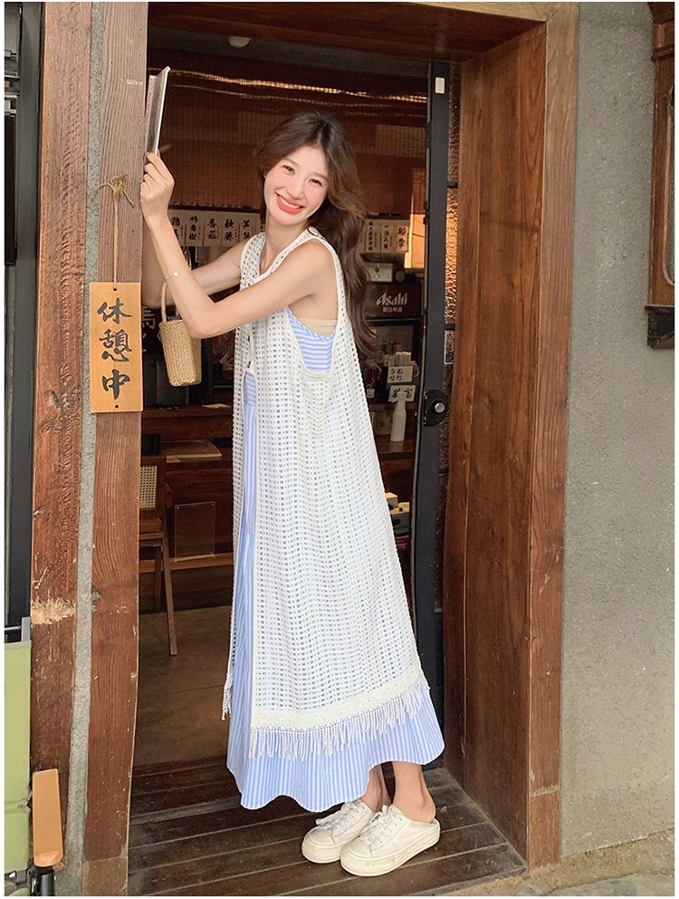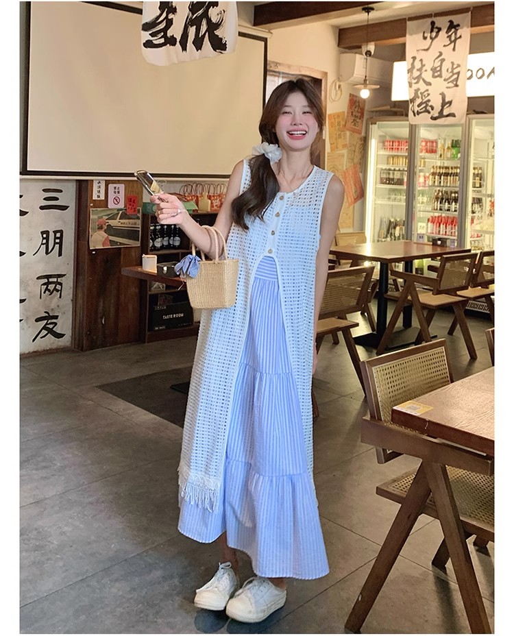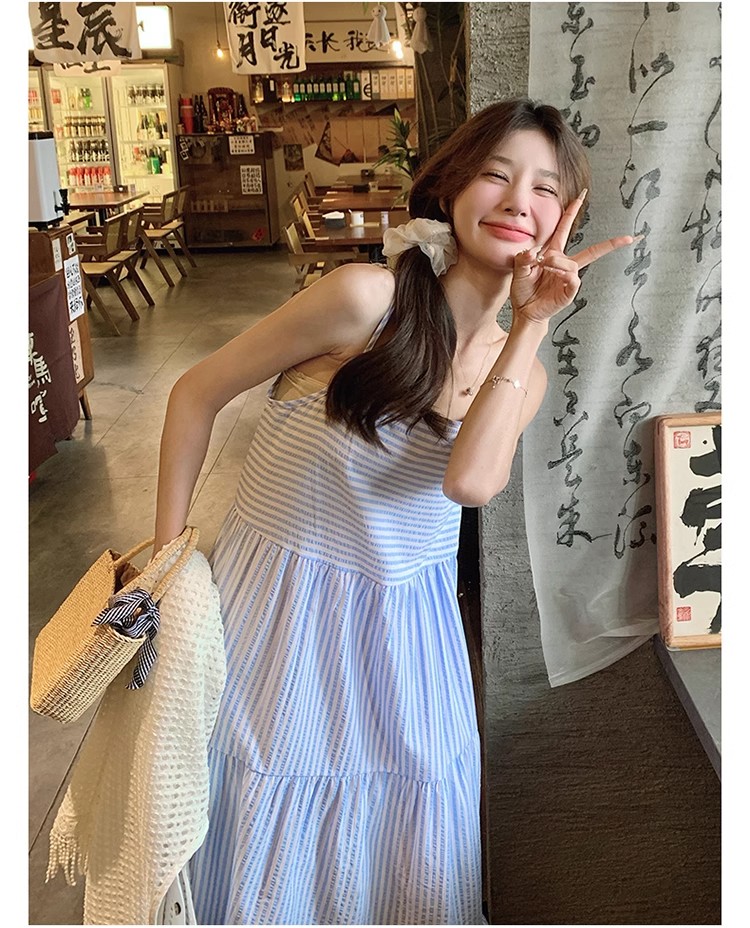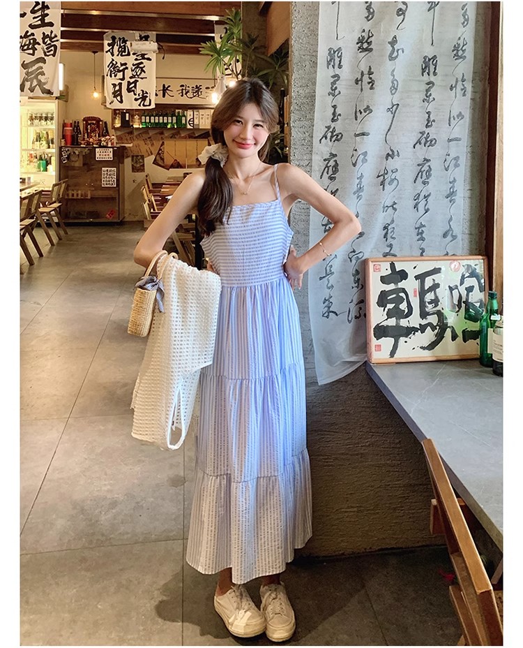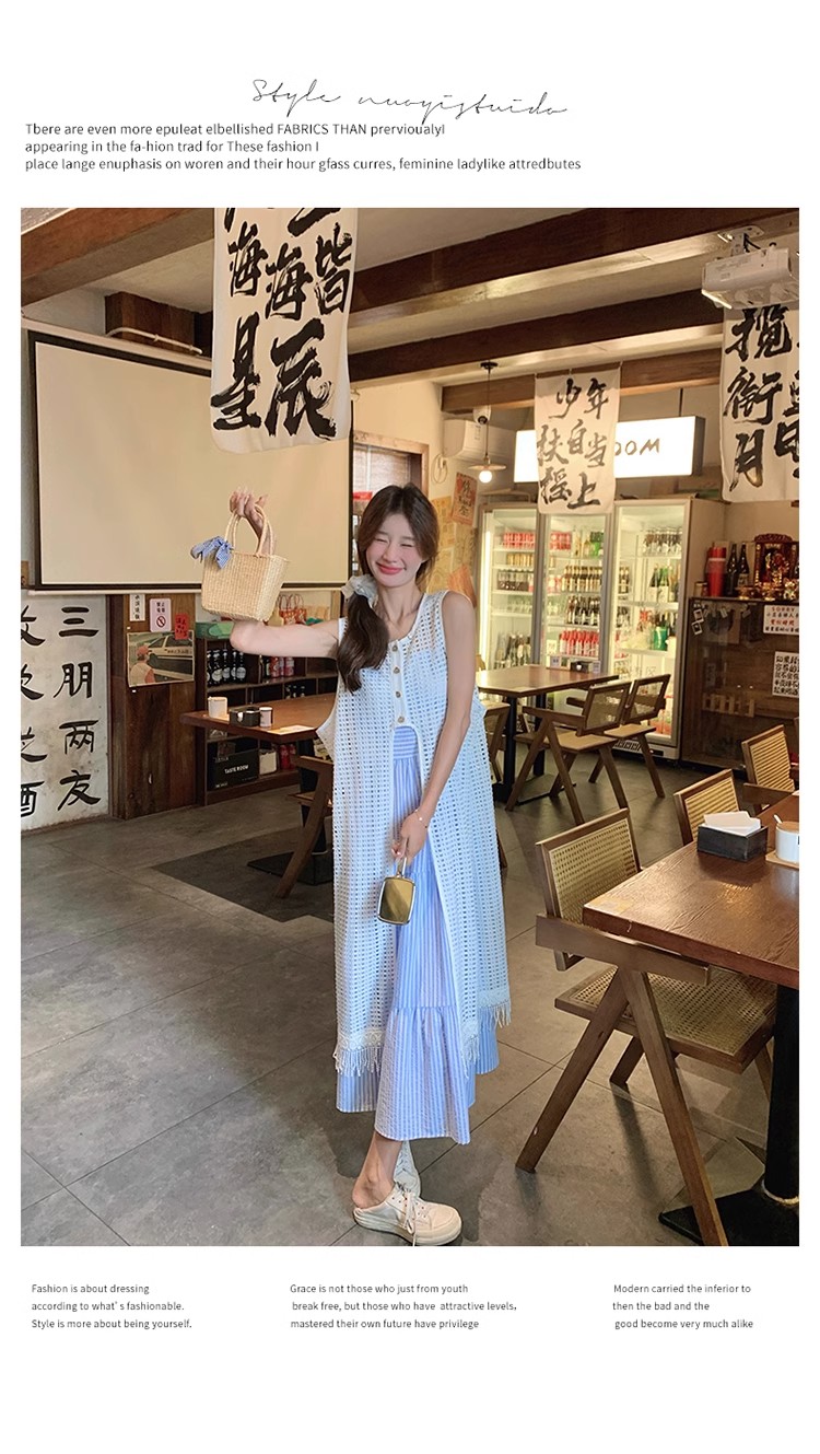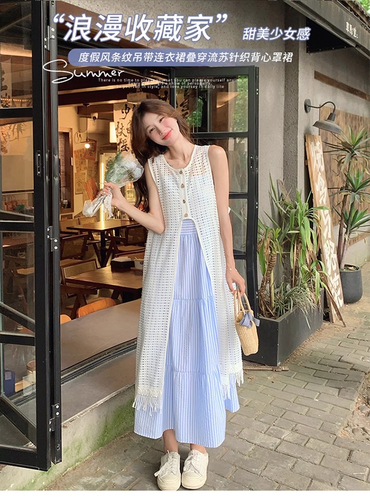 蓝色条纹吊带裙套装女夏2026新款超好看罩衫连衣裙夏季搭配一整套