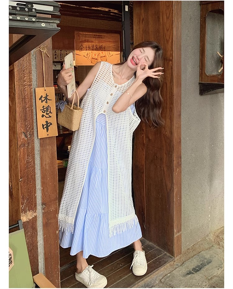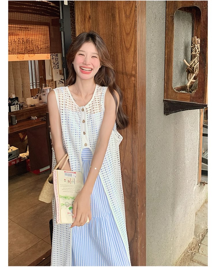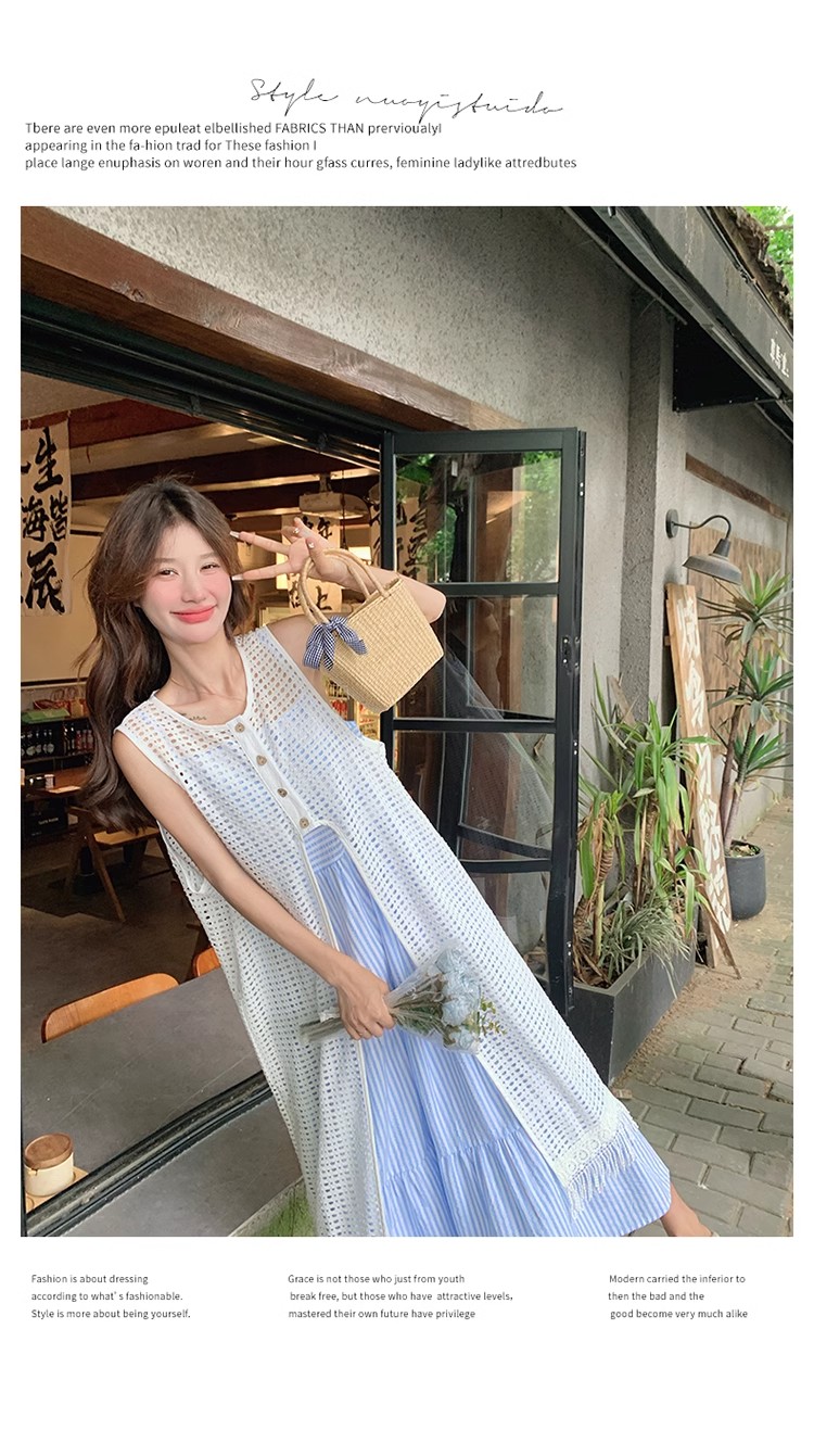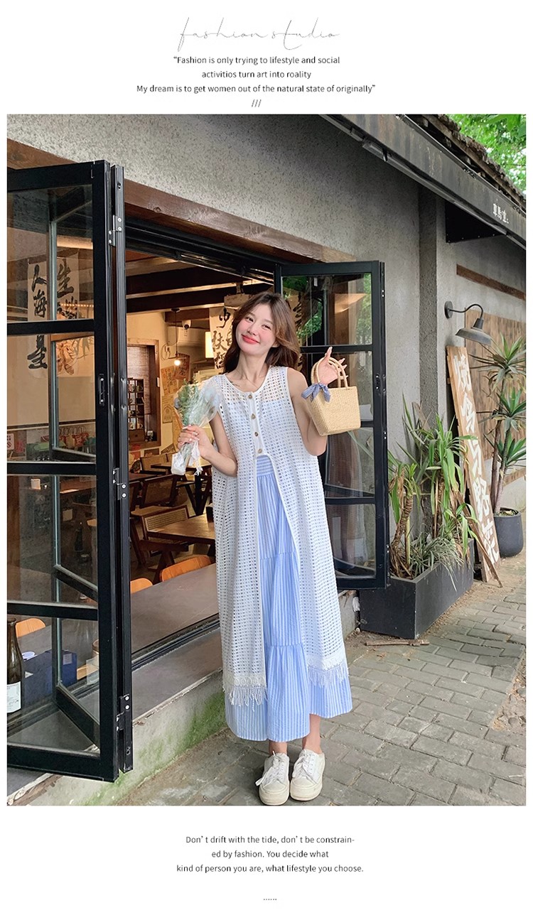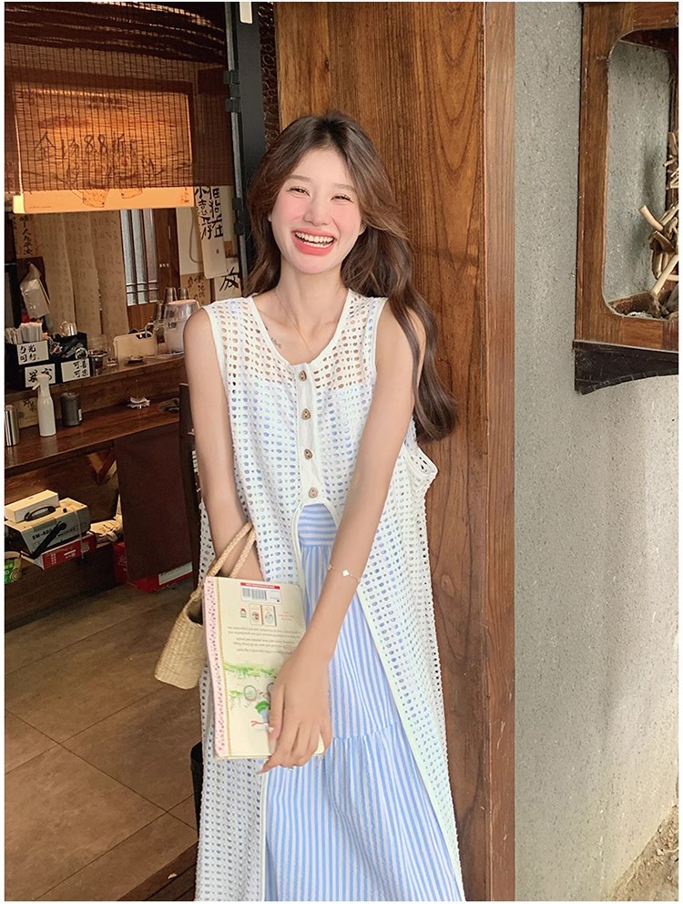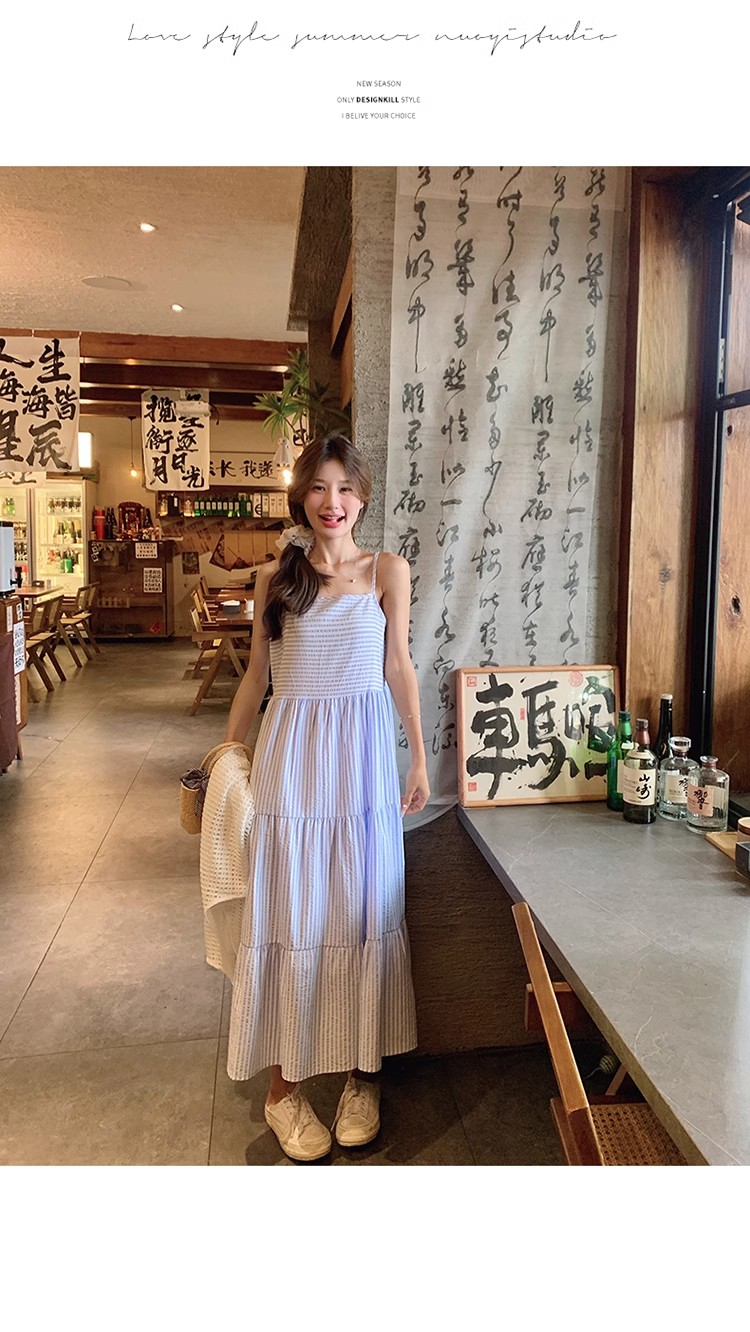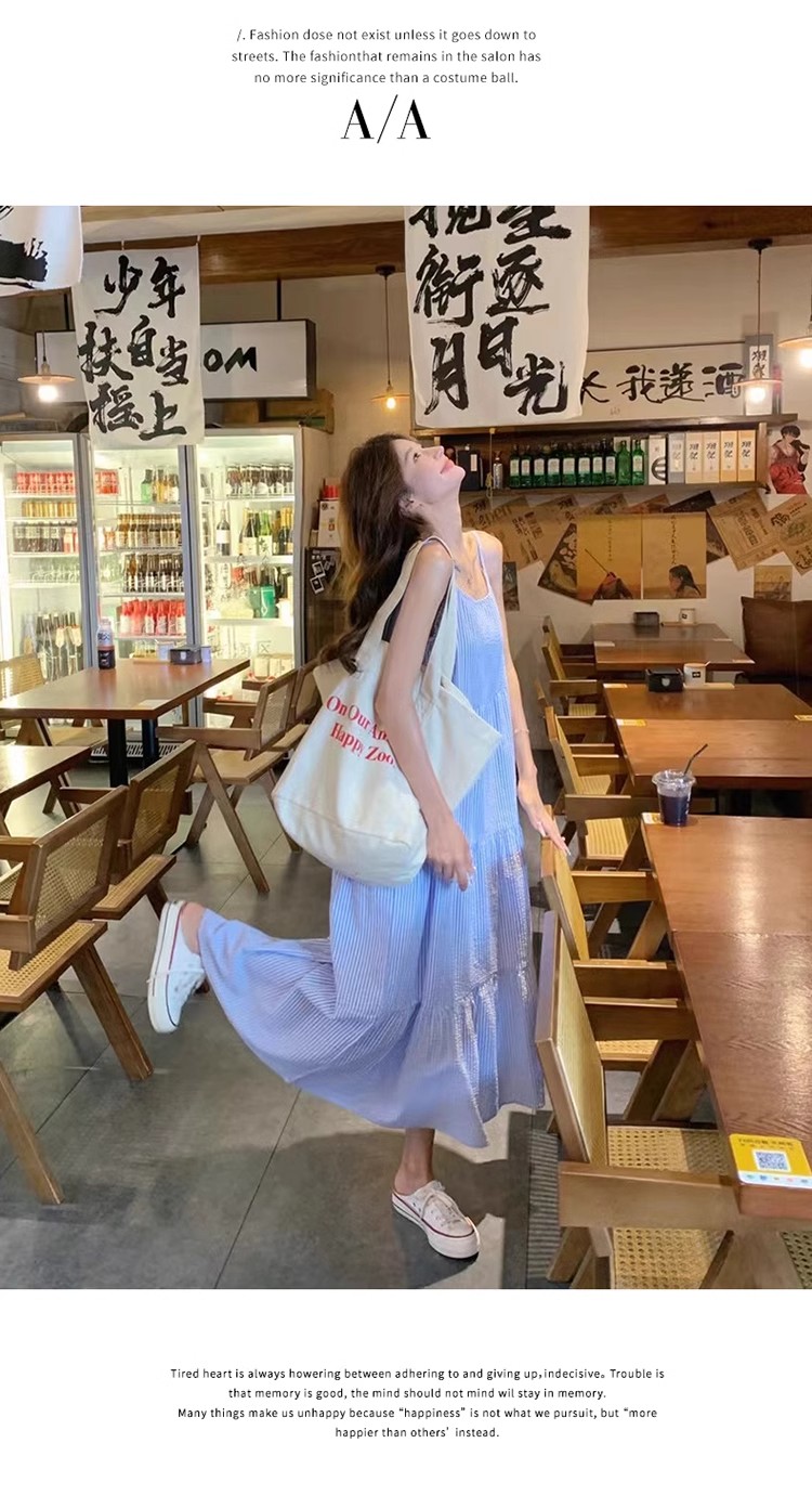 蓝色条纹吊带裙套装女夏2026新款超好看罩衫连衣裙夏季搭配一整套